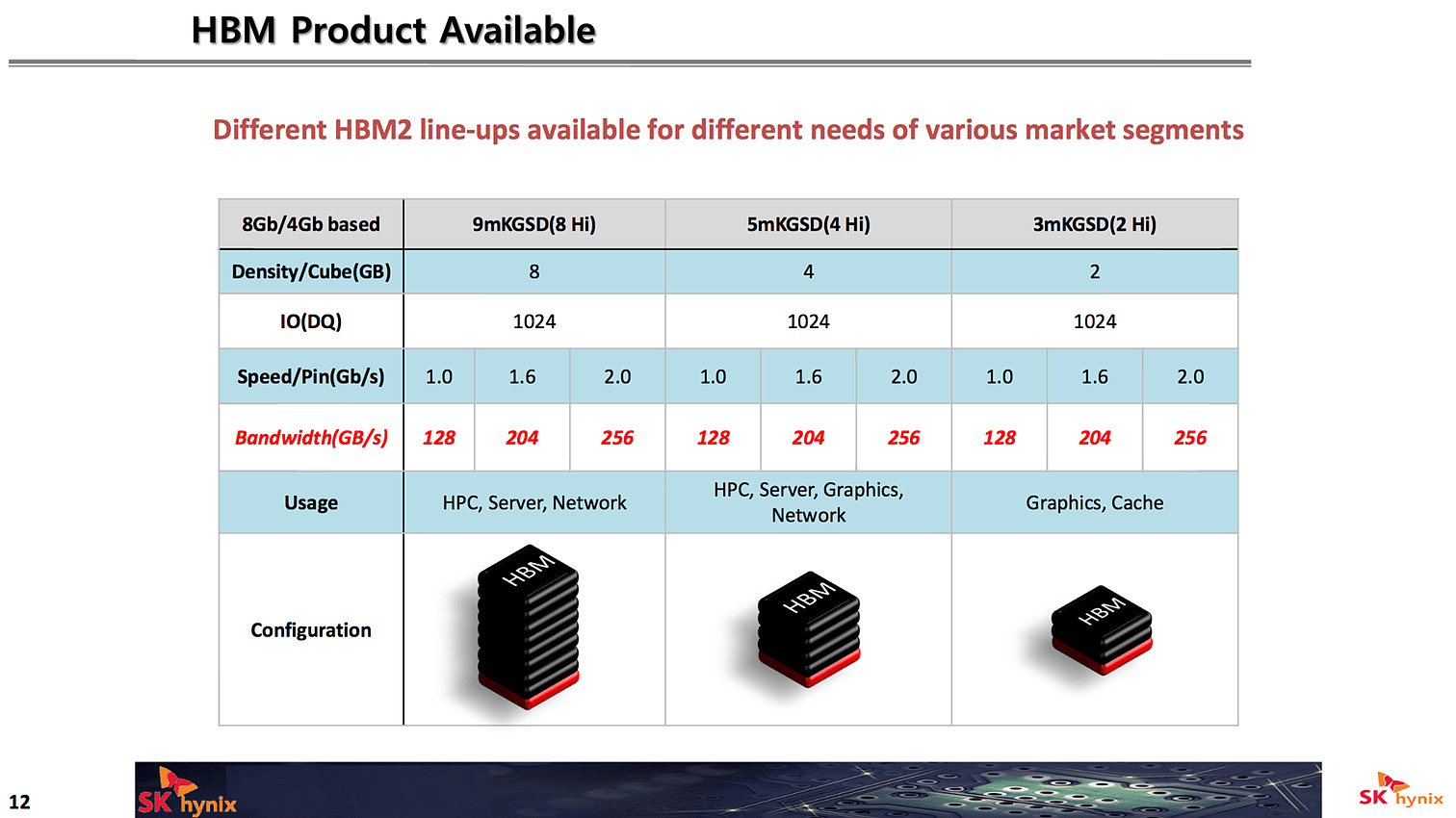 Les versions 2Hi et 8Hi devraient suivre (soit 2 Go et 8 Go), et l'on notera qu'en plus des versions proposant 256 Go/s et 204 Go/s de bande passante, une version 128 Go/s sera également disponible au catalogue dans les différentes capacités.