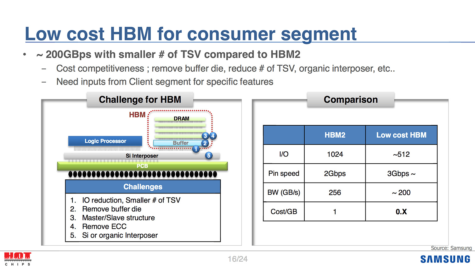 Côté Samsung, qui doit lancer aussi la HBM2 cette année, on parle surtout d'une version low cost de la HBM, qui ne serait pas de la HBM2 mais une variante plus abordable, en 512 bits (au lieu de 1024) et qui réduirait le nombre de TSV (Through Silicon Vias, les fils qui traversent les dies pour les relier les uns les autres). Le tout offrant tout de même 200 Go/s de bande passante. Un développement qui devrait s'effectuer en parallèle de celui de la HBM3 qui a pour objectif de doubler, sur le haut de gamme, la bande passante par rapport à la HBM2.