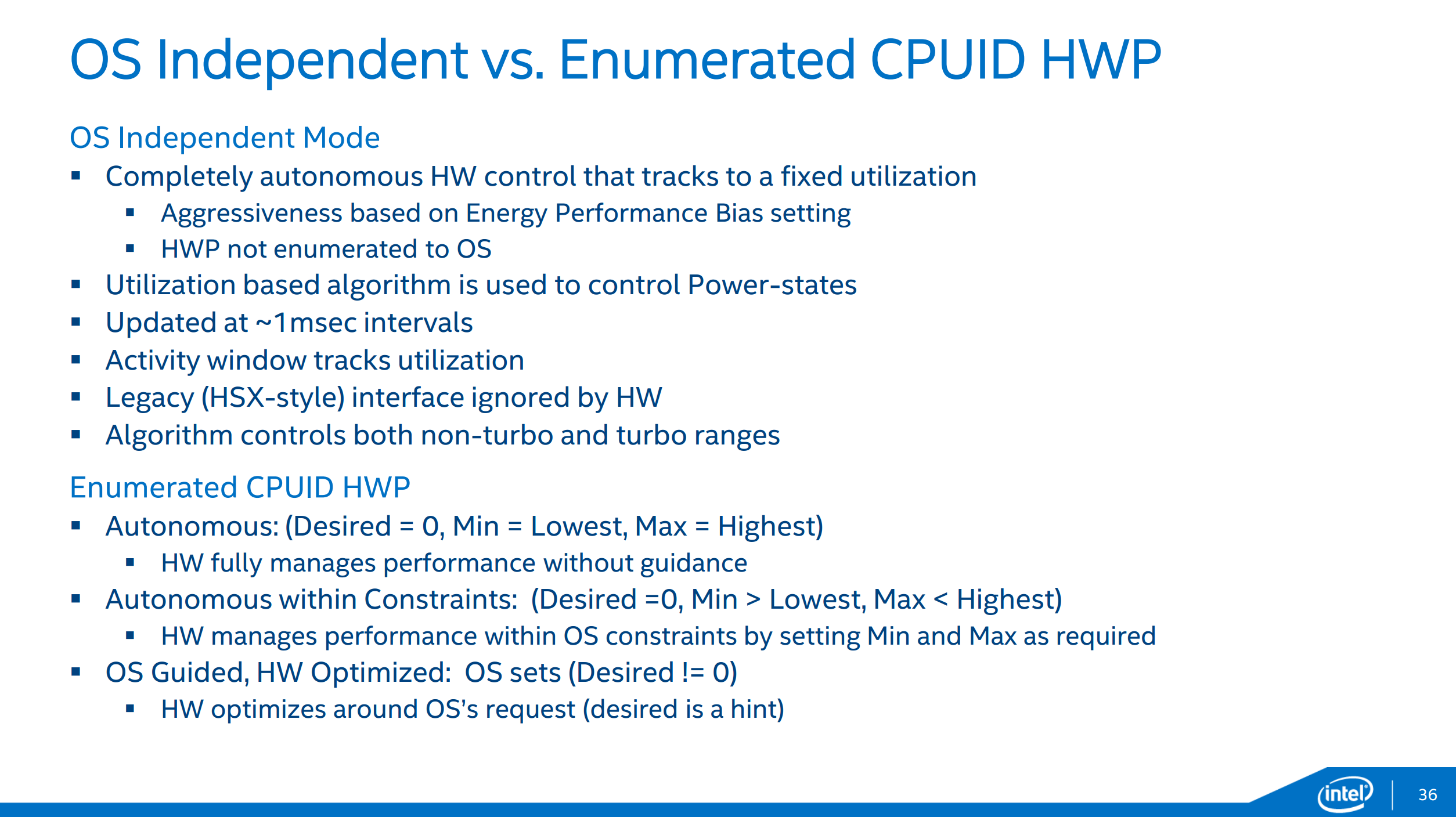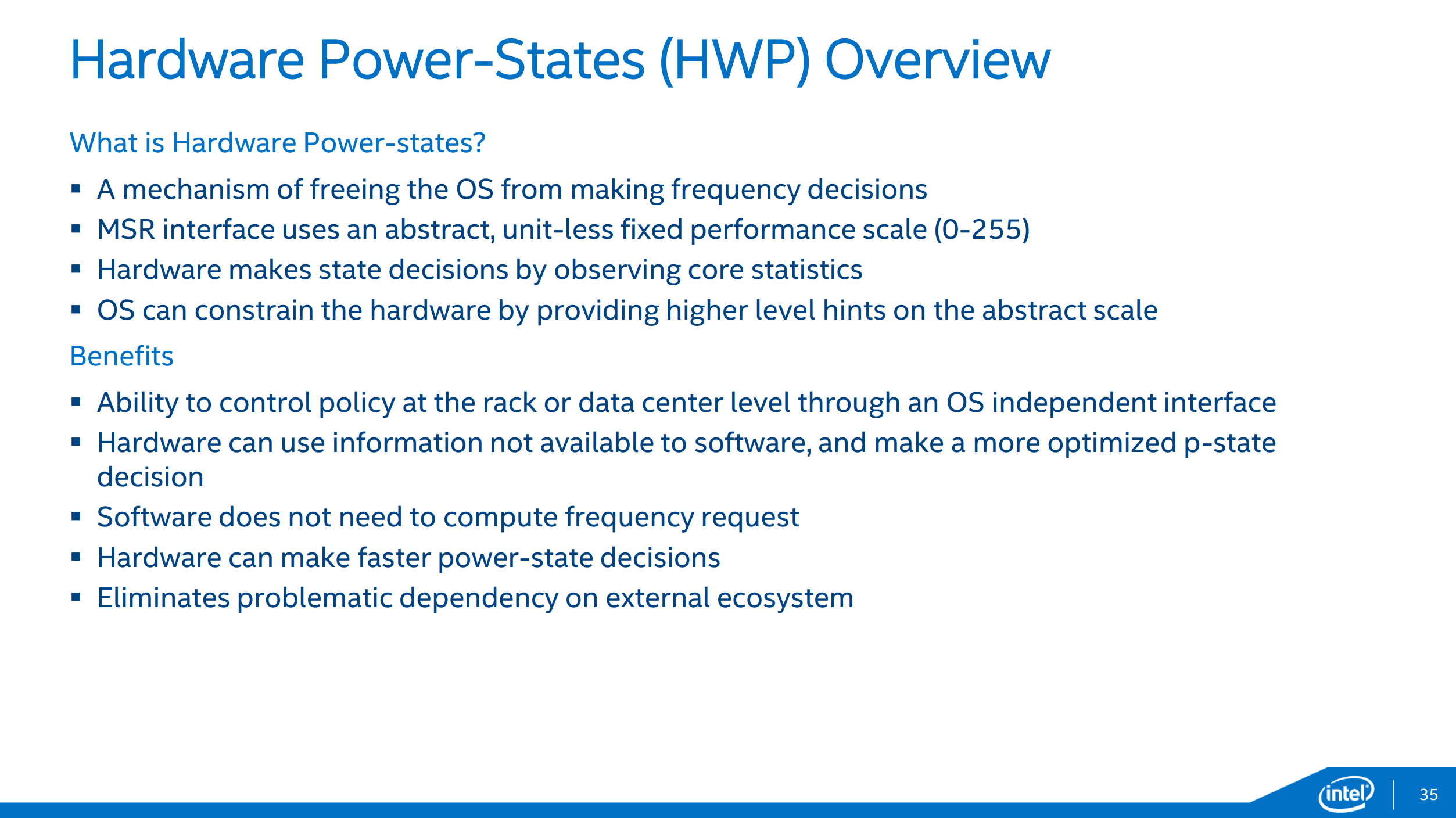 Intel intègre sur les Xeon D un nouveau mécanisme dénommé Hardware Power-States (HWP). Alors que c'est l'OS qui indiquait au processeur quel couple de fréquence/tension (P-State) utiliser, le processeur est désormais capable d'être autonome de ce côté ce qui sera d'après Intel plus efficace.