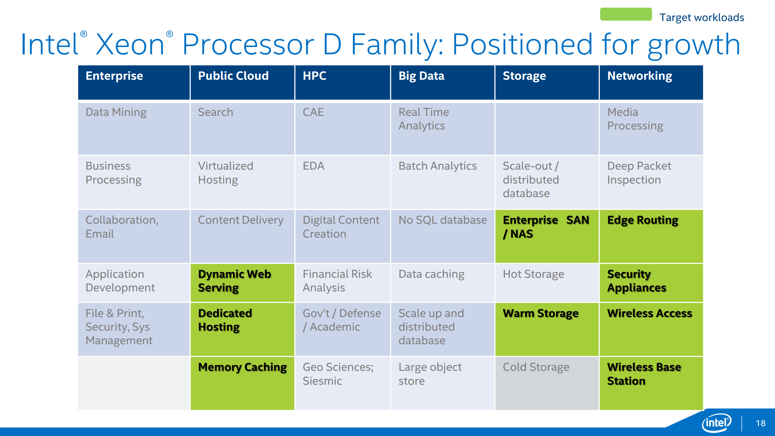 Des versions 6 et 8 cœurs avec des TDP de 35 à 45 watts sont prévues, ainsi que des déclinaisons 4 cœurs avec des TDP de 25 à 45 watts, 2 cœurs à 25 watts et moins. Les Xeon D devraient être lancés en version BGA et Socket au troisième trimestre, mais il est possible que la version la plus haut de gamme 8 cœurs et 45W débarque au second trimestre dans une version qui serait privé de certaines fonctionnalités réseaux d'après CPU-World , sans plus de précision.