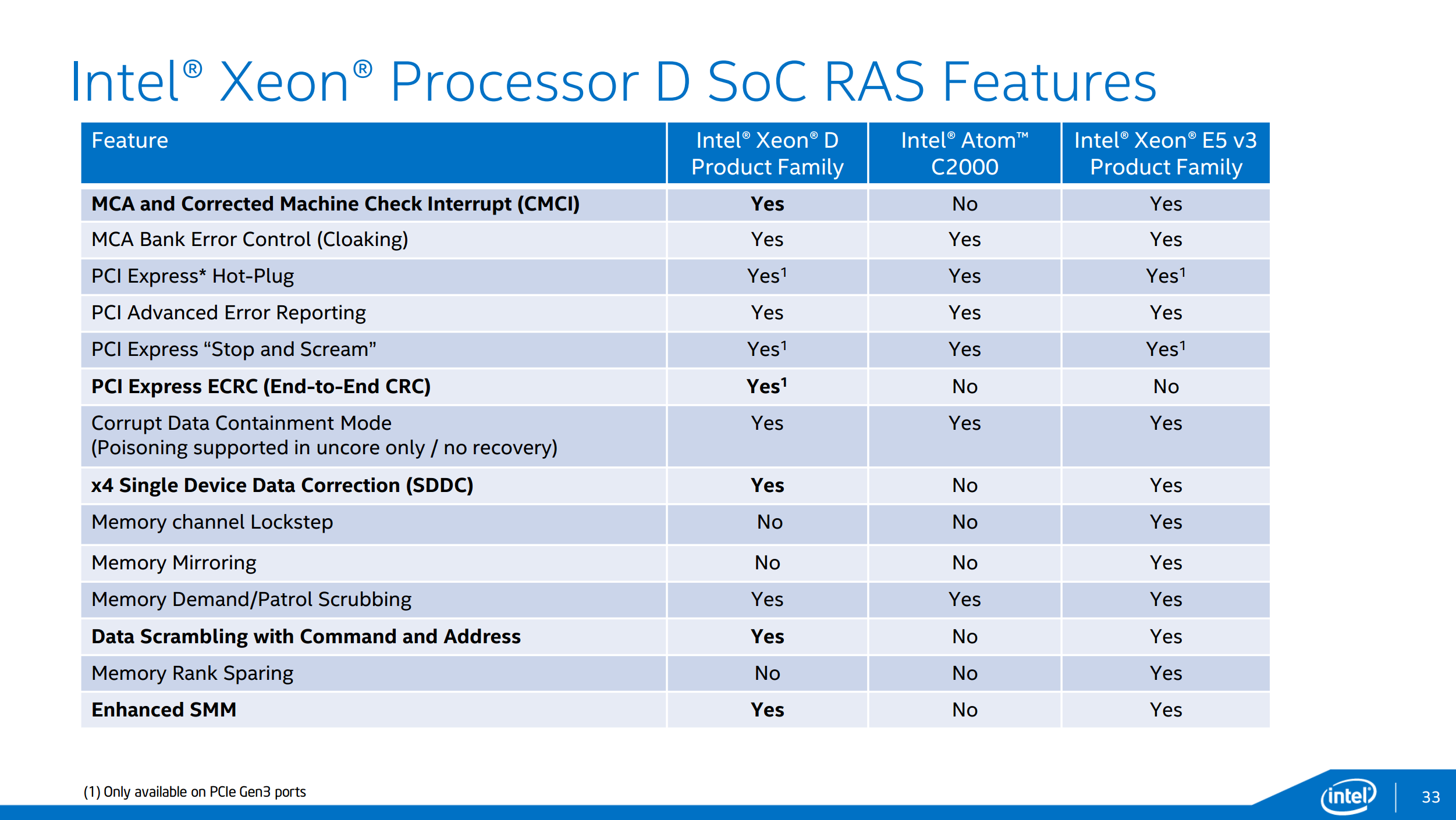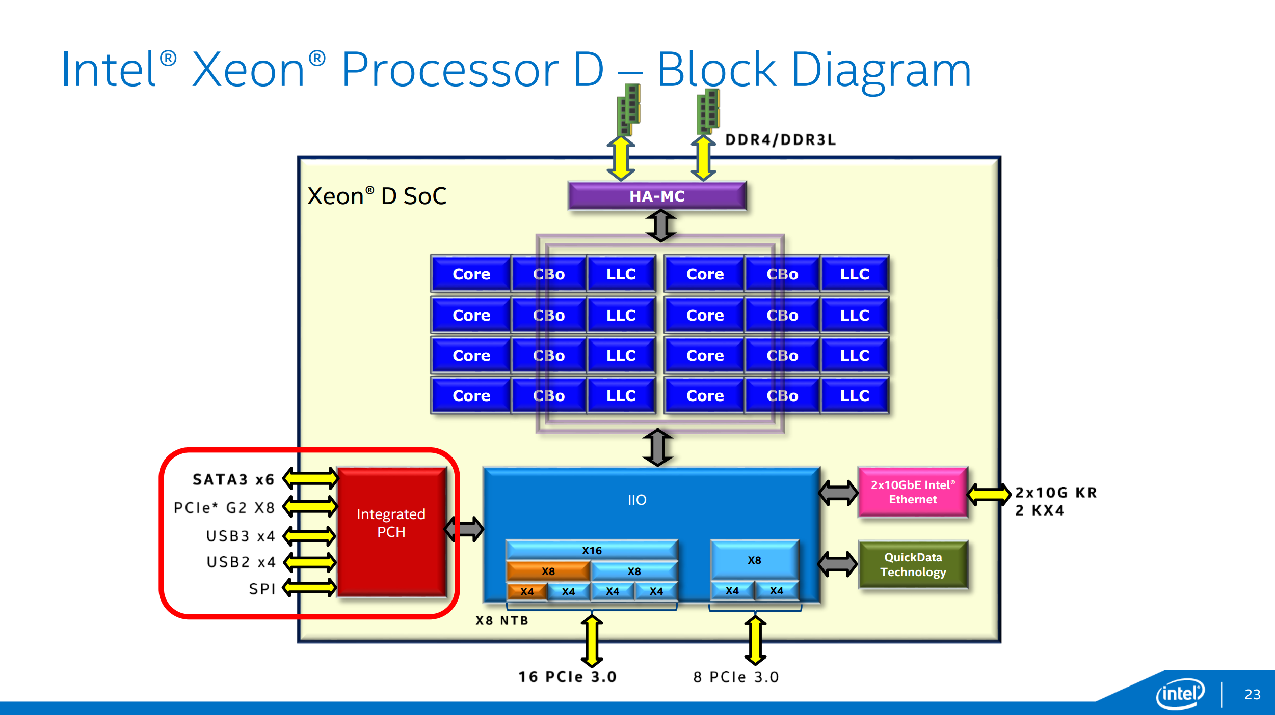 24 lignes PCIe Gen3 sont intégrées, un premier bloc de 16 peut être géré en 1x16, 2x8 ou 4x4, et un second bloc en 1x8 ou 2x4. Le PCH qui est donc intégré sur la même puce d'où la dénomination SoC, gère pour sa part 6 ports SATA 6 Gbps, 4 ports USB 3.0, 2 ports USB 2.0 ainsi que 8 lignes PCIe Gen2. On trouve également deux contrôleurs Ethernet 10 GbE sur la puce qui peuvent également fonctionner en 1 GbE ou 2.5 GbE, en comparaison des 4 contrôleurs 2.5/1 GbE intégrés dans un Atom C2750.