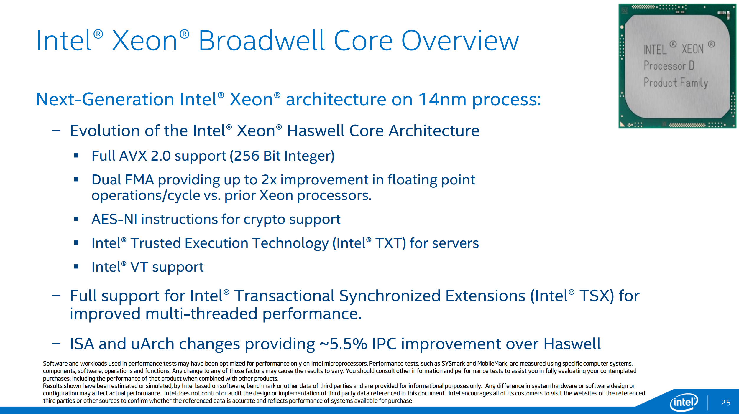 Côté technique Xeon D intègre de 2 à 8 cœurs Broadwell dotés comme d'habitude 256 Ko de cache L2, le cache de dernier niveau partagé étant pour sa part de 1,5 Mo par cœur soit 12 Mo dans le meilleur des cas. Les instructions TSX qui avaient fait leur apparition sur Haswell avant d'être désactivées suite à un bug sont cette fois de retour, et Intel annonce un gain d'IPC de 5,5% environ sur Broadwell.
