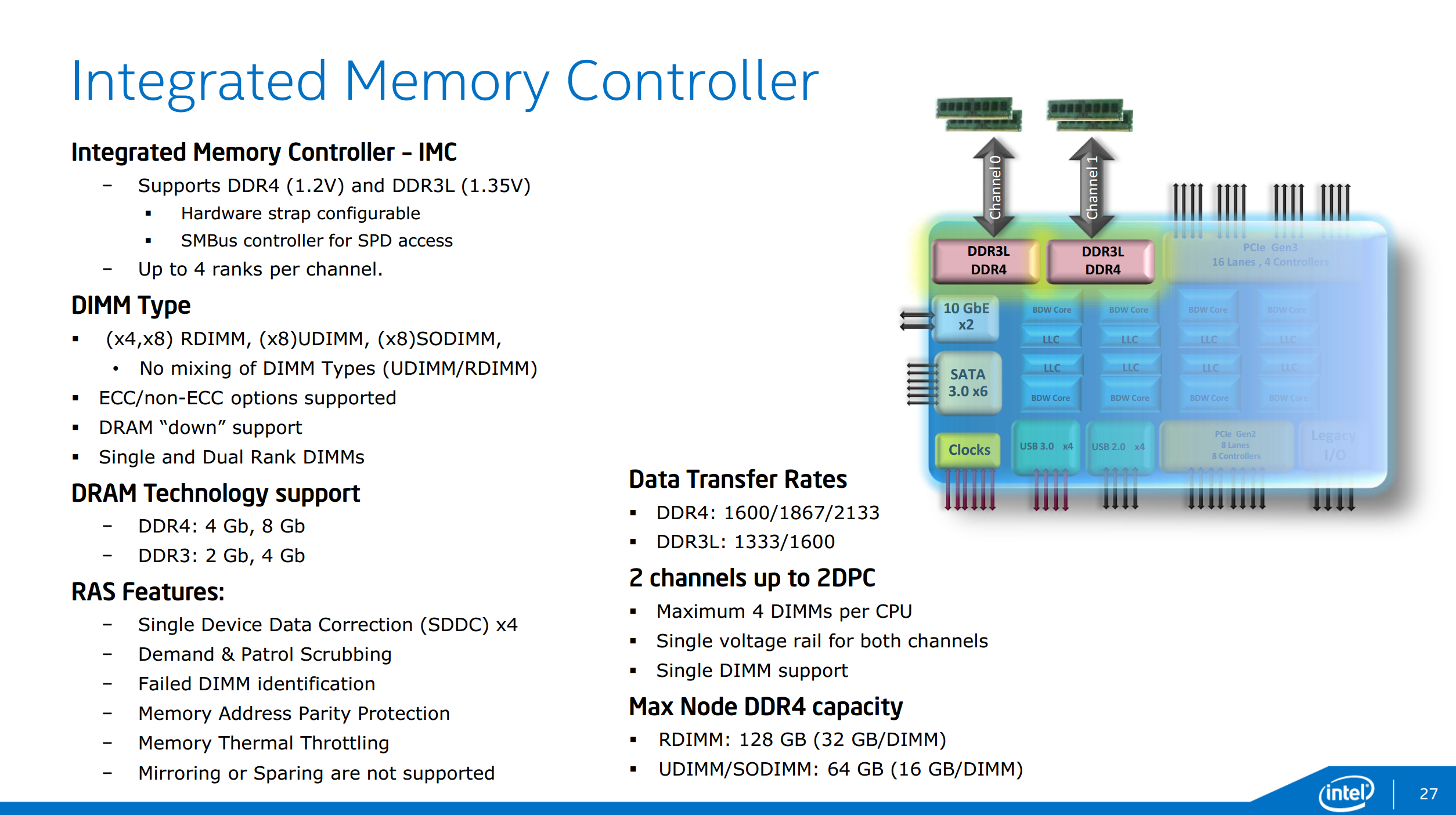 Deux canaux 64-bits sont intégrés pour la mémoire, ils peuvent adresser de la DDR4 1.2V ou de la DDR3L 1.35V et supportent la mémoire ECC ou non-ECC, Registered ou Unbuffered. On doit se limiter à 4 barrettes par CPU ce qui permet tout de même d'atteindre 128 Go avec des RDIMM ou 64 Go avec des UDIMM/SODIMM, attention toutefois pour se faire il faudra des barrettes de 16 Go faisant donc appel à des die de 8 Gb ce qui n'est supporté qu'en DDR4.