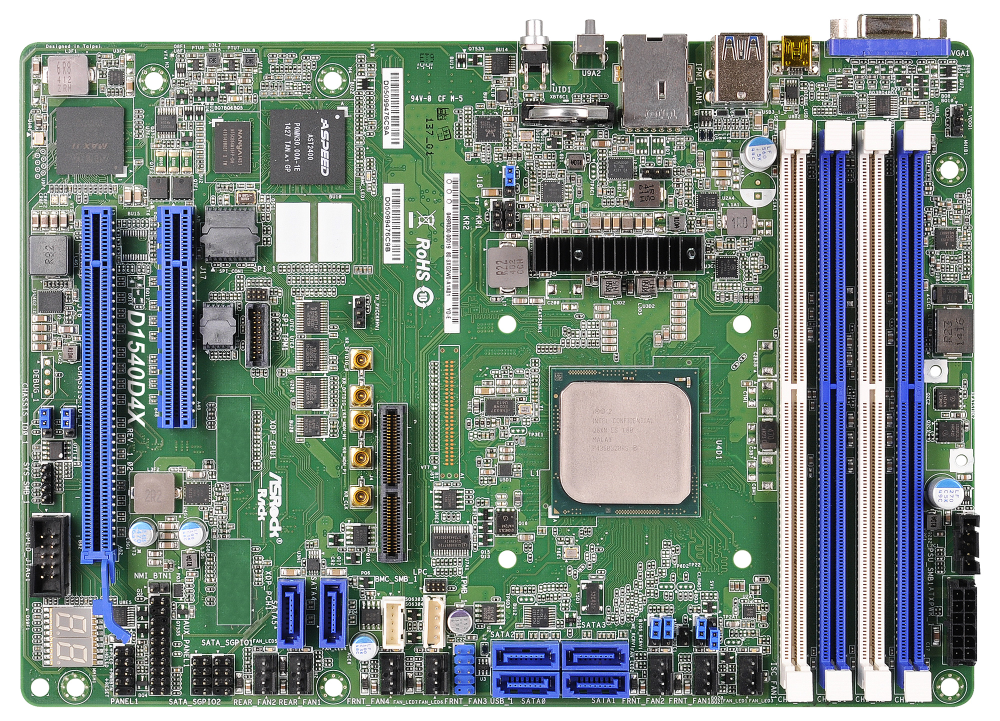 Logiquement les Xeon D viendront s'intercaler entre les SoC Atom et les Xeon E5 v3, reste à voir à quel point ils feront de l'ombre aux Xeon E3 v3 qui sont de "simples" Haswell LGA 1150 avec support de l'ECC. Avec un tarif de 199$ pour le D-1520 et 581$ pour le D-1540, ils sont en tout cas positionnés de manière assez agressive puisque moins onéreux que les Xeon E3/E5 4 et 8 cœurs qui ne sont pas des SoC et nécessitent donc des puces additionnelles. Intel destine les premiers Xeon D aux data center et plus particulièrement au cloud, mais des versions plus spécifiquement destinées au réseau sont prévues pour le second semestre. Dernière précision, comme vous pouvez le voir sur cette ASRock Rack D1540D4X, ces Xeon D sont au format BGA et pas LGA, ils sont donc soudés sur la carte mère. La seconde carte mère est une SuperMicro X10SDV-TLN4F, dotée d'un D-1540 elle sera à environ 900$.