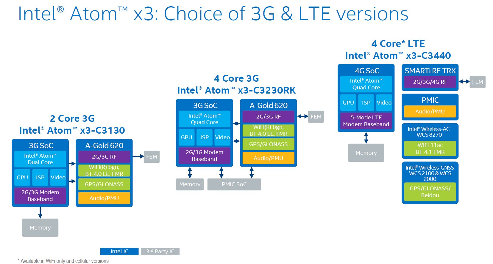A noter que le x3-C3230RK n'est pas un produit mis au point directement par Intel mais par le chinois Rockchip suite à un accord annoncé avec Intel en mai 2014. Cette puce devrait être réservée au marché chinois. ASUS et Jolla serait entre autres sur les rangs pour fournir des smartphone à base d'Atom x3.