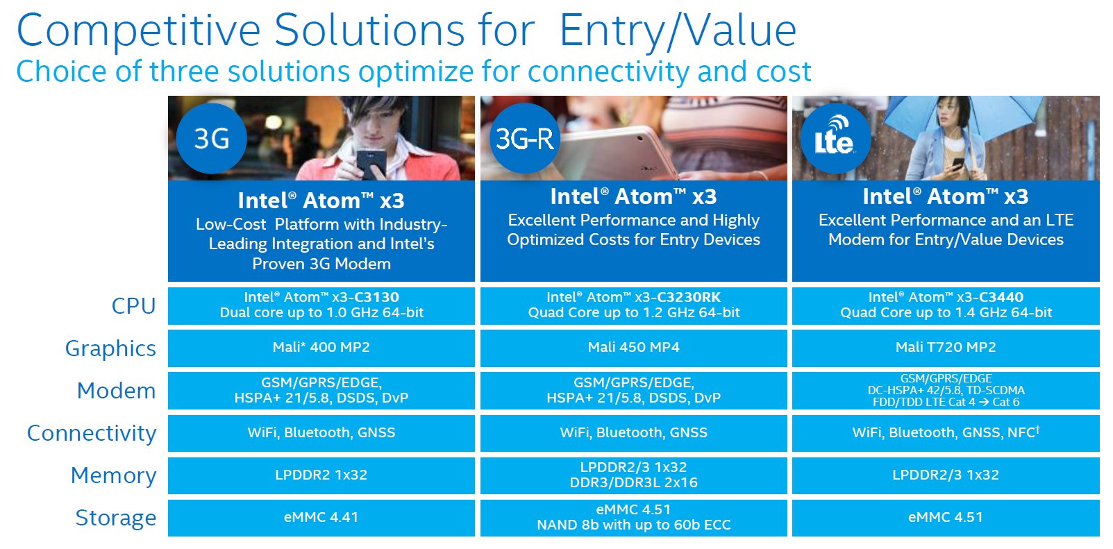Intel profite du MCW2015 pour annoncer ses nouveaux SoC Atom x3, x5 et x7. La gamme Atom x3 utilise un SoC du nom de code de SoFIA qui est gravé en 28nm par un fondeur tiers, probablement TSMC, Intel ayant choisi pour ce premier SoC avec modem intégré de faire appel à une fonderie externe. Trois versions sont annoncées :