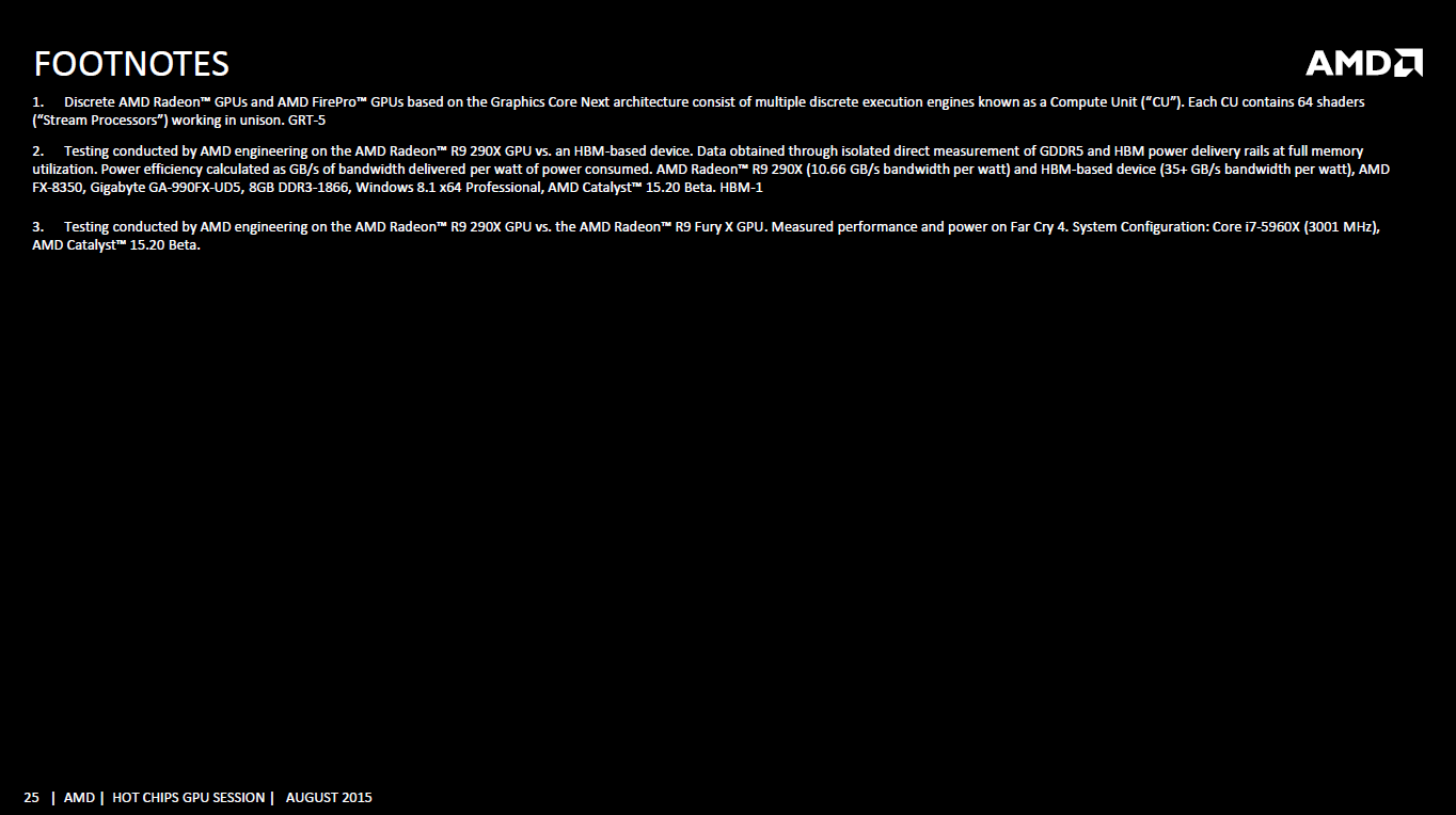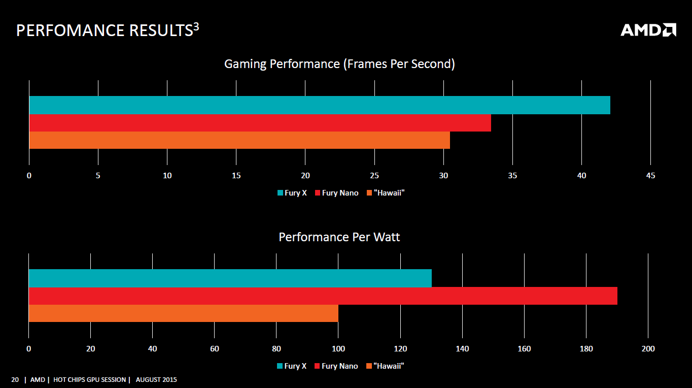 Alors que la R9 Nano devrait être annoncée cette semaine, avec une disponibilité prévue pour début septembre, AMD a déjà donné quelques indications sur les performances pratiques de la carte lors de la conférence Hot Chips. Pour rappel, la R9 Nano est une carte compacte (15cm de long) basée sur un GPU Fiji dont la fréquence est réduite afin de profiter d'une meilleure efficacité énergétique.