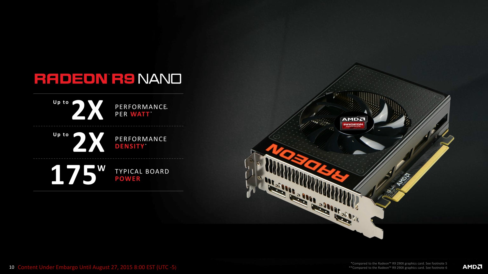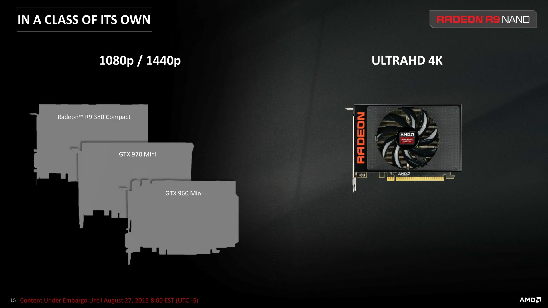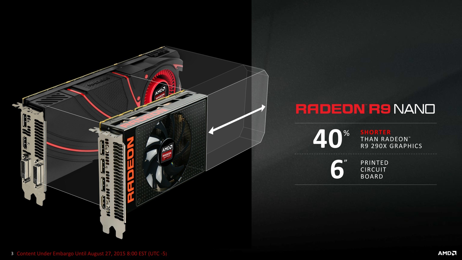 A noter qu'il ne s'agit aujourd'hui que d'une annonce, la disponibilité et les premiers tests étant prévus pour le 10 septembre. AMD estime que cette Radeon R9 Nano a autant de valeur qu'une Radeon R9 Fury X et la proposera au même tarif de 649$ soit un peu plus de 700€ en France. AMD ne recherche donc clairement pas à proposer une carte au rapport performances/prix intéressant mais essaye plutôt de créer de la valeur d'une autre manière, ce qui est loin d'être insensé. Reste à voir si une telle carte graphique pourra trouver son public et se démarquer suffisamment des solutions concurrentes qui visent également les plateformes mini-ITX, telles que les GeForce GTX 970 compactes proposées pour un tarif presque deux fois moindre.