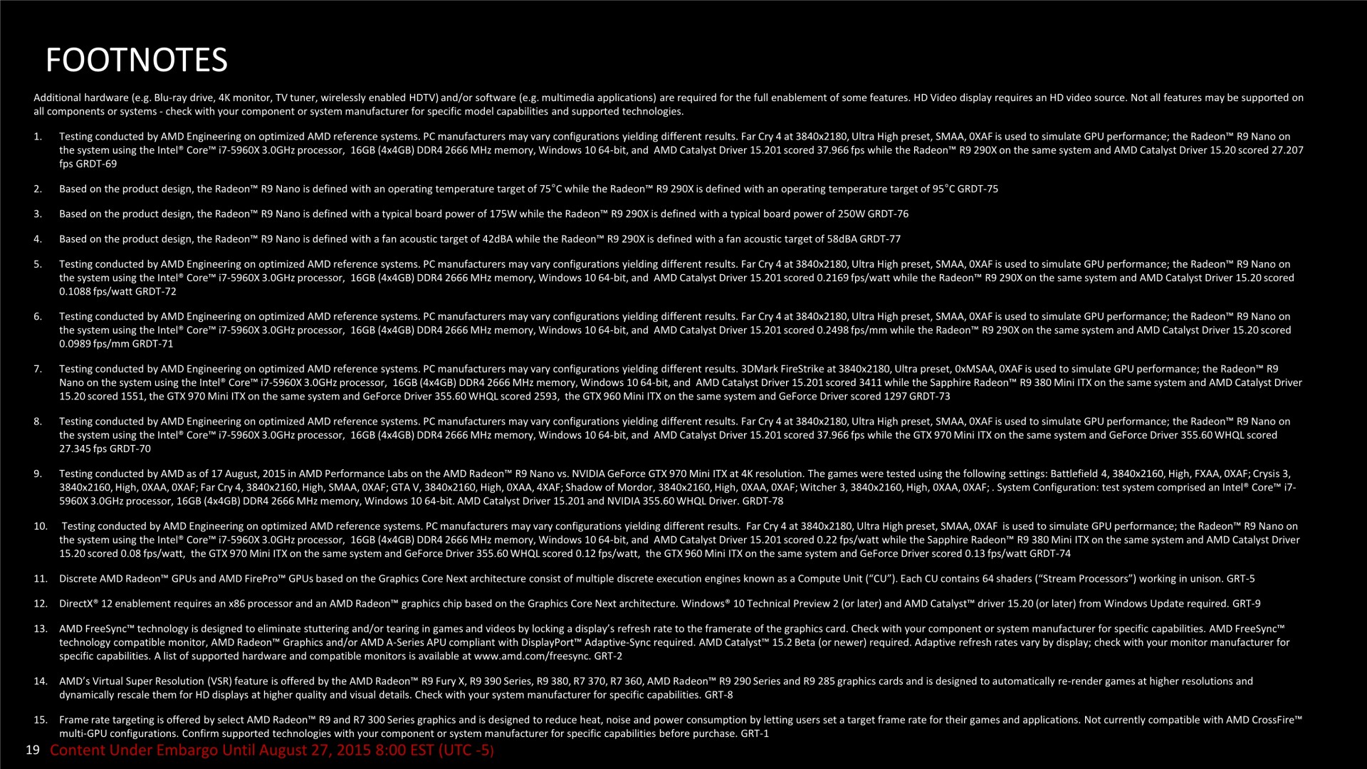 AMD parle d'une fréquence GPU se situant en général entre 850 et 950 MHz. De quoi nous donner des performances qui se situeraient entre 80 et 90% de celles d'une R9 Fury X, soit proches d'une R9 Fury, pour une consommation nettement moindre. Des affirmations qui demandent évidemment à être vérifiées à travers des tests rigoureux.