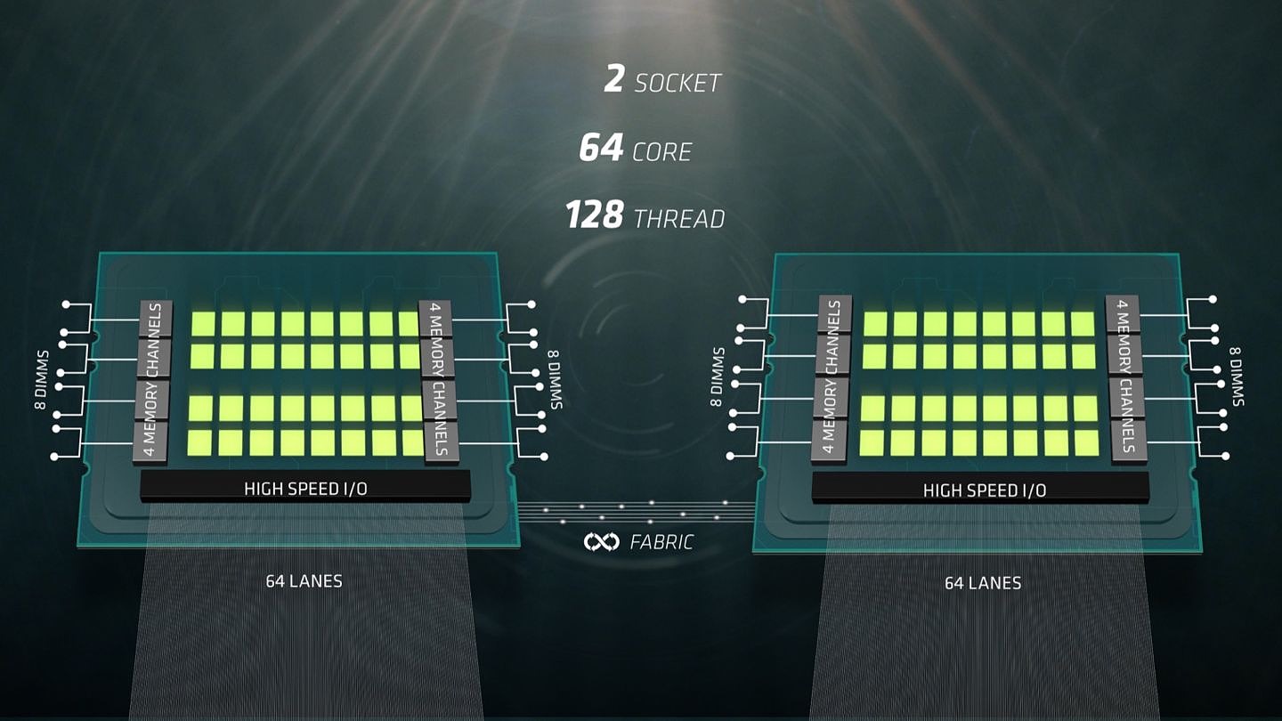 Chaque EPYC prend place au sein de l'énorme Socket LGA SP3r2 à 4094 contacts, et sous l'IHS on trouve 4 dies Zeppelin déjà utilisés pour Ryzen. Chacun de ses die est interconnecté aux 3 autres via des liens Infinity Fabric offrant une bande passante de 21 Go/s dans chaque sens. La connexion entre les Socket utilise 64 des 128 lignes PCIe qui sont alors utilisées en mode Infinity Fabric, les 4 liens atteignent une bande passante cumulée de 76 Go/s dans chaque sens, au-dessus des 64 Go/s permis en PCIe Gen3.