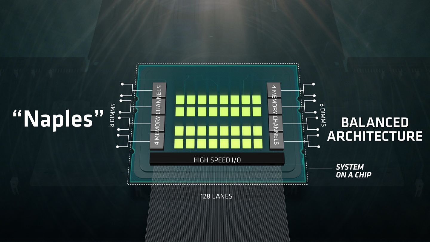 AMD a également confirmé que chacun des processeurs intègre 128 lignes PCI-Express Gen3. Dans le cadre d'une configuration à deux Socket, 64 de ces lignes sont utilisées pour l'interconnexion qu'AMD appelle Infinity Fabric. Ce n'est pas confirmé officiellement mais a priori chaque Naples utilisera jusqu'à 4 die "Zeppelin" (le même que Ryzen) interconnectés au sein du packaging.