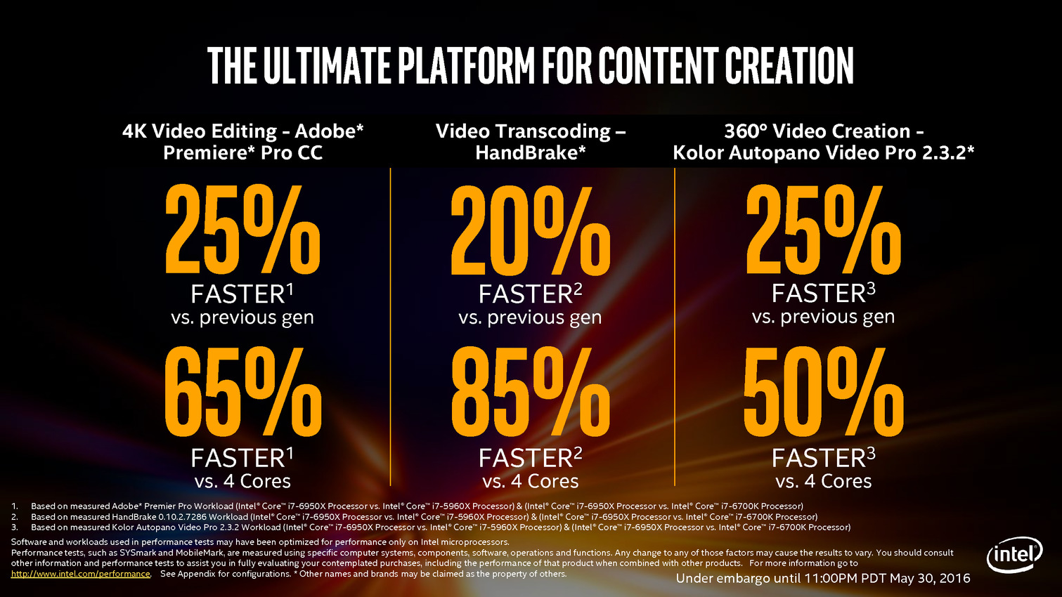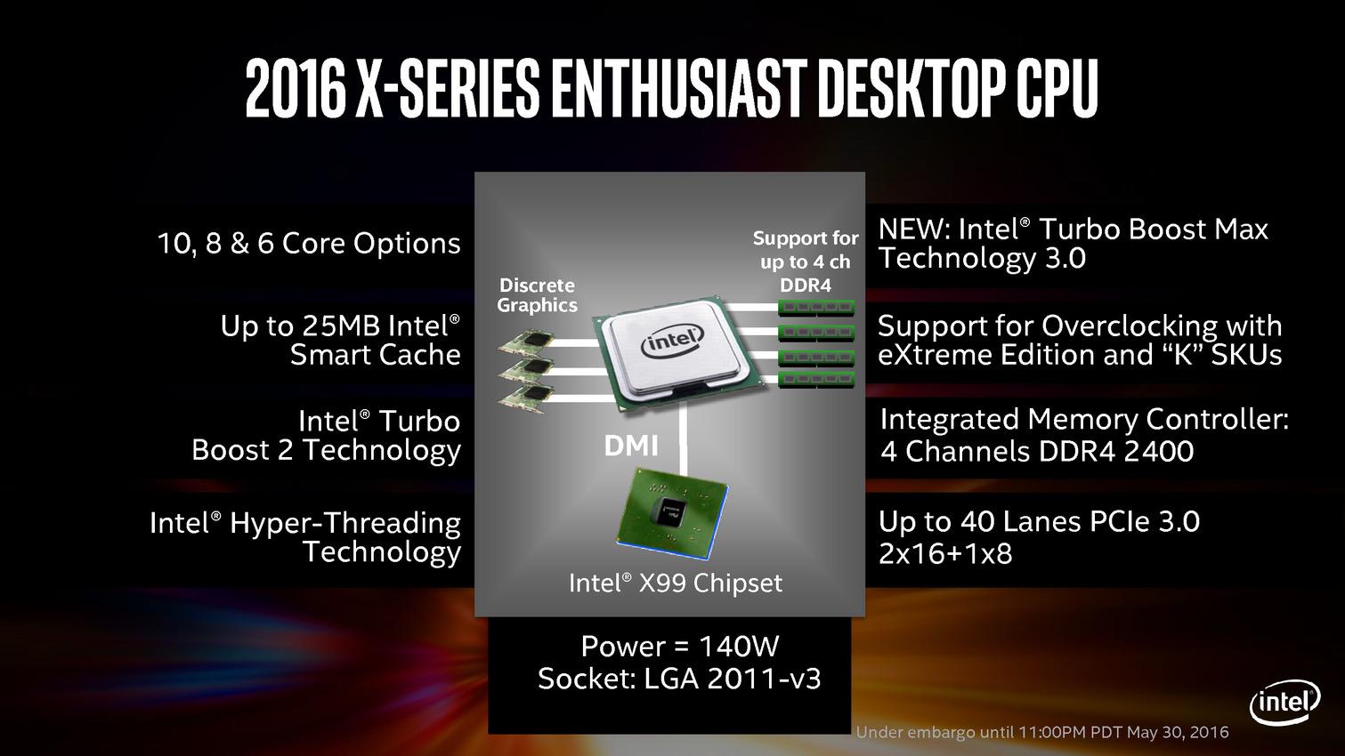 C'est aujourd'hui qu'Intel lance officiellement ses processeurs Core i7 LGA-2011 v3 Broadwell-E. Ils succèdent aux Haswell-E (i7-5960X et consorts) lancés en août 2014 et partagent la même infrastructure - une mise à jour de bios permettant de rendre les cartes mères X99 Express compatibles.
