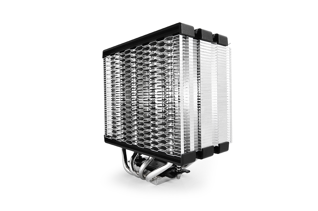 Le ventirad H7 sera quant à lui -contrairement à ce que son nom pourrait laisser penser- une variante plus petite du H5 (145mm de hauteur seulement). Équipé d'un ventilateur 120mm d'épaisseur standard (25mm), il perd un heatpipe (qui ne seront plus qu'au nombre de 3 donc) mais conserve le design des ailettes en nid d'abeilles du H7.