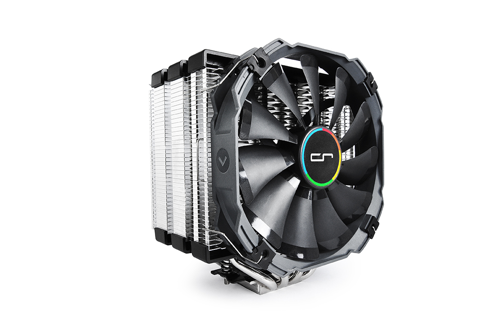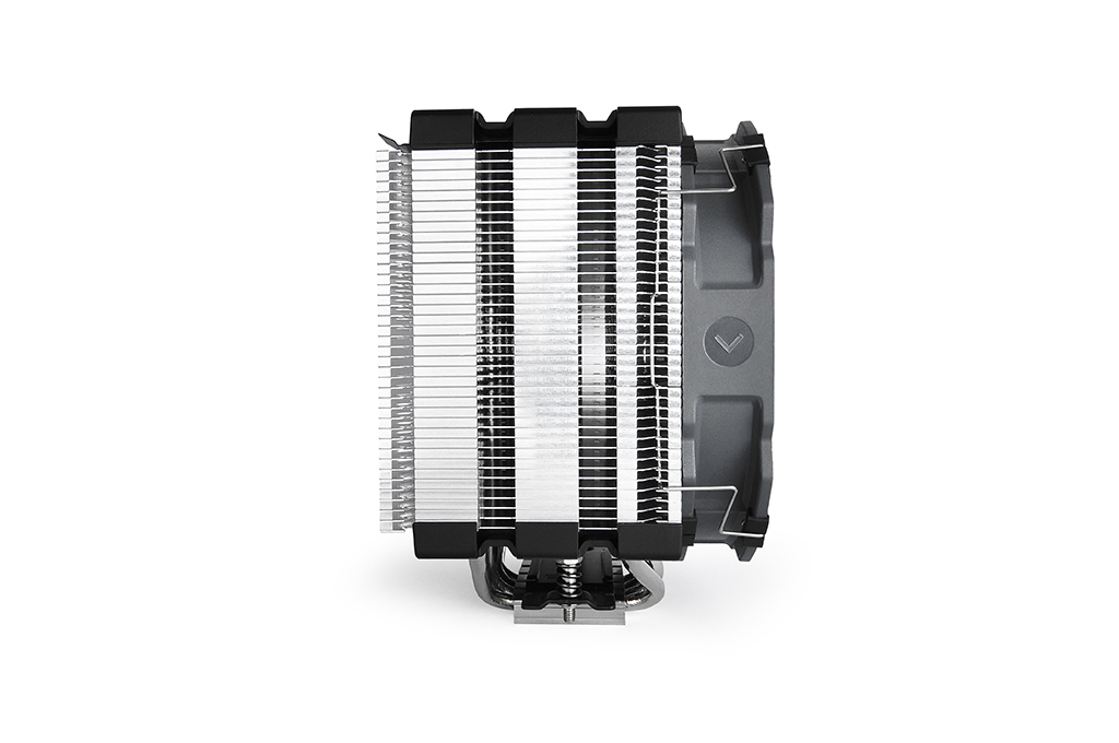 Avec ses dimensions de 160x143x98mm (HxLxP), le H5 utilise 4 heatpipes et conserve une surface de dissipation importante (d'après Cryorig, 90% de la surface de dissipation du ventirad haut de gamme R1 de la marque), mais n'empiètera pas sur les emplacements mémoire, que ce soit sur plate-forme AMD ou Intel, grâce à son design asymétrique et à un ventilateur 140mm slim de 13mm d'épaisseur (le XF140 déjà connu, qui équipe par exemple le ventirad R1 Universal). Il est intéressant au passage de remarquer -bien que cela ne soit qu'anecdotique- le positionnement des heatpipes par rapport à la base, ceux-ci la traversant perpendiculairement par rapport aux barrettes mémoire (et non pas parallèlement, qui est la configuration la plus souvent rencontrée).