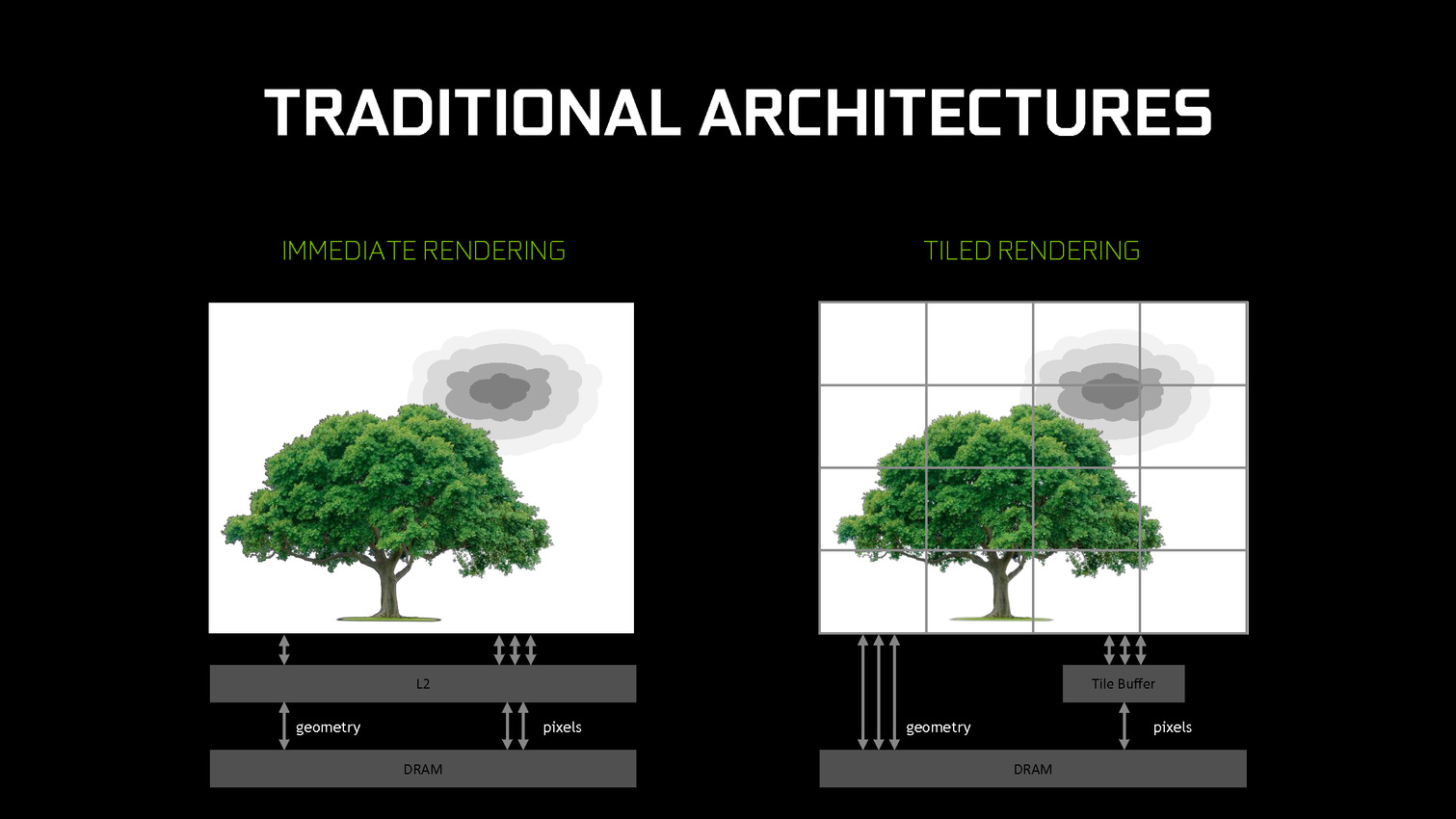 Traditionnellement, les GPU d'AMD et de Nvidia fonctionnent suivant le principe du rendu immédiat. Un triangle est pris en charge, il est découpé en pixels, les pixels sont écrits en mémoire. Si un second triangle traité par la suite se trouve entre le premier et la caméra, des pixels auront inutilement été calculés et écrits en mémoire. Différentes approches sont utilisées pour éviter ce gaspillage de ressources, mais il reste en partie présent.