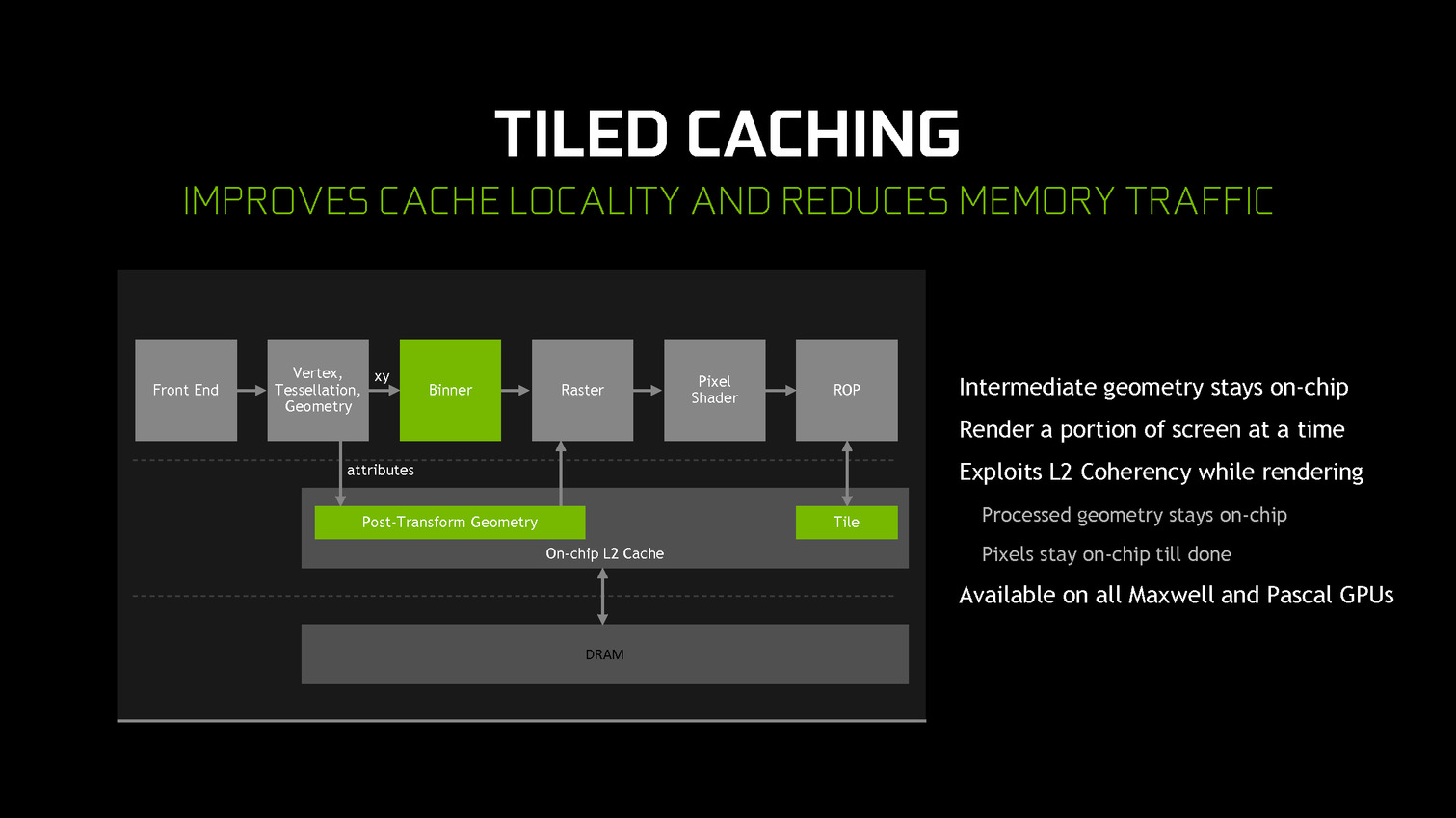 En parallèle de la GDC et lors de la présentation à la presse de la GeForce GTX 1080 Ti, Nvidia a communiqué officiellement pour la première fois au sujet d'une optimisation introduite depuis les GPU Maxwell : le Tile Caching.