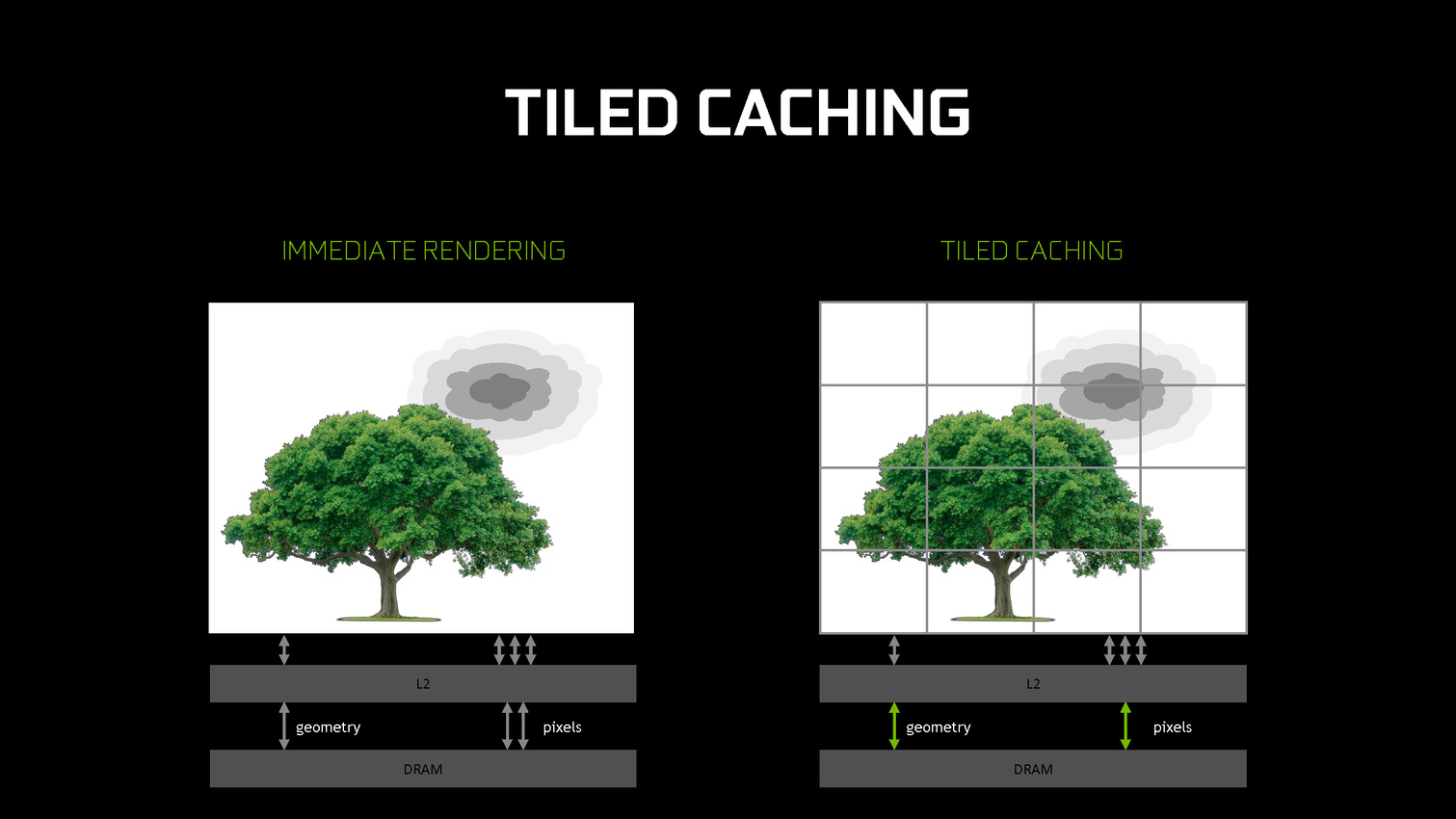 Nvidia nous précise qu'aucun cache spécifique n'a été implémenté et que c'est le cache L2 qui est exploité. C'est la raison pour laquelle il a fait un bond énorme en taille à partir des GPU Maxwell (1 voire 2 Mo par 128-bit de bus contre 256 Ko sur Kepler). Un système d'optimisation automatique à base d'heuristiques a été mis en place pour opter pour la taille la plus adaptée au niveau du buffer de triangle et des tiles, mais Nvidia peut configurer tout cela manuellement pour chaque jeu ou débrayer le Tile Caching s'il est contreproductif.