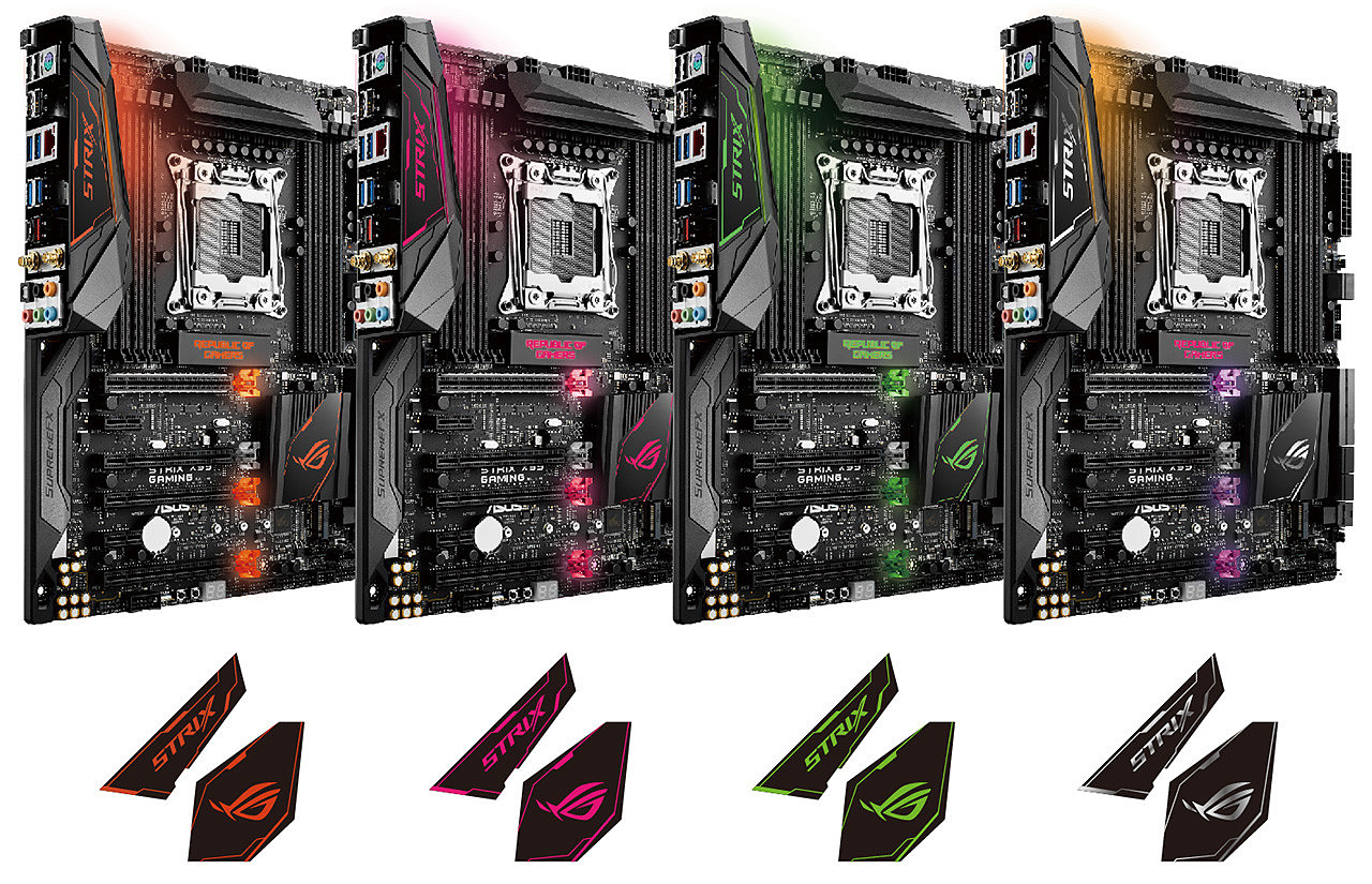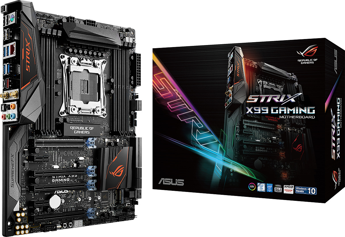 Elle se distingue comme la Deluxe de part un support natif du Wi-FI 802.11ac, mais en y ajoutant le MU-MIMO. L'éclairage LED personnalisable et synchronisable avec un éclairage externe AURA, supporté par toutes ces cartes, est plus poussé sur cette version avec de multiples LED sur la carte. C'est également la Gaming Strix qui dispose de l'intégration du codec audio la plus avancée, dénommée SupremeFX chez ASUS au lieu de Crystal Sound 3 sur les autres cartes. Côté réseau par contre on reste sur de l'Intel I218-V sur toutes les cartes, associé à un second port Gigabit géré par un Intel I211-AT sur les carte Deluxe. A l'instar de la X99-A sur la gamme précédente, sur cette gamme la X99-E a notre préférence, elle dispose déjà des fonctionnalités couvrant 99,9% des besoins. A noter qu'une nouvelle Rampage V Edition 10 devrait arriver un peu plus tard.