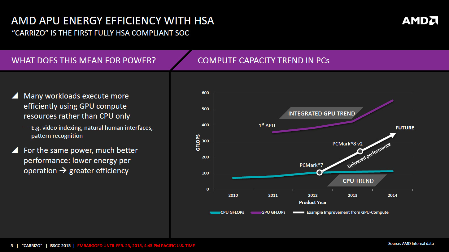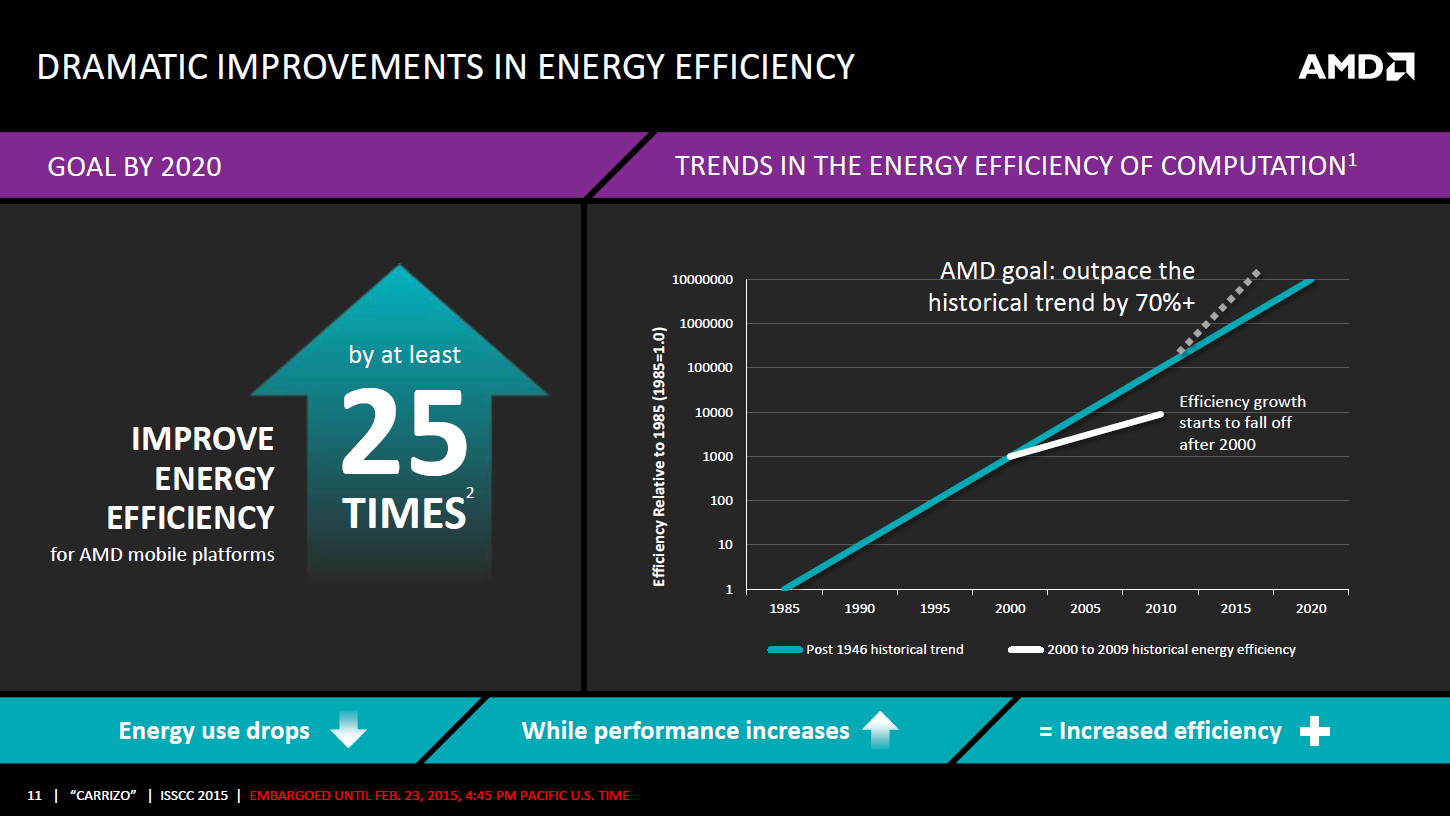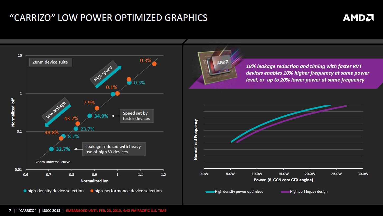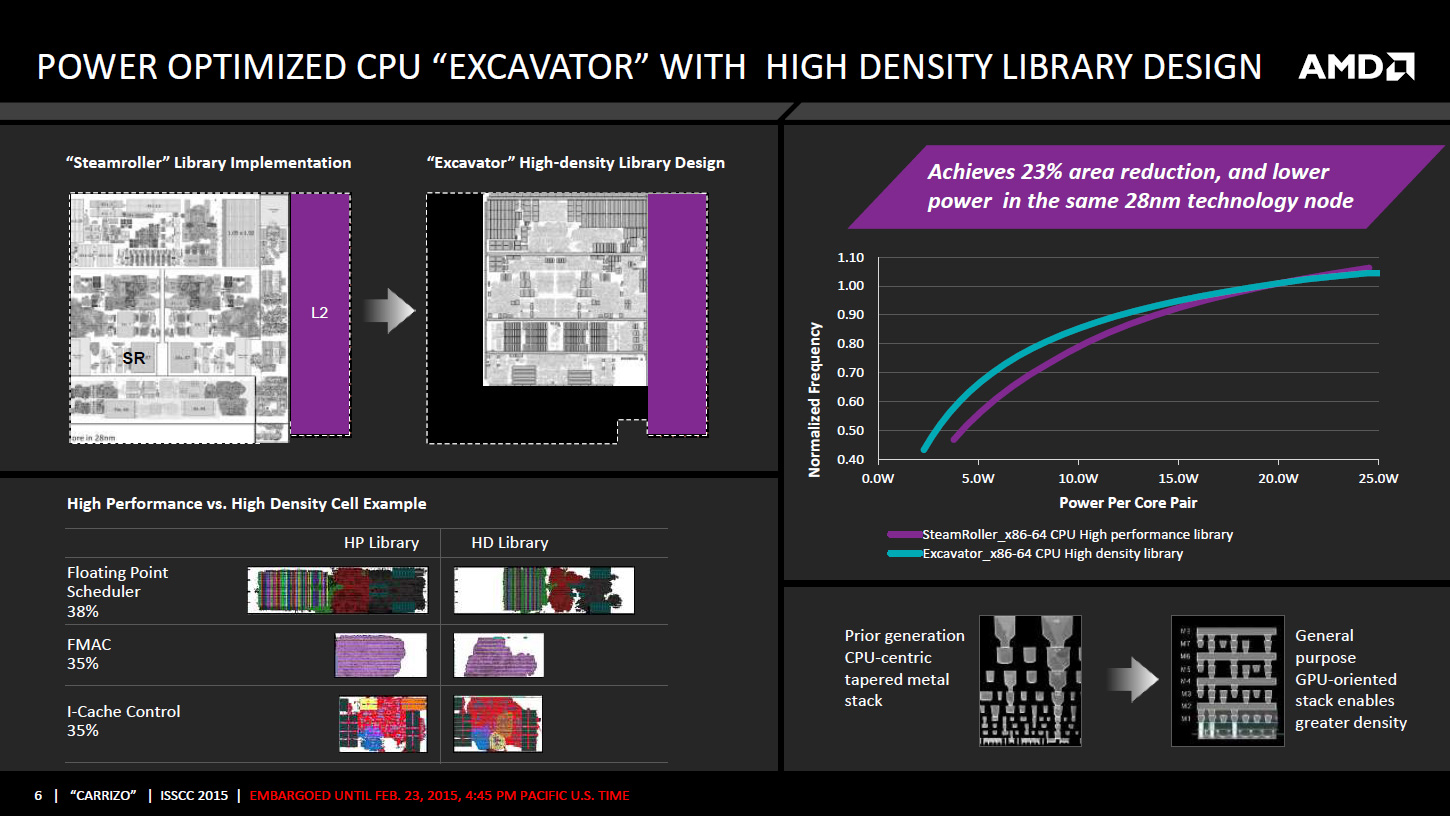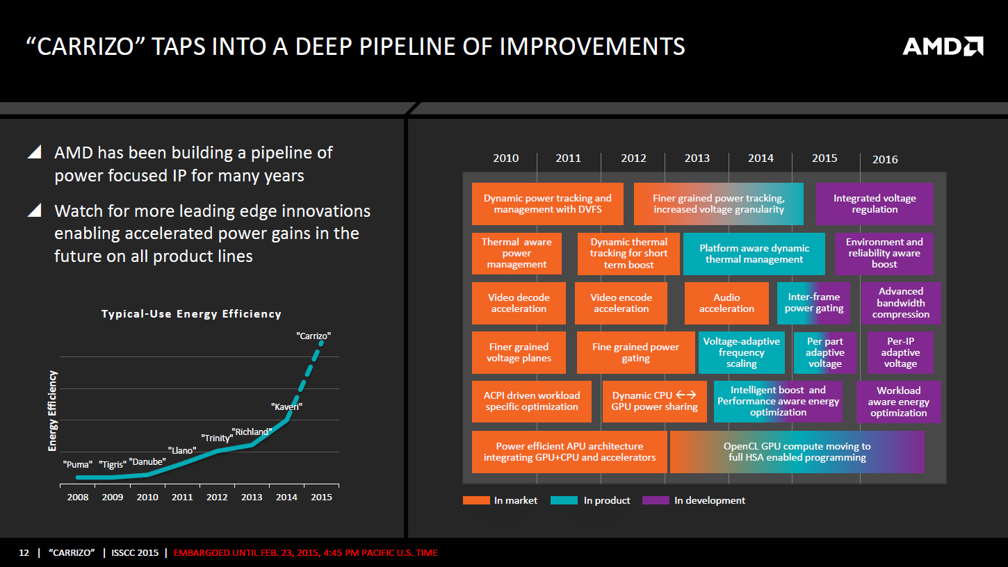 AMD dévoile de nombreux détails sur son APU Carrizo à l'occasion de l'ISSCC 2015, une conférence annuelle dédiée aux circuits intégrés se déroulant à San Francisco cette semaine. Pour rappel, les grandes lignes des informations dévoilées ici avaient déjà fuité en novembre dernier. Une partie des informations de la présentation est contenue dans la présentation AMD ci-jointe, d'autres détails sont exclusifs à la présentation faite lors de l'ISSCC.
