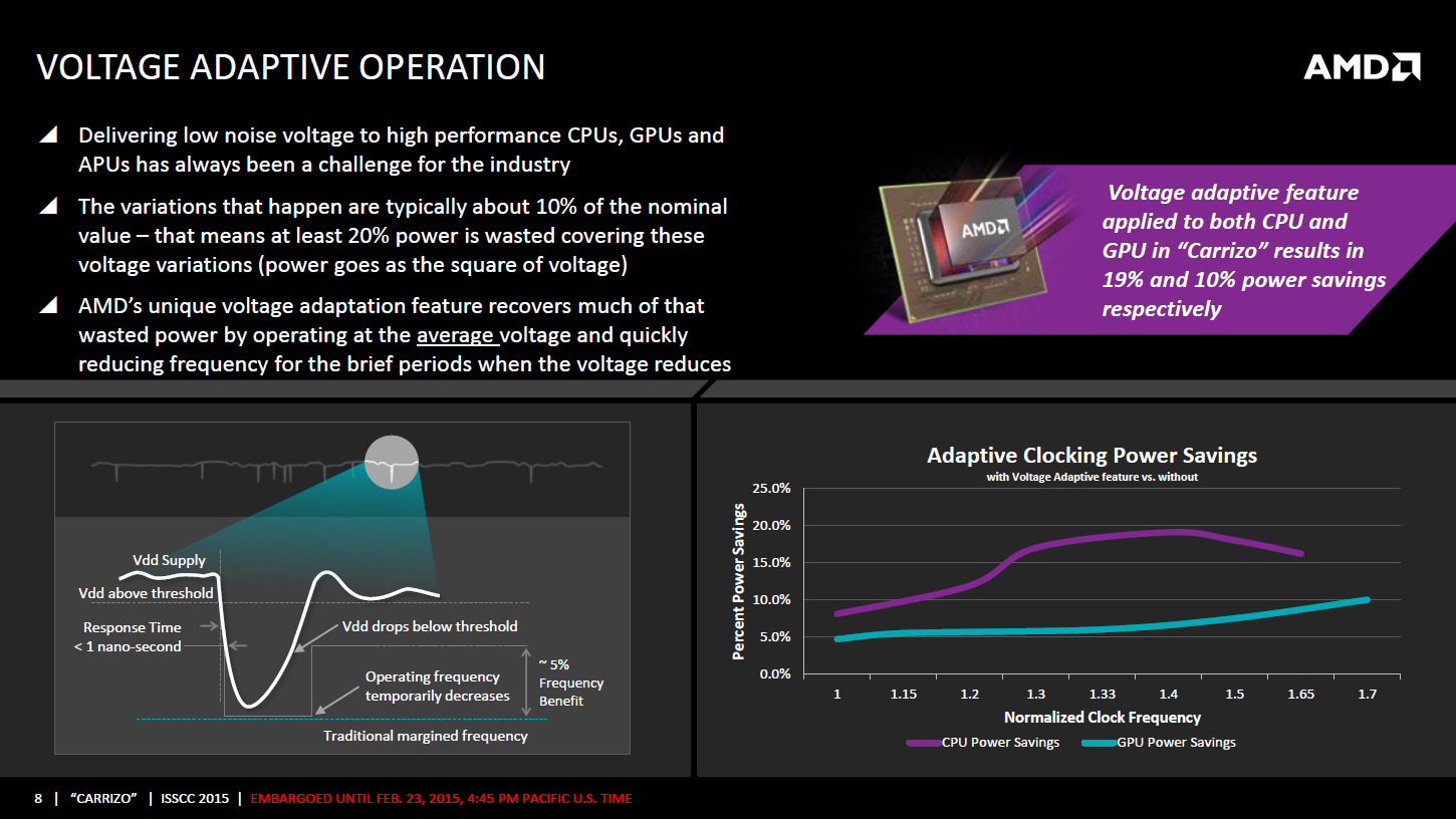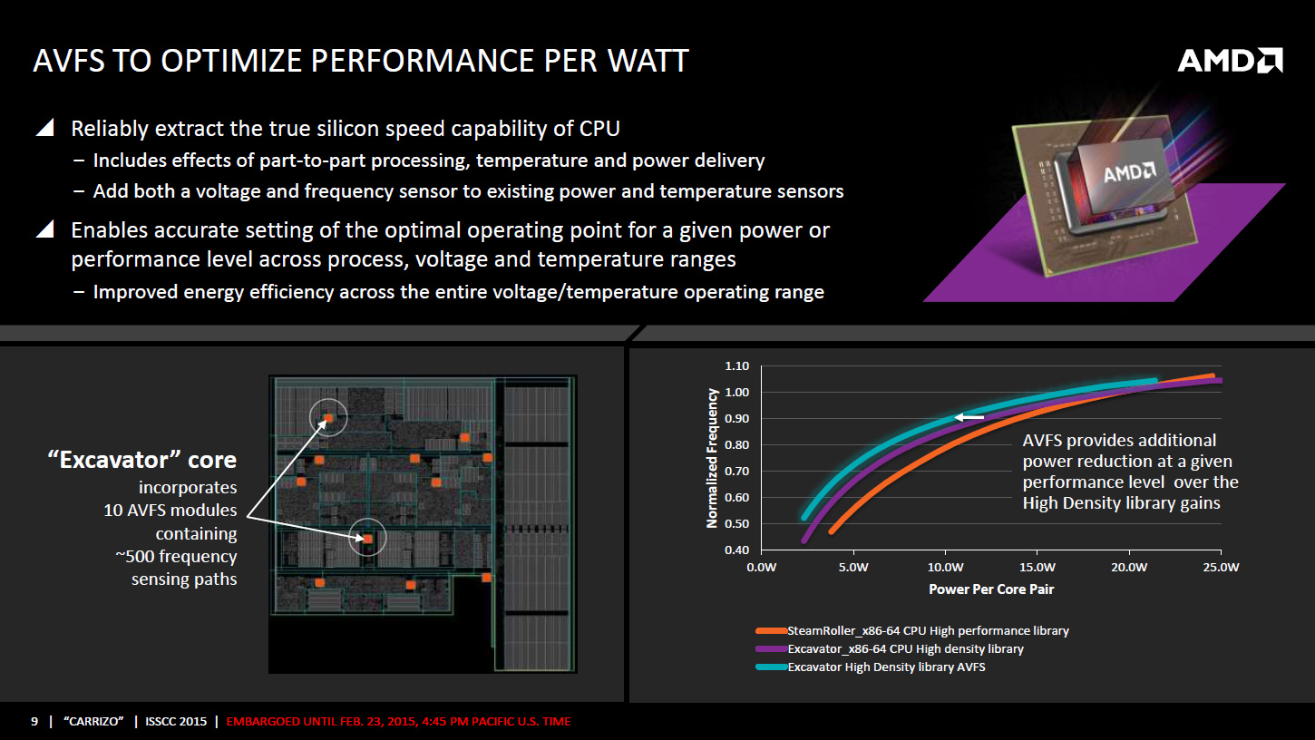 Puisqu'on parle de la tension, AMD intègre un mécanisme visant à adapter très rapidement, en moins de 1ns, la fréquence CPU ou GPU en cas de chute de la tension d'alimentation. Ceci permettrait d'utiliser une marge de sécurité moins importante vis à vis de la tension et de gagner environ 5% de fréquence à tension égale, AMD annonçant des gains de consommation pouvant atteindre 19% côté CPU et 10% côté GPU. Ce n'est pas la seule amélioration dans la consommation puisque les cœurs Excavator intègrent la technologie AVFS (adaptive voltage-frequency scaling). Il s'agit d'une dizaine de capteurs qui sont capables de détecter quand le processeur est proche de faire des erreurs de calcul, sans en être encore à ce stade, et qui remontent alors à une unité dénommée SMU (pour system-management unit) des informations sur la tension, la fréquence et la température. Sur la base de ces statistiques, cette unité se charge alors de créer et maintenir une table de fréquence / tension optimale pour chaque exemplaire de Carrizo.