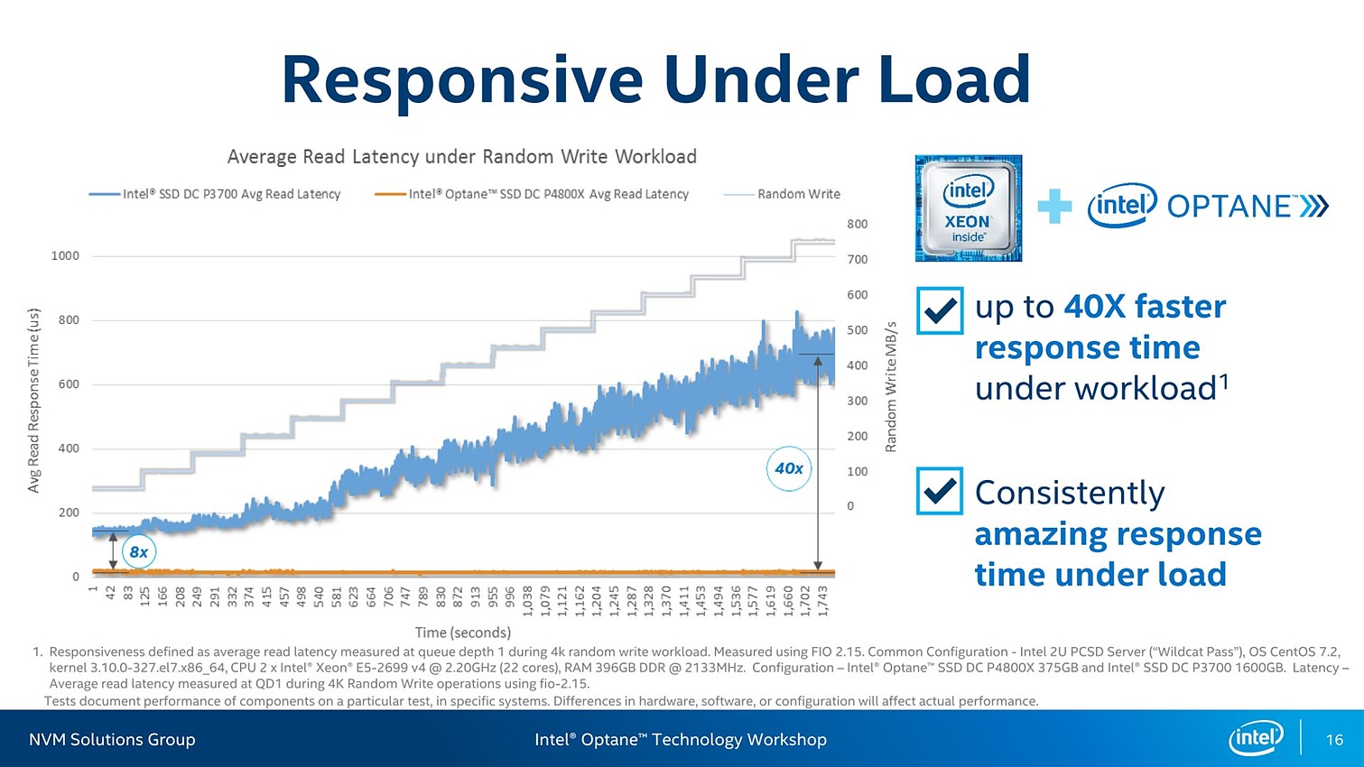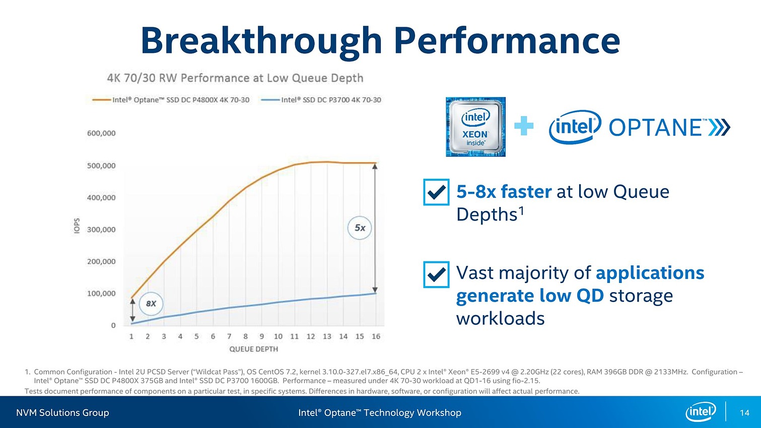 Les spécifications n'ont pas bougées depuis la fuite de février, on atteint donc 550K/500K IOPS en lecture/écriture aléatoire 4K dès 16 commandes simultanées là ou un SSD DC P3700 400 Go en NAND affiche 450K/75K IOPS en poussant à 32 commandes. Selon Intel, Optane creuse l'avantage avec peu de commandes simultanées, ainsi avec une seule commande la lecture et l'écriture aléatoire sont 10 et 30 fois plus rapide.