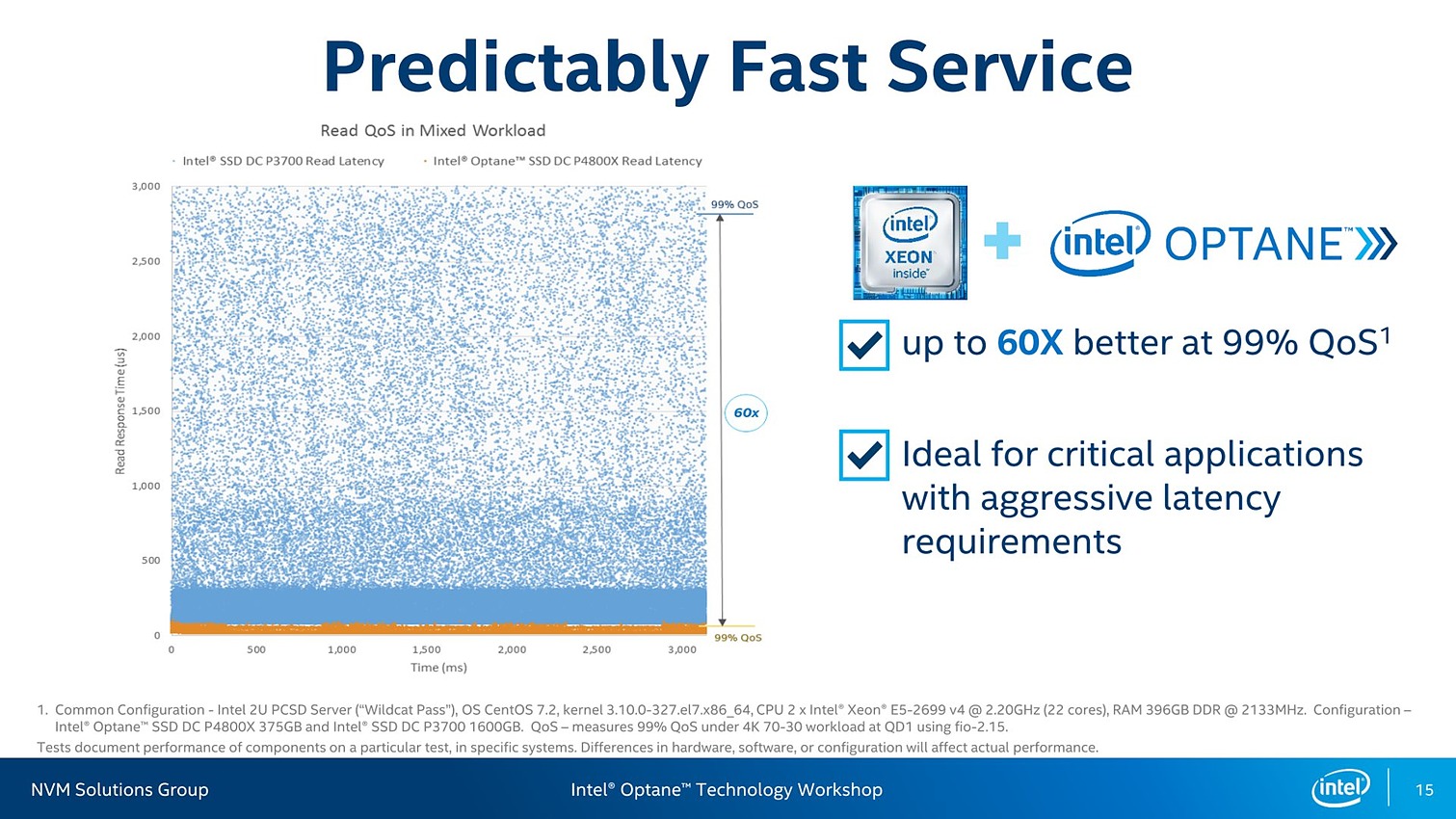 L'autre gros avantage se situerait du côté de la qualité de service, ainsi la latence maximale nécessaire pour répondre à 99% des accès lors d'accès aléatoires 4K QD1 avec 30% d'écriture serait 60x inférieurs sur Optane, avec des valeurs de l'ordre de 45 et 2700µs. Côté endurance, il est question de 12,3 péta-octets contre 7,3 pour le P3700.