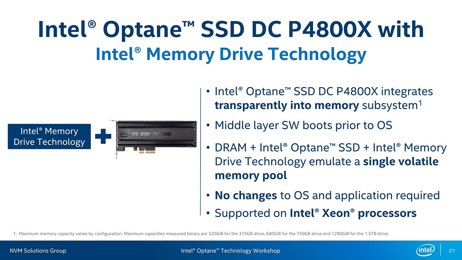 Le P4800X peut être associé à la technologie Intel Memory Drive, il faut alors débourser 431$ de plus. Elle permet de présenter à l'OS un volume de mémoire vive ne correspondant non plus à la DRAM mais au cumul de la DRAM et d'une partie de la 3D XPoint, jusqu'à 320 Go sur la version 375 Go. Memory Drive utilisera la DRAM comme cache par rapport aux données stockées sur l'Optane, essayant de les pré-charger si nécessaire. Il est possible de cumuler les Optane pour cet usage et de proposer jusqu'à 10x la DRAM en mémoire virtuelle bien qu'Intel recommande de se limiter entre 3x et 8x.