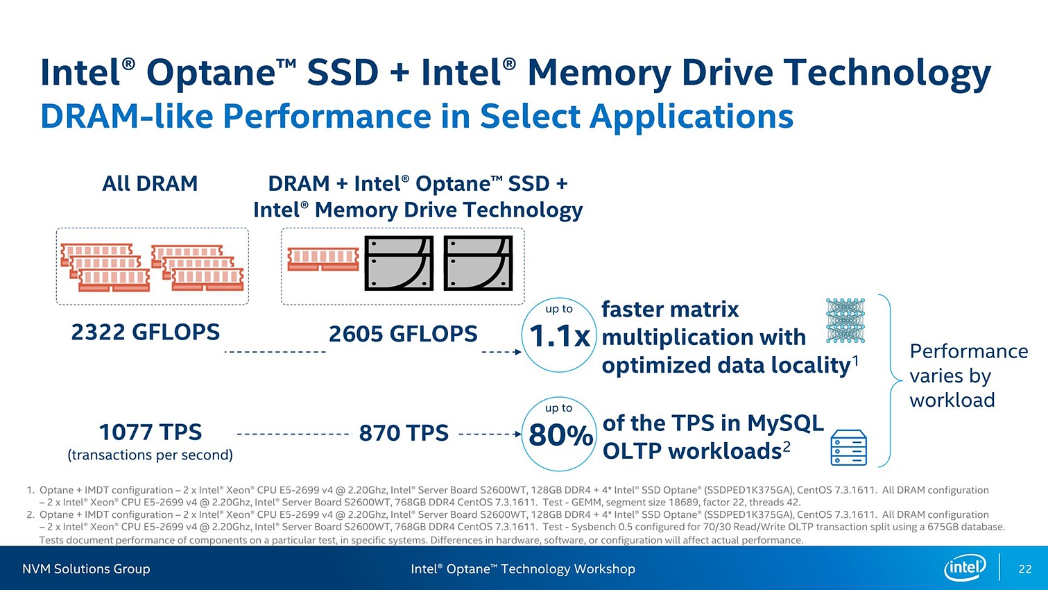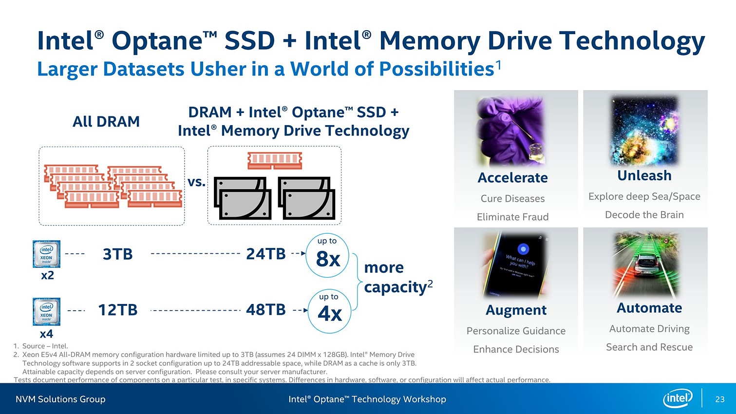 Un système qui se rapproche a priori du bon vieux swap natif aux OS mais qu'Intel annonce plus efficace. Une utilisation assez spécifique qui nécessite de passer par un hyperviseur Intel Memory Drive qu'on doit démarrer avant l'OS. Des Xeon E5-x6xx v2 / Xeon E7-x8xx v2 ou supérieurs sont requis pour cette technologie qui, si elle est efficace, donne plus de sens à l'arrivée de futures Optane 3D XPoint au format DIMM.