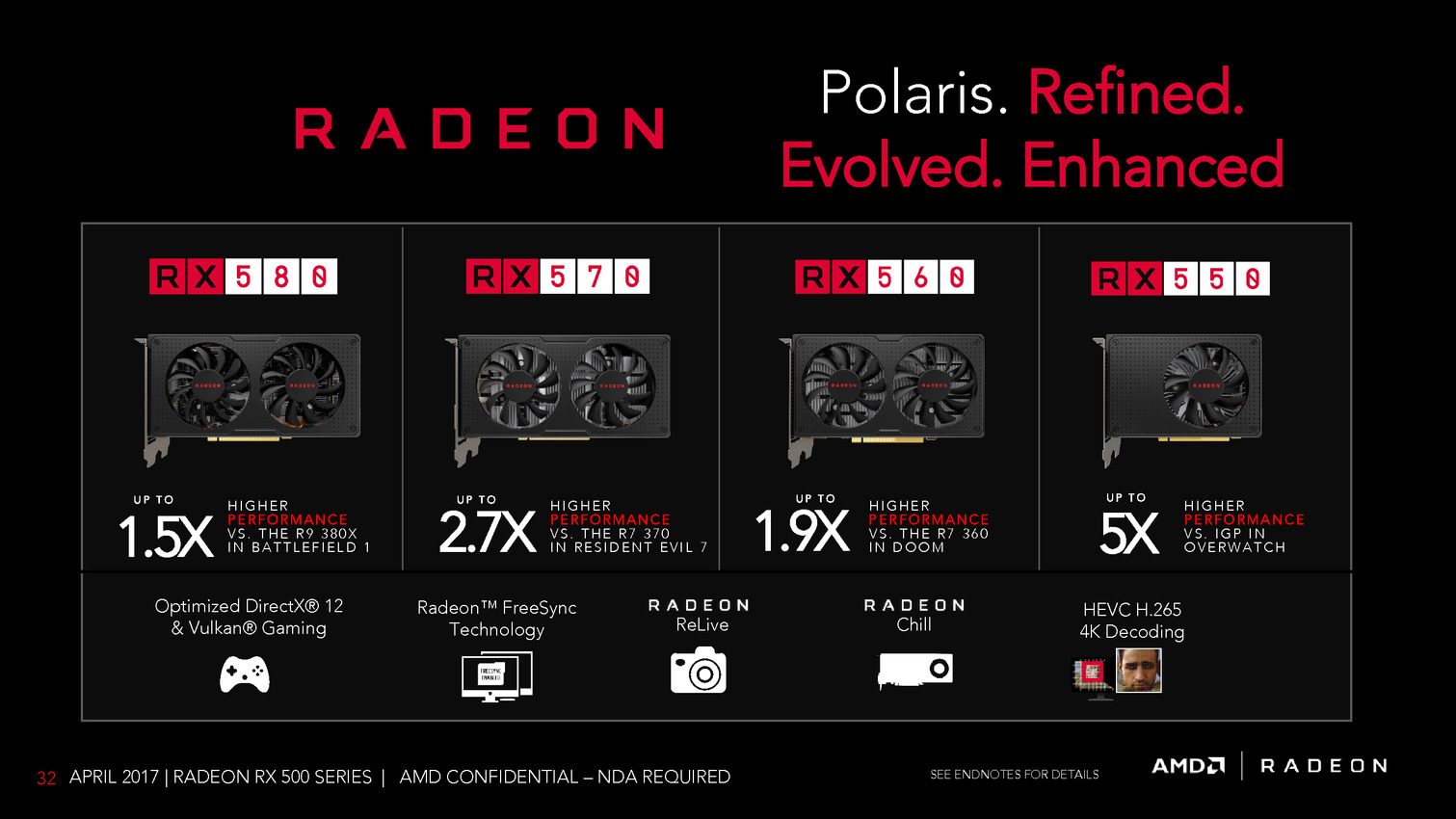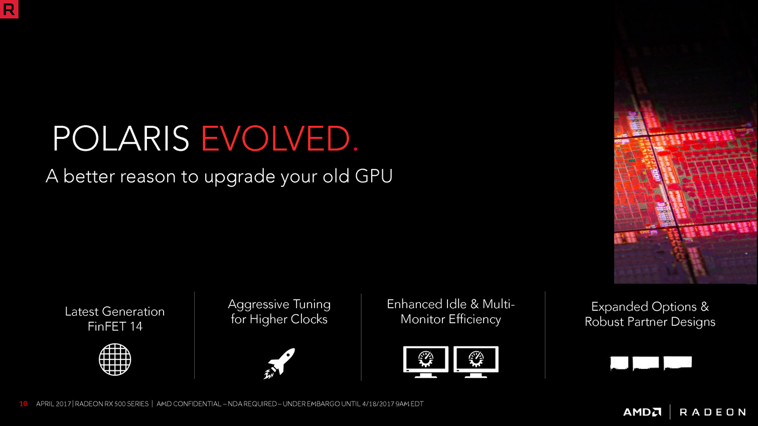 Comme le résume AMD, le lancement du jour concerne une petite mise à jour de Polaris, la génération de GPU lancée en juin dernier. AMD explique que le procédé de fabrication 14nm LPP de Global Foundries a gagné en maturité et a été légèrement amélioré, de quoi autoriser des fréquences un peu plus élevées sur certaines cartes et de quoi activer quelques unités de plus sur d'autres. Les GPU sont ainsi renommés de Polaris 10 et 11 en Polaris 20 et 21.