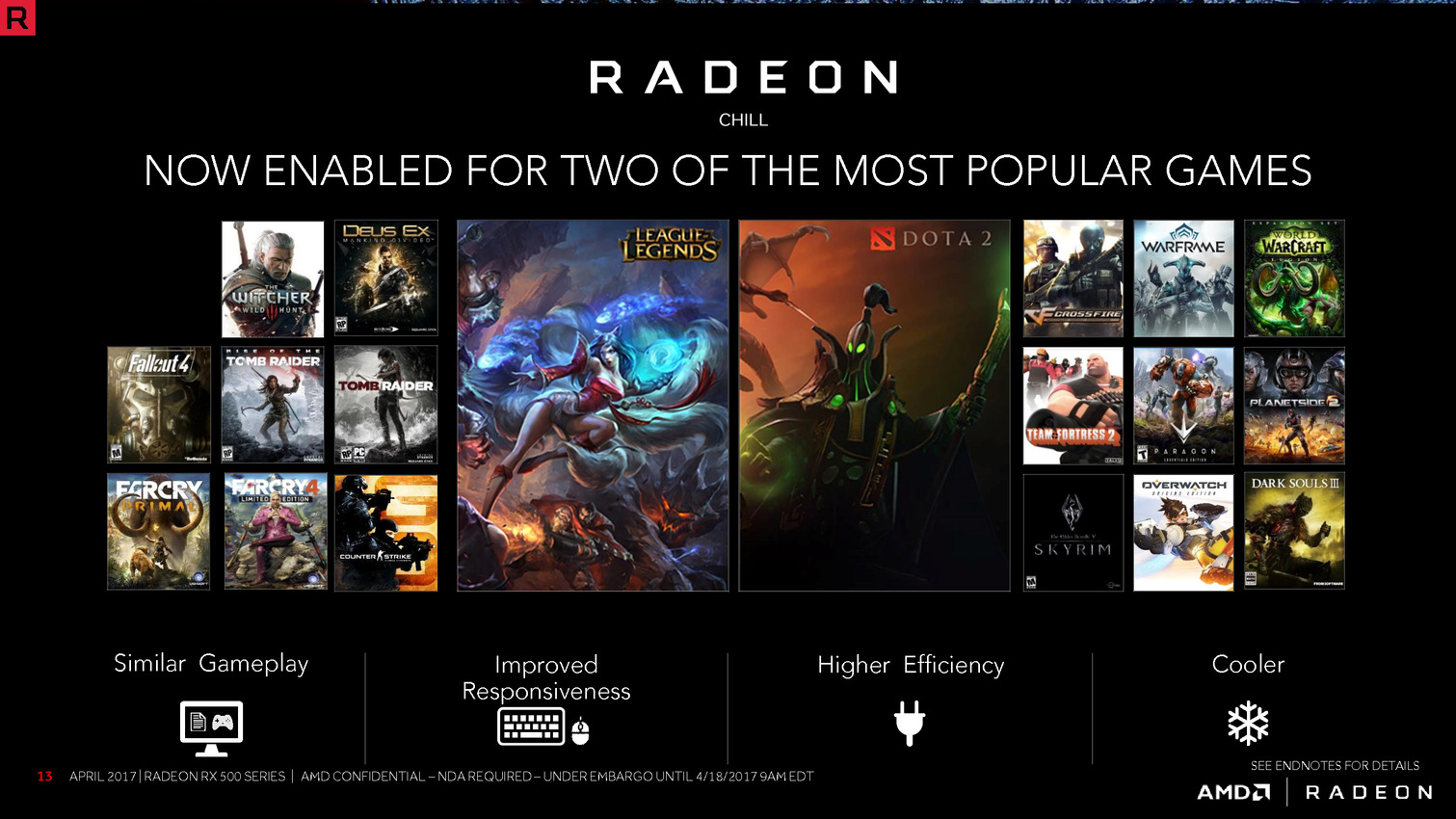Du côté de la RX 580, la fréquence GPU progresse de 6%. Du côté de la RX 570 il s'agit de seulement 3%, mais la mémoire progresse également de 6%. AMD a de toute évidence placé tous les petits gains au niveau du process de fabrication dans les fréquences et les limites de consommation ont été revues à la hausse. Ne vous attendez donc pas à un changement au niveau de l'efficacité énergétique.