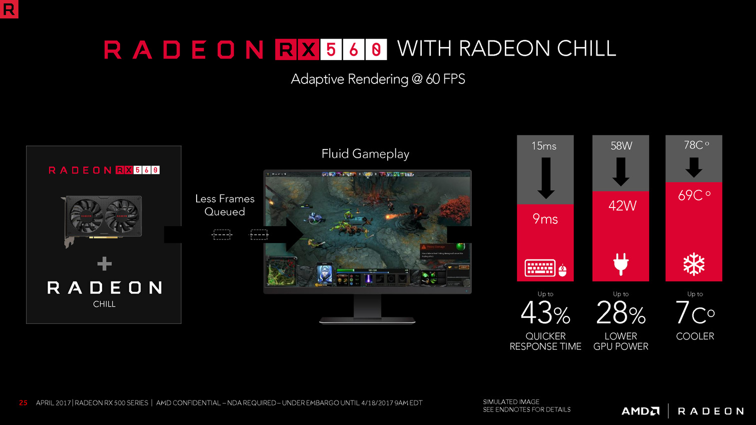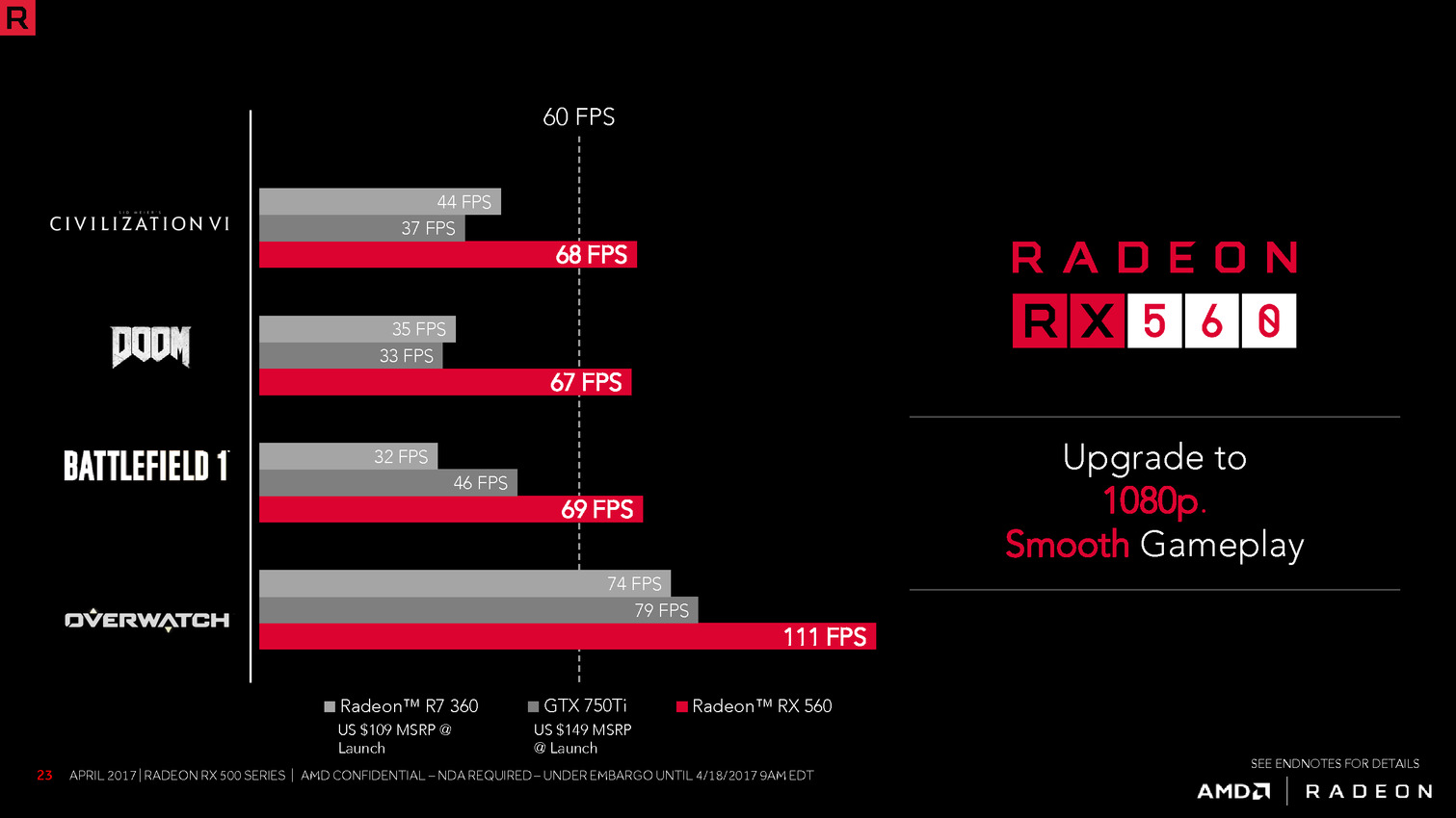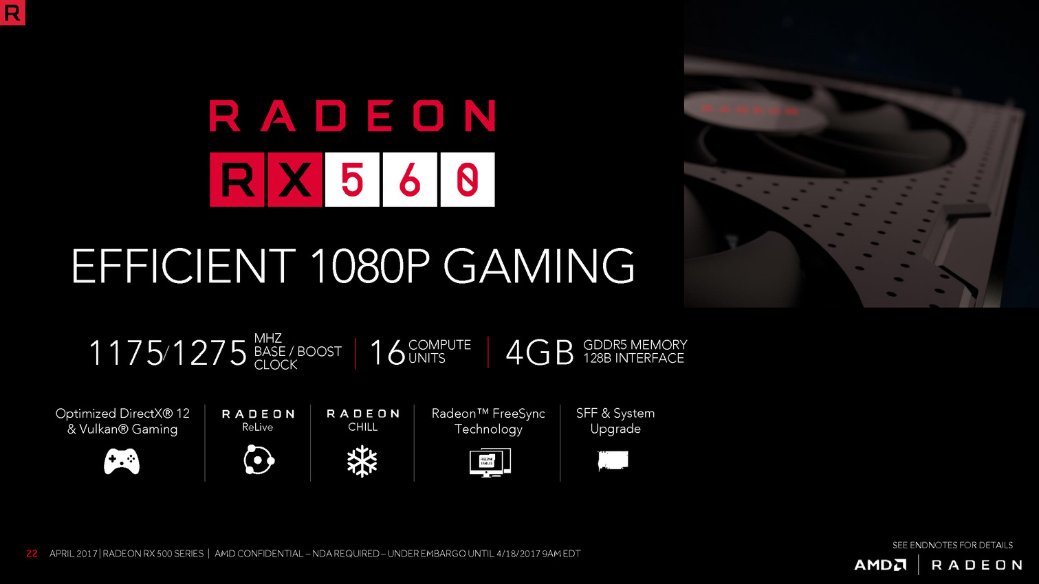 La Radeon RX 560 représente une plus grosse mise à jour. En plus de la fréquence GPU en hausse, elle profite d'un GPU complet contrairement à la RX 460. Elle profite ainsi d'un gain de puissance de 20% mais ne sera plus proposée en version dépourvue de connecteur d'alimentation.