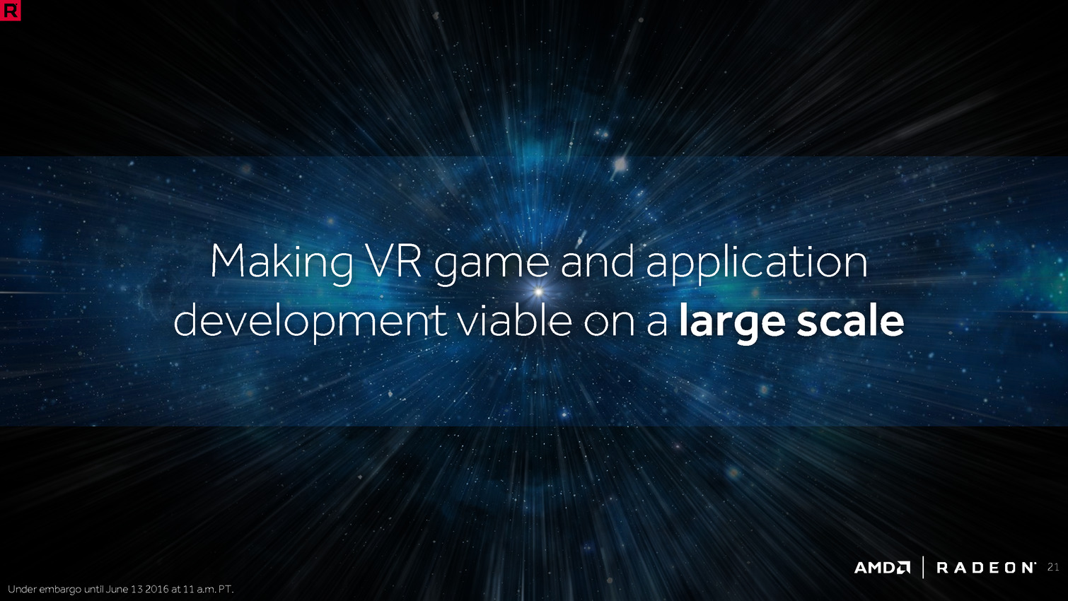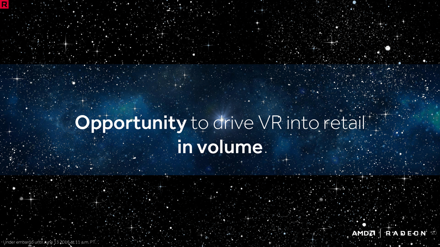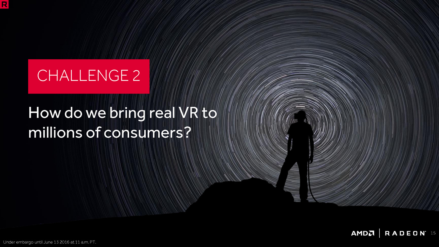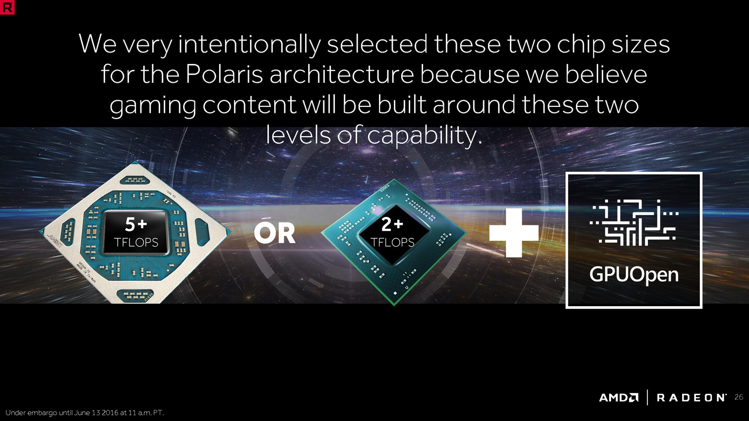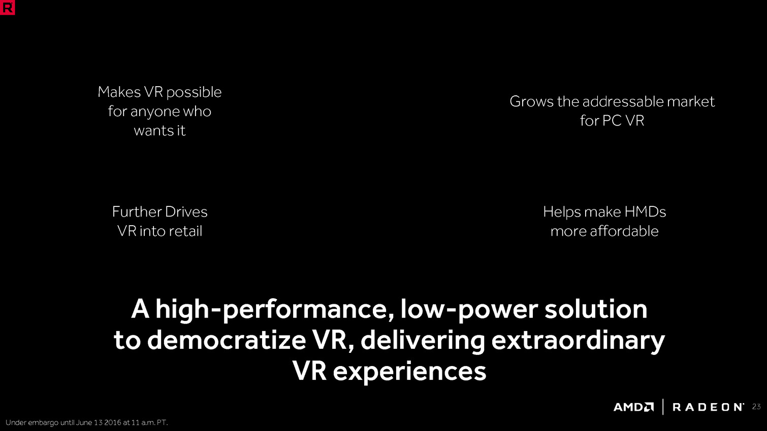 AMD revient tout d'abord en longueur sur sa stratégie par rapport à la VR mais communique ensuite quelques informations concernant ses 2 GPU Polaris. Tout d'abord en expliquant avoir visé deux tailles de GPU calibrés par rapport à ce qu'ils s'attendent à ce que les développeurs visent en termes de capacités.