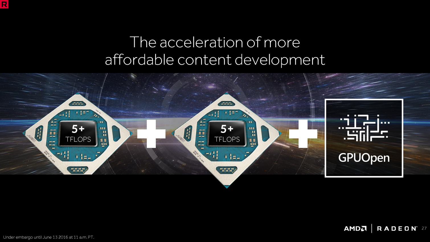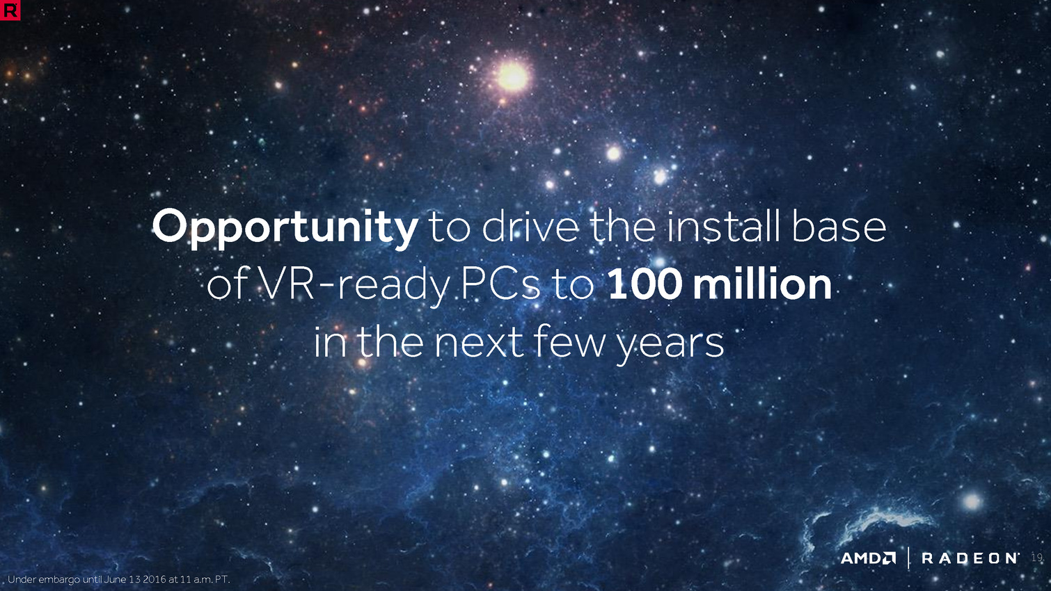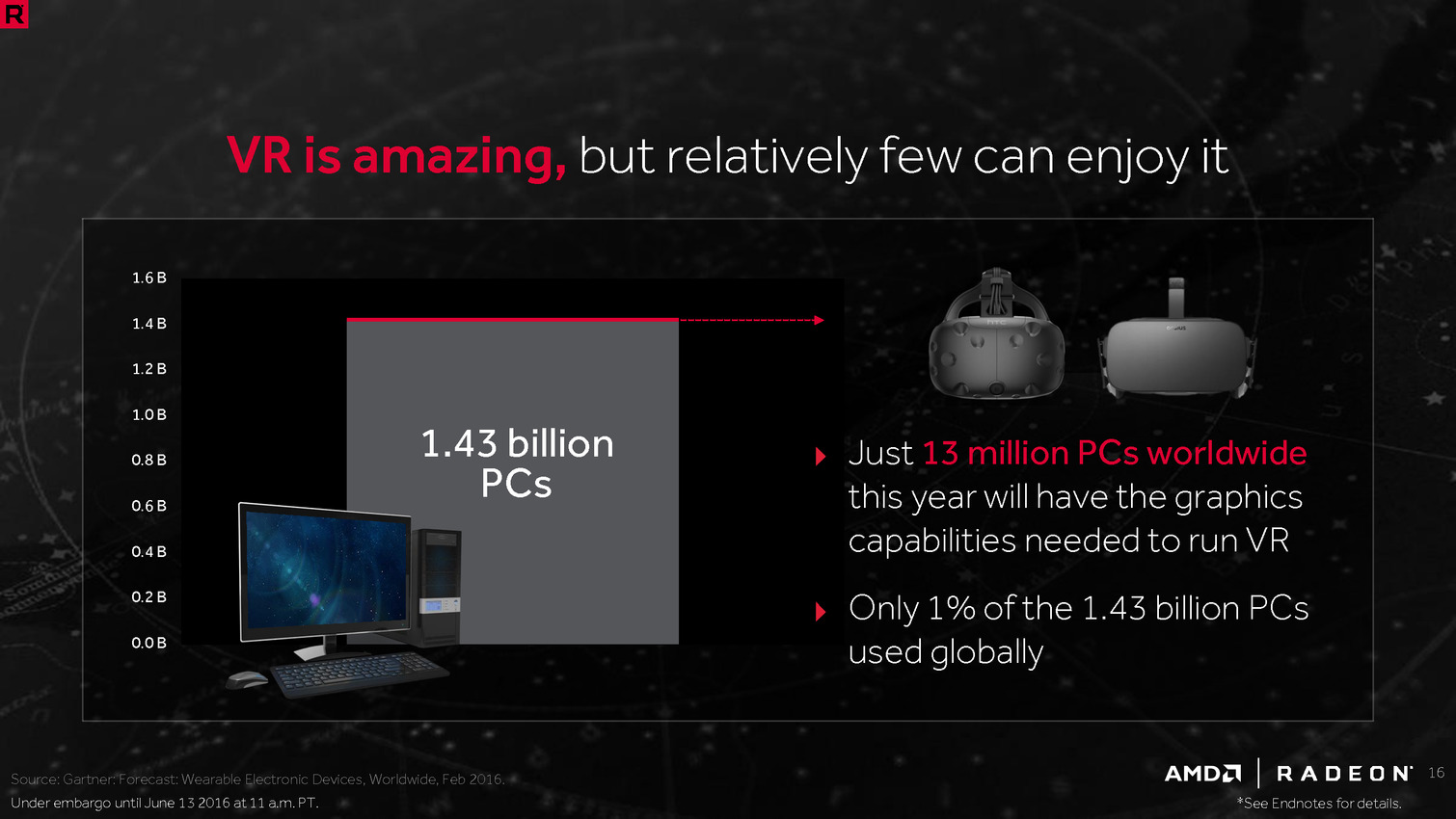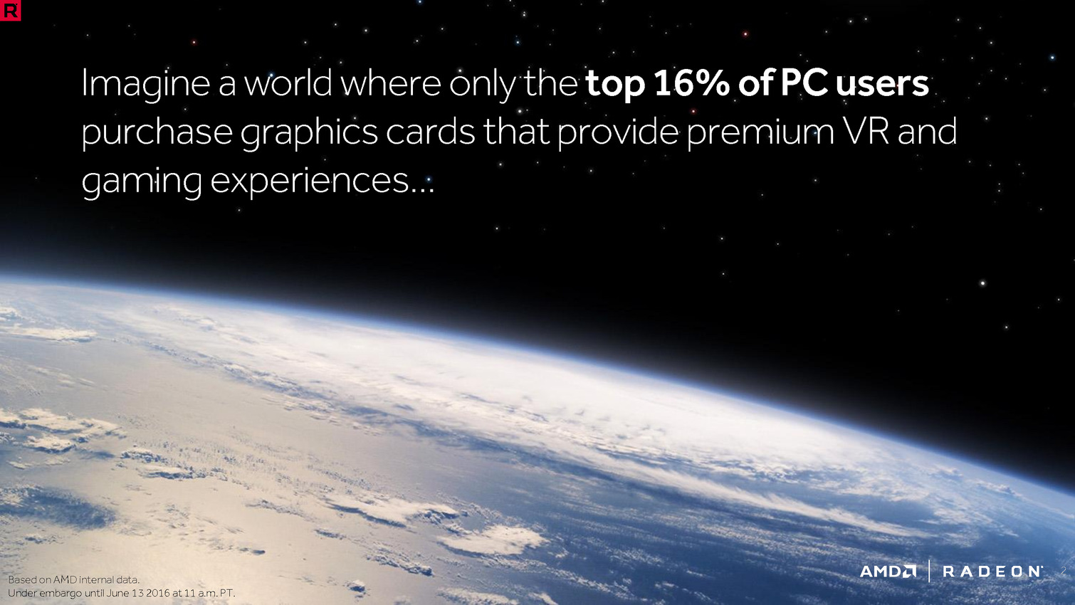 AMD revient tout d'abord en longueur sur sa stratégie par rapport à la VR mais communique ensuite quelques informations concernant ses 2 GPU Polaris. Tout d'abord en expliquant avoir visé deux tailles de GPU calibrés par rapport à ce qu'ils s'attendent à ce que les développeurs visent en termes de capacités.