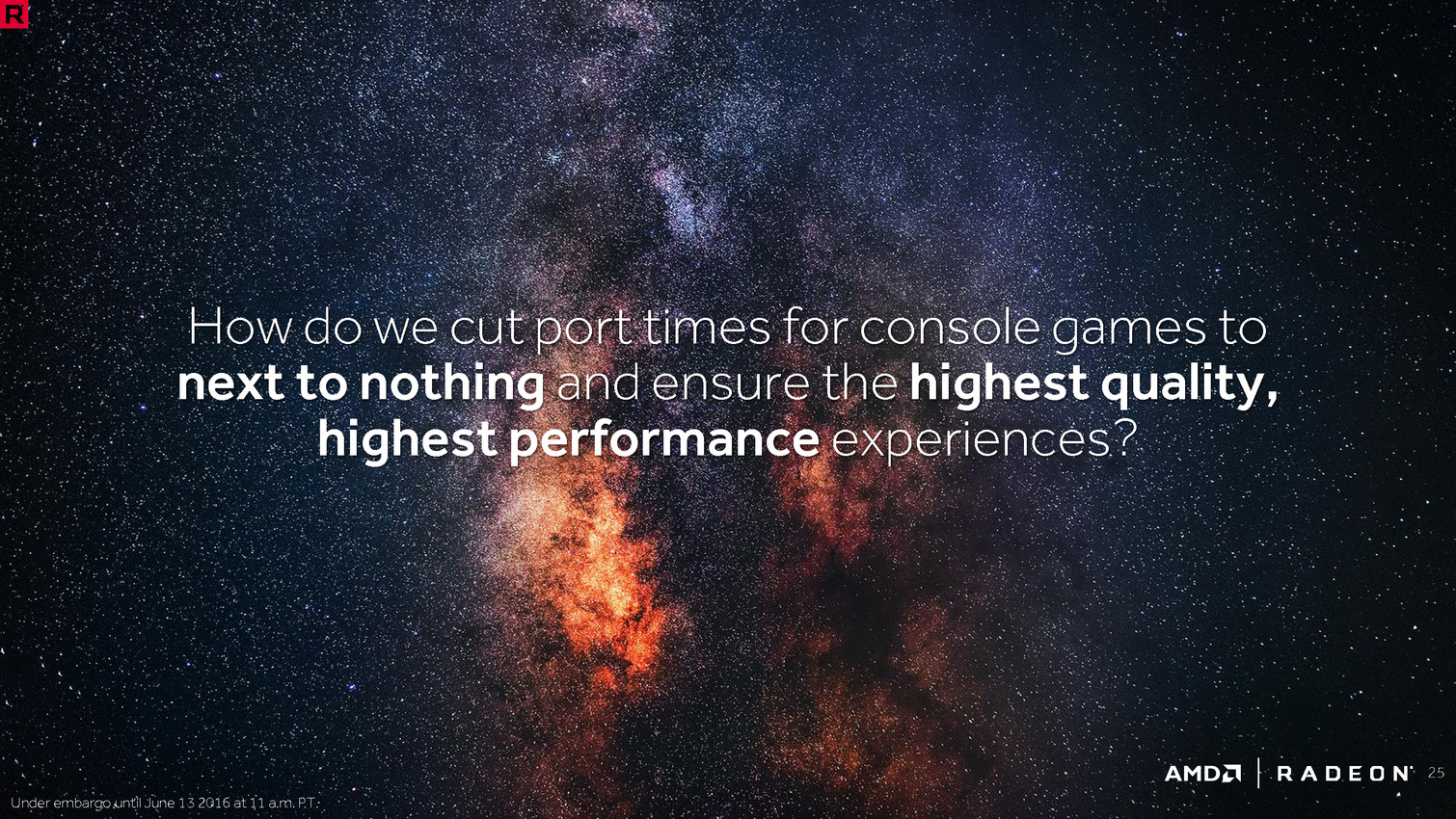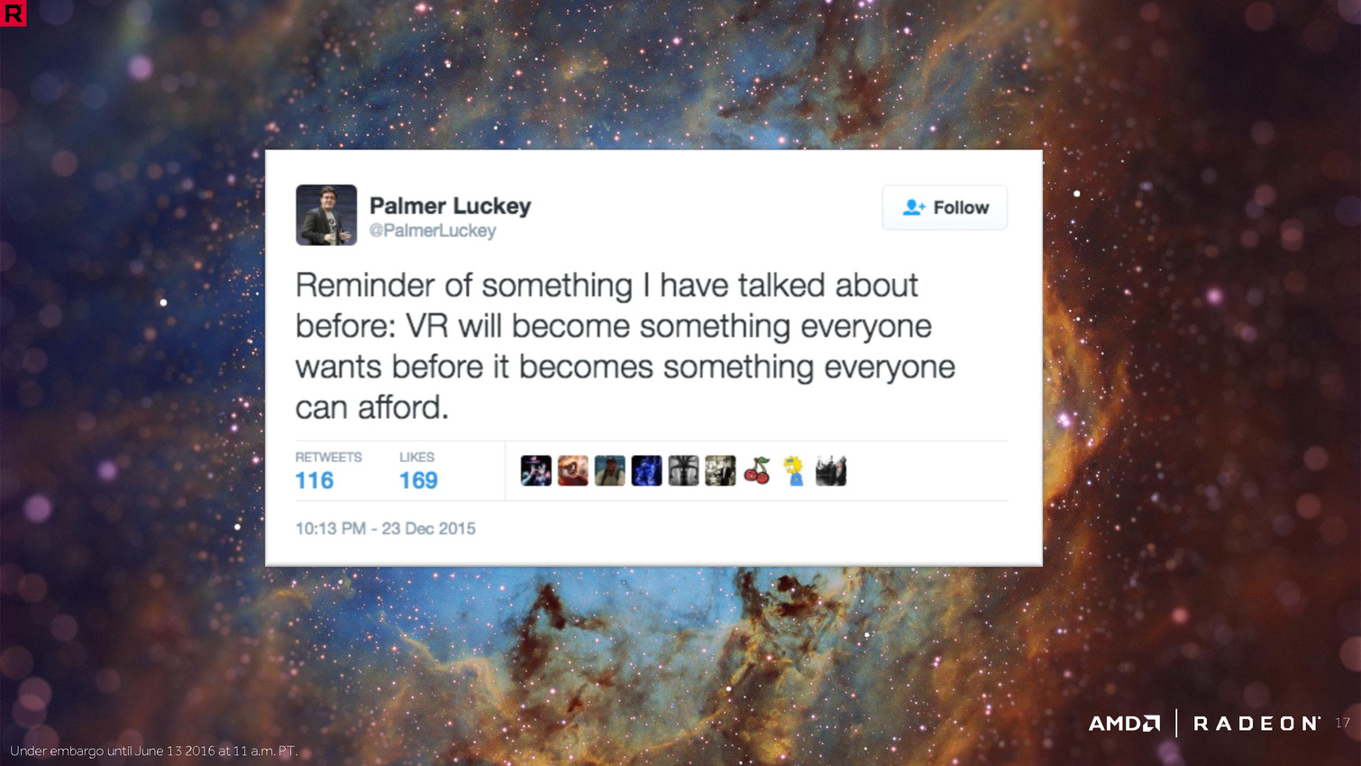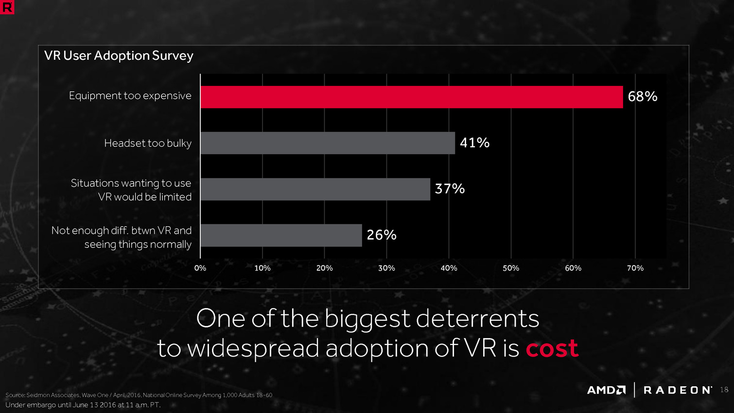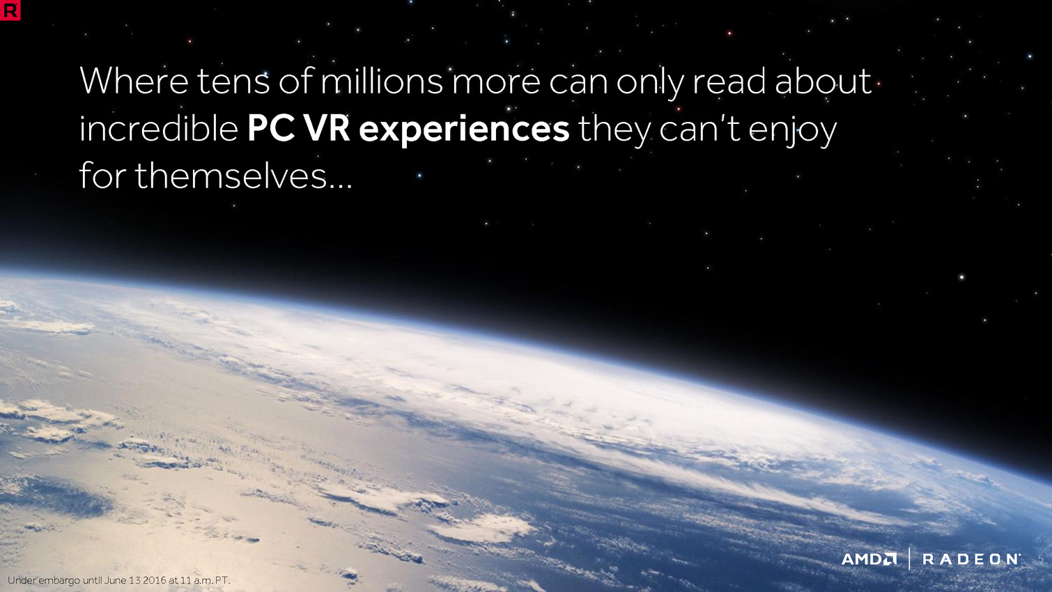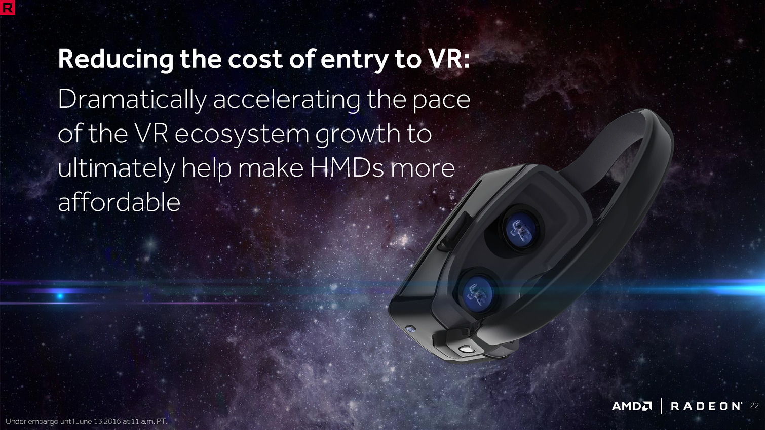 AMD revient tout d'abord en longueur sur sa stratégie par rapport à la VR mais communique ensuite quelques informations concernant ses 2 GPU Polaris. Tout d'abord en expliquant avoir visé deux tailles de GPU calibrés par rapport à ce qu'ils s'attendent à ce que les développeurs visent en termes de capacités.