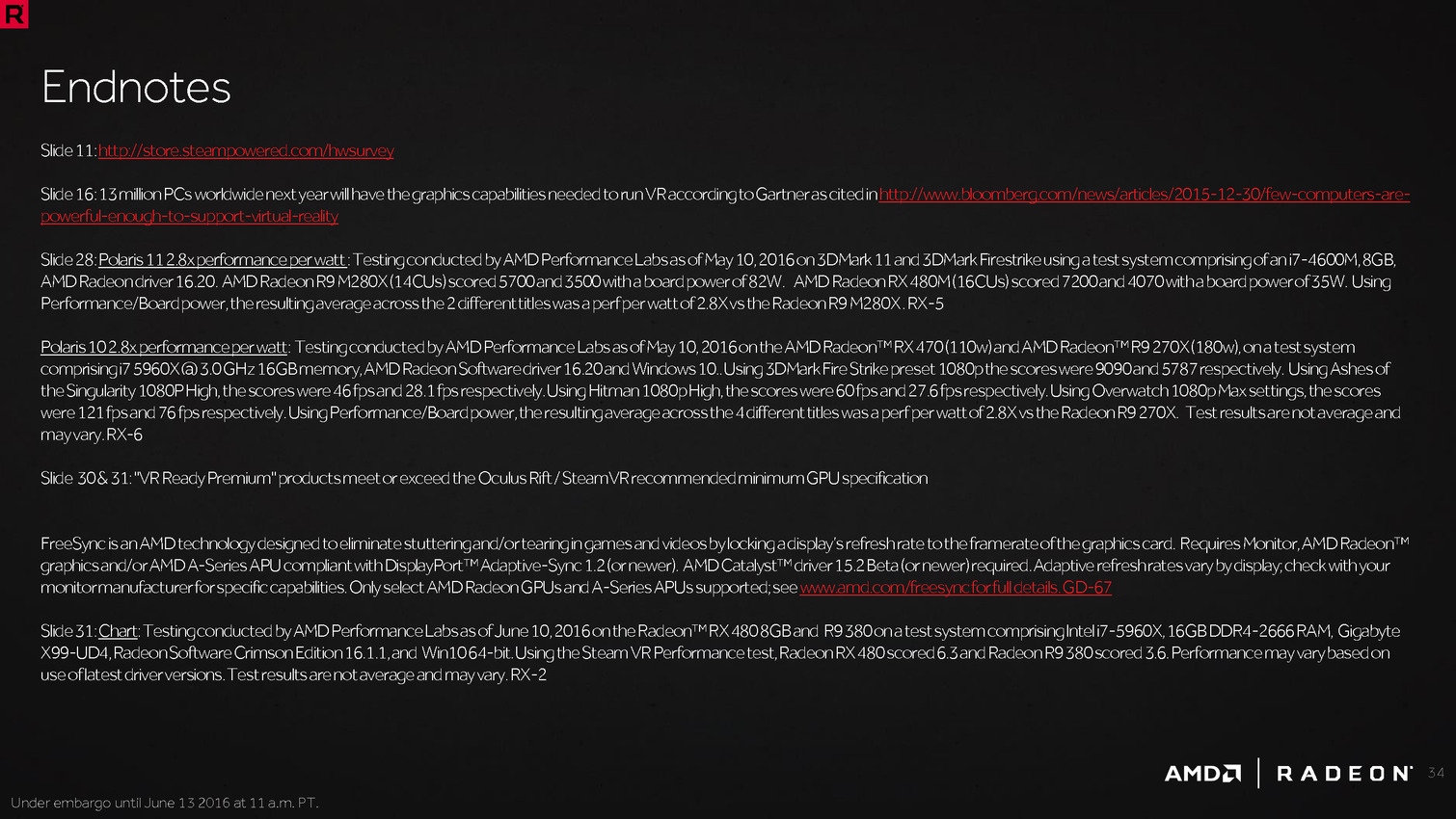 Enfin, AMD confirme que le tarif de 200$ pour la Radeon RX 480 concerne la version 4 Go de la carte, une version 8 Go étant également au programme. Aucun tarif n'est communiqué pour les 2 autres Radeon RX mais il est logique de s'attendre à quelque chose proche de +/- 120€ et +/- 175€ pour les RX 460 et RX 470..