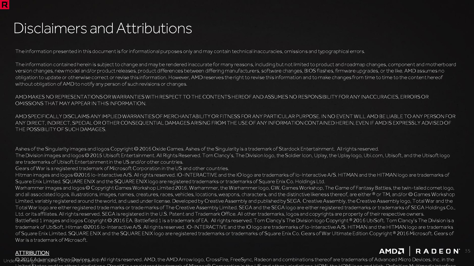 Les détails techniques concernant ces cartes graphiques et leurs GPU resteront encore dans l'ombre pendant quelques semaines. AMD se contente d'indiquer que la Radeon RX 470 vise le jeu en HD avec un haut niveau d'efficacité énergétique alors que la Radeon RX 460 vise l'e-sport et les jeux type MOBA.