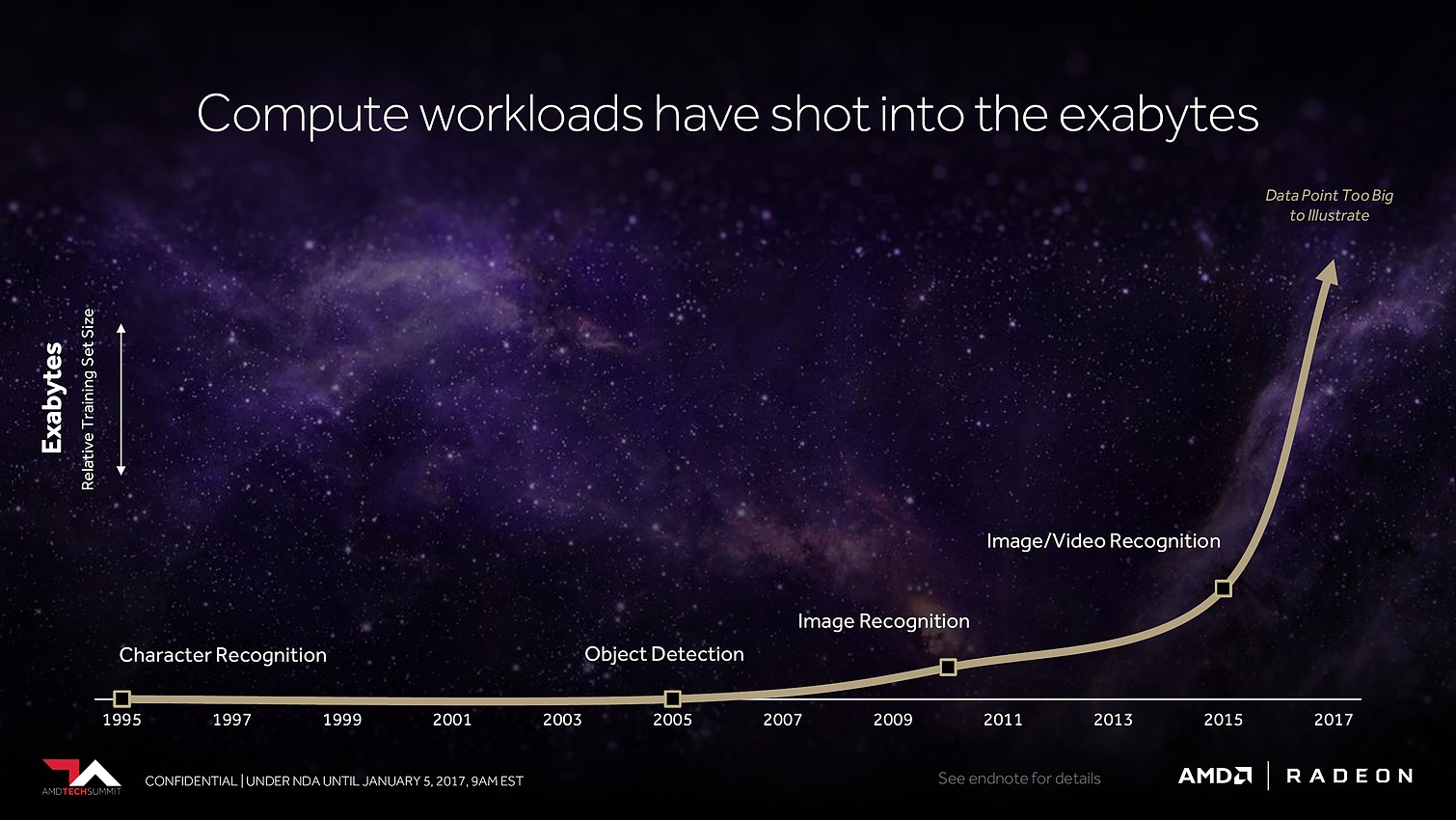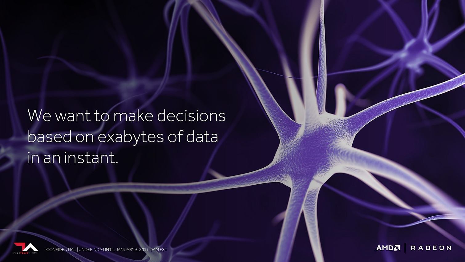 Après avoir fait le tour des marchés potentiels sur lesquels AMD va pouvoir revenir grâce à cette nouvelle génération de GPU, et après avoir rappelé les quelques points d'architectures dévoilés en janvier, Raja Koduri a voulu s'attarder sur l'apprentissage machine (ou deep learning) qui est un domaine prioritaire pour AMD. C'est d'autant plus le cas qu'il intéresse particulièrement les investisseurs présents dans l'auditoire.