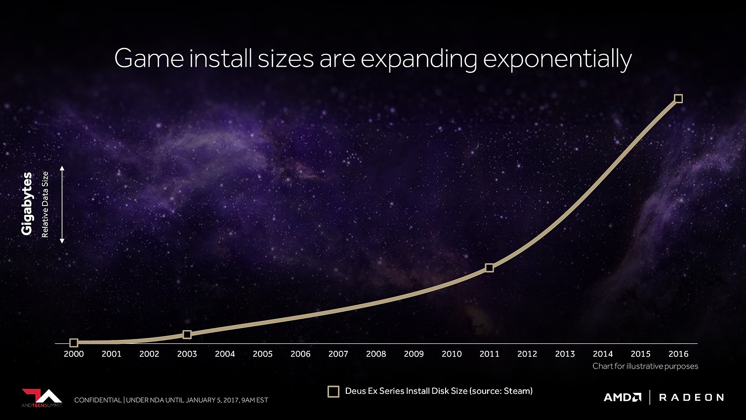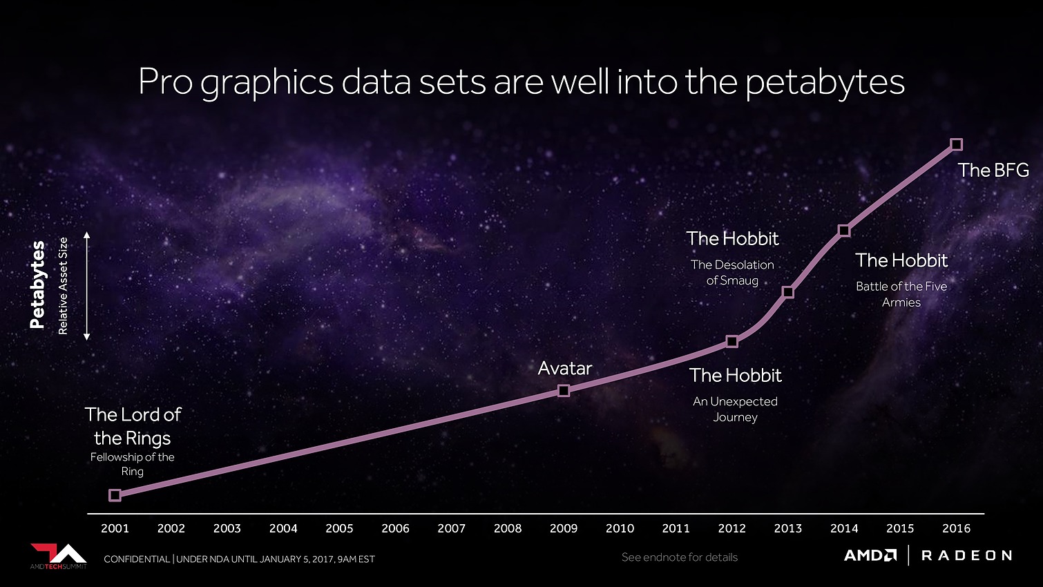 C'est évidemment principalement important dans le monde professionnel, mais AMD en parle également au niveau des jeux vidéo, probablement pour anticiper les critiques par rapport à une mémoire de "seulement" 8 Go contre 12 Go sur une Titan X de Nvidia. A ce sujet, AMD explique que pour chaque image générée moins de la moitié de la mémoire utilisée est réellement exploitée. Il y a donc des opportunités d'optimisation et le HBCC est annoncé comme capable de faire mieux que les contrôleurs et pilotes classiques.