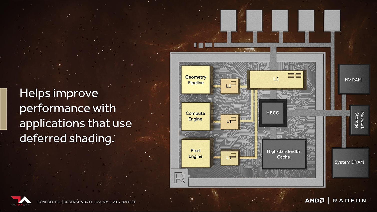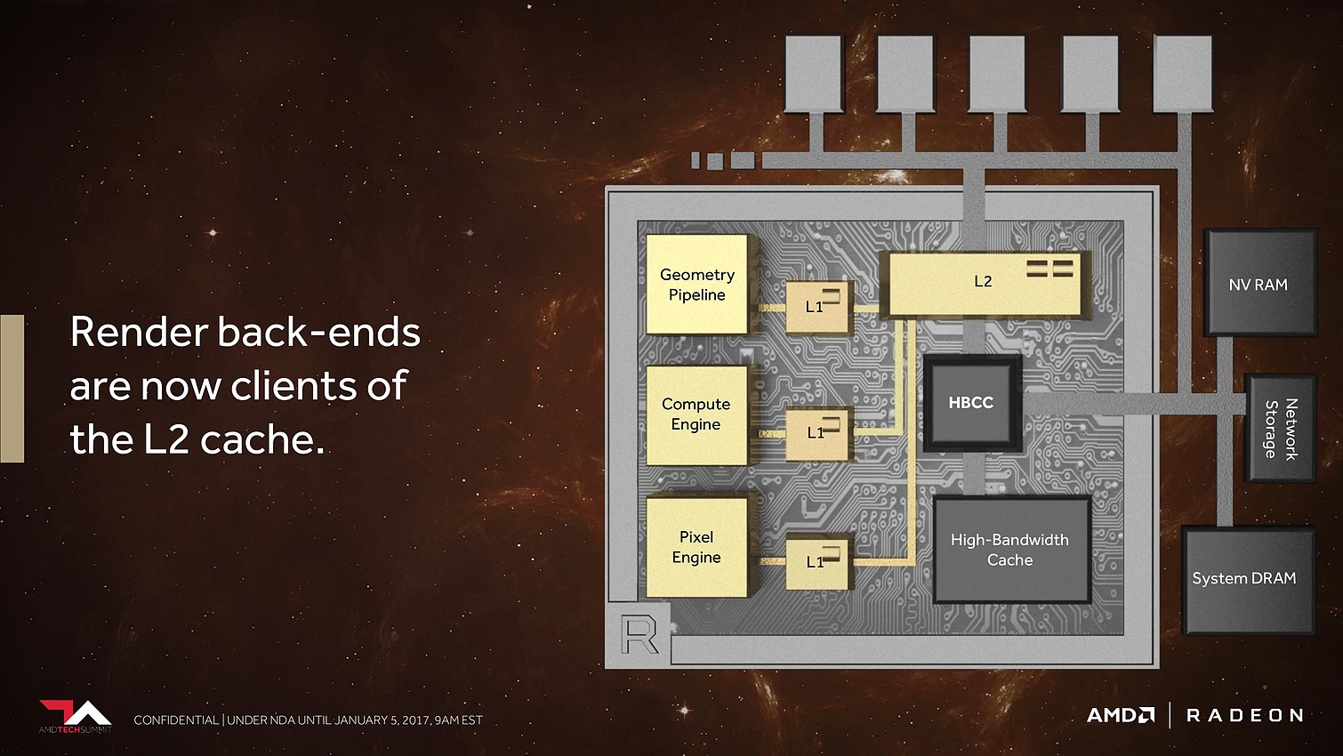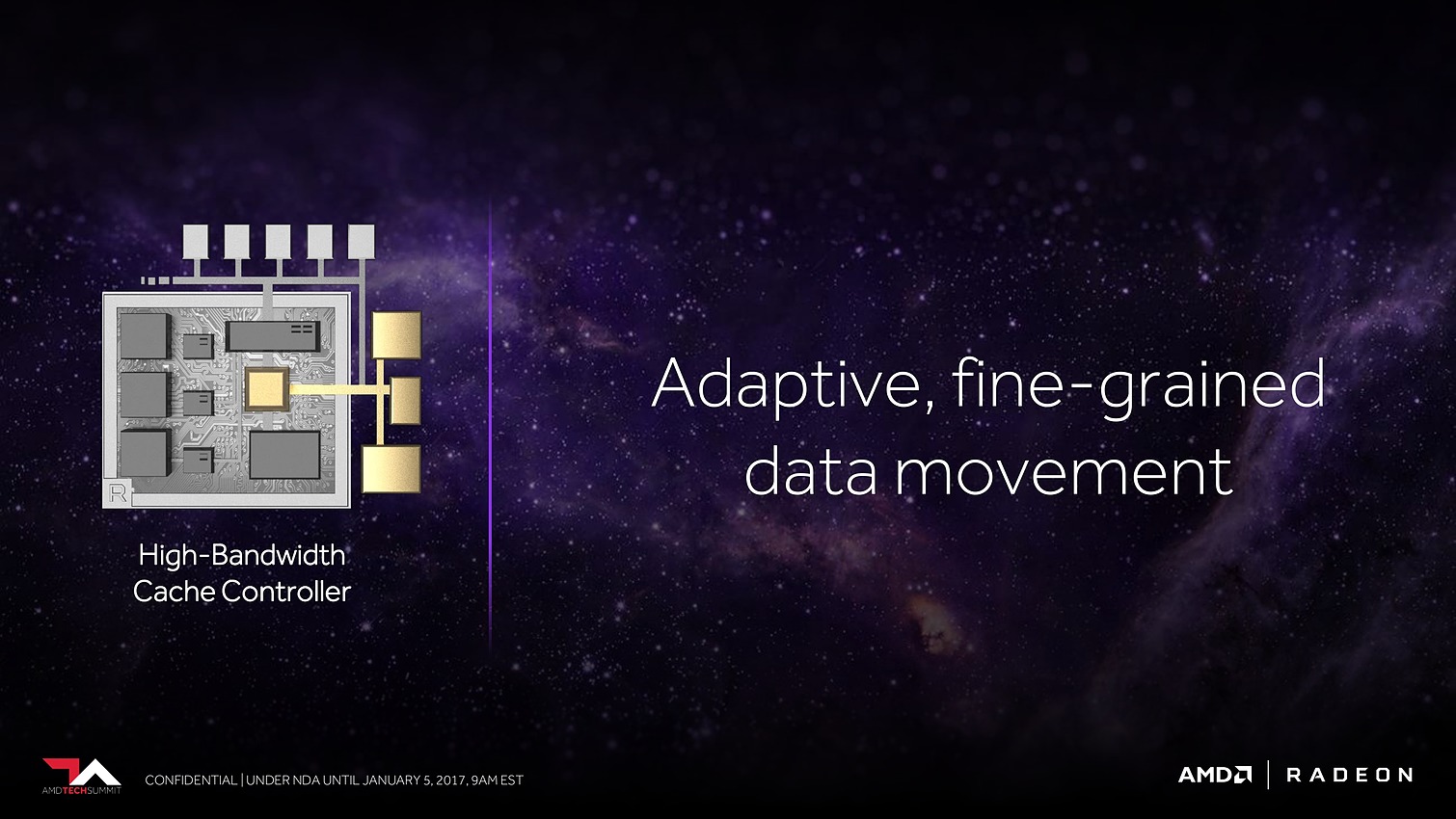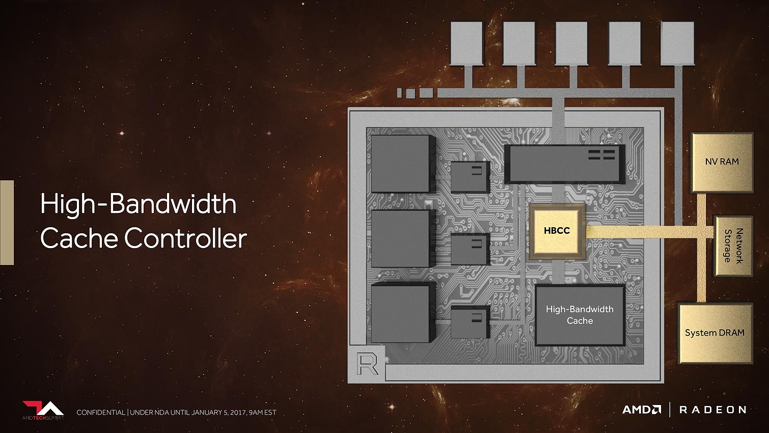 8 Go, voire 16 Go, c'est bien peu par rapport aux data sets auxquels AMD compte s'attaquer. Pour pouvoir s'y attaquer plus efficacement, AMD a revu le contrôleur mémoire qui s'appelle dorénavant High Bandwidth Cache Controller alors que la mémoire HBM2 est présentée comme un cache local (High Bandwidth Cache). Le HBCC a été conçu et optimisé pour piloter les mouvements de données à partir de l'énorme espace adressable. Qu'elles se situent dans la mémoire système, dans de la flash rattachée au GPU ou ailleurs sur le réseau, le but est faire en sorte qu'à chaque instant un maximum de données utiles se retrouvent dans la HBM2.