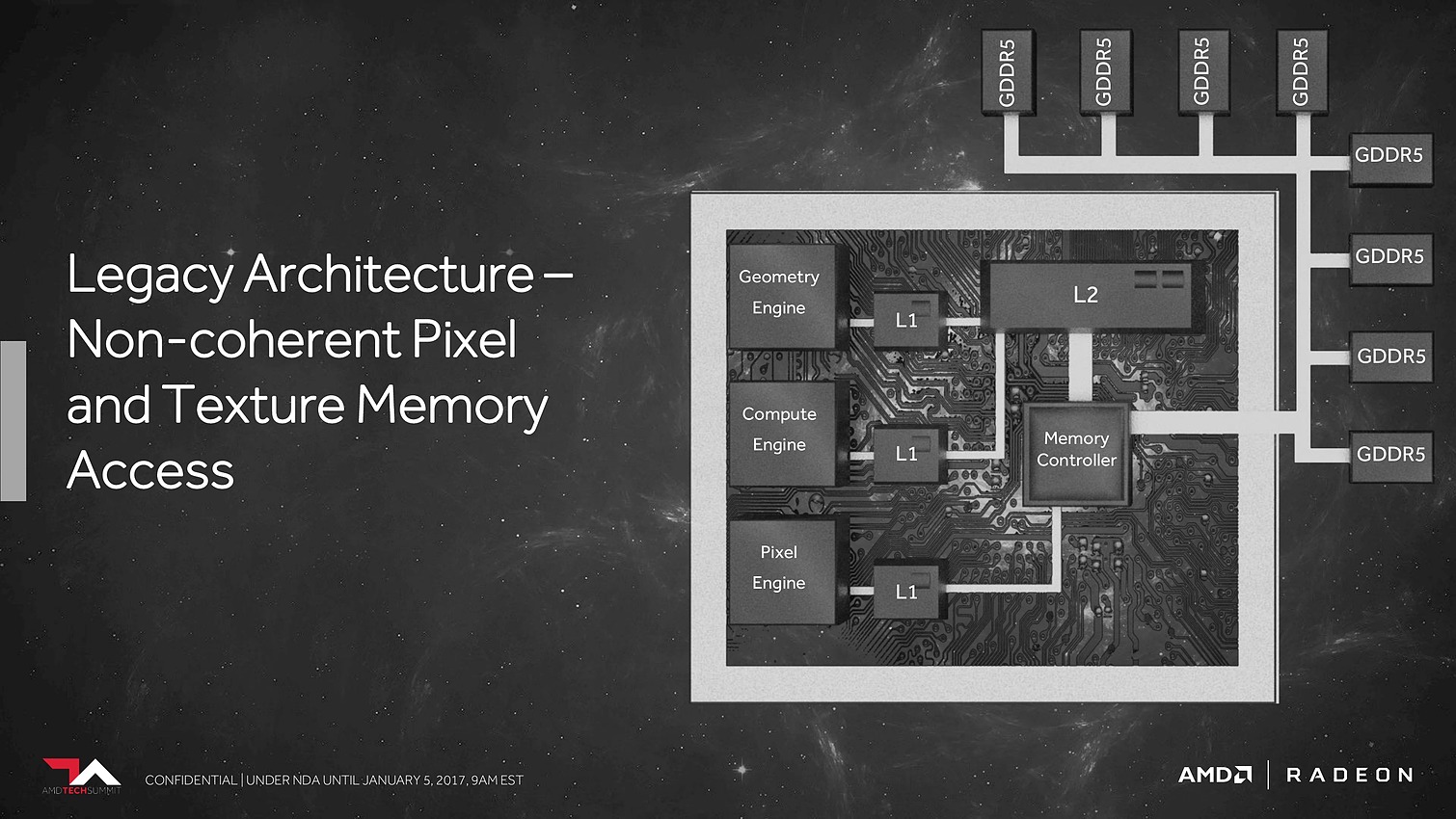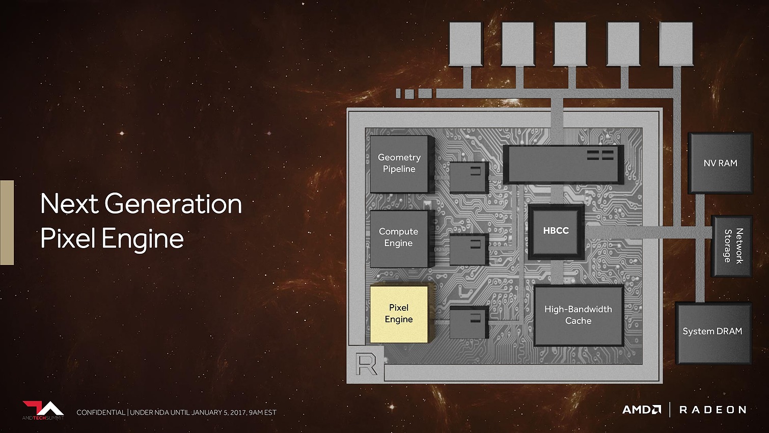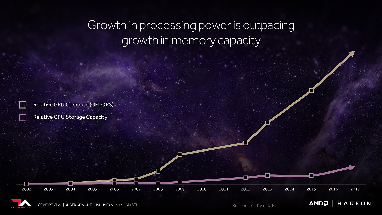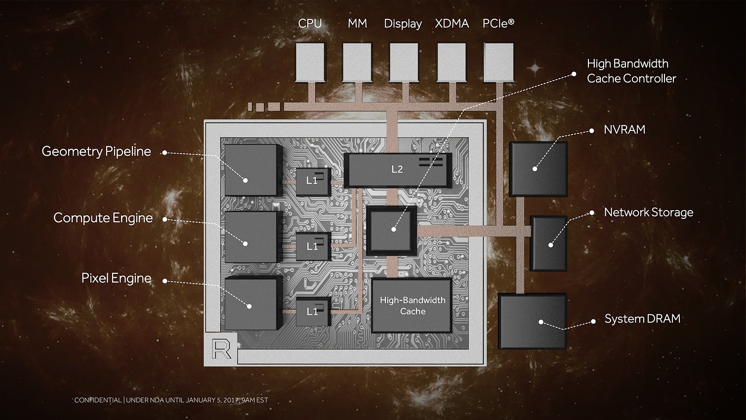 8 Go, voire 16 Go, c'est bien peu par rapport aux data sets auxquels AMD compte s'attaquer. Pour pouvoir s'y attaquer plus efficacement, AMD a revu le contrôleur mémoire qui s'appelle dorénavant High Bandwidth Cache Controller alors que la mémoire HBM2 est présentée comme un cache local (High Bandwidth Cache). Le HBCC a été conçu et optimisé pour piloter les mouvements de données à partir de l'énorme espace adressable. Qu'elles se situent dans la mémoire système, dans de la flash rattachée au GPU ou ailleurs sur le réseau, le but est faire en sorte qu'à chaque instant un maximum de données utiles se retrouvent dans la HBM2.