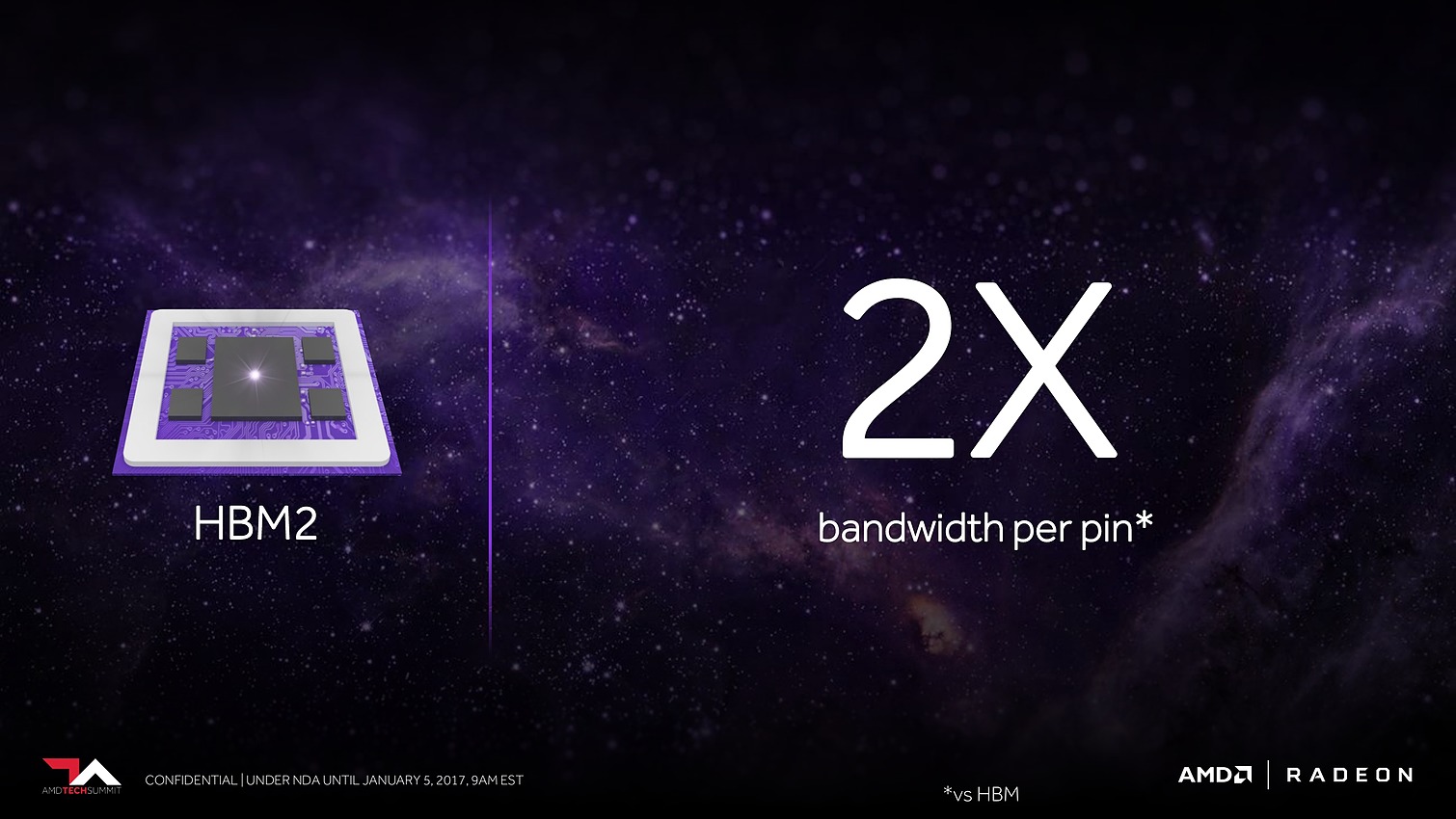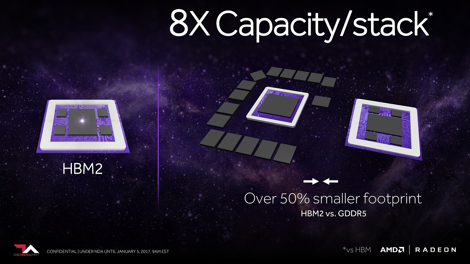 Bien entendu, le GPU Vega 10 ne recevra pas autant de mémoire dédiée. Il sera associé à 2 modules de mémoire HBM2 pour un bus combiné de 2048-bit. Sur base des premiers modules disponibles qui sont de type 4 Go (4-Hi), Vega 10 sera ainsi associé à 8 Go de HBM2, mais pourra passer à 16 Go quand les modules 8-Hi seront disponibles.