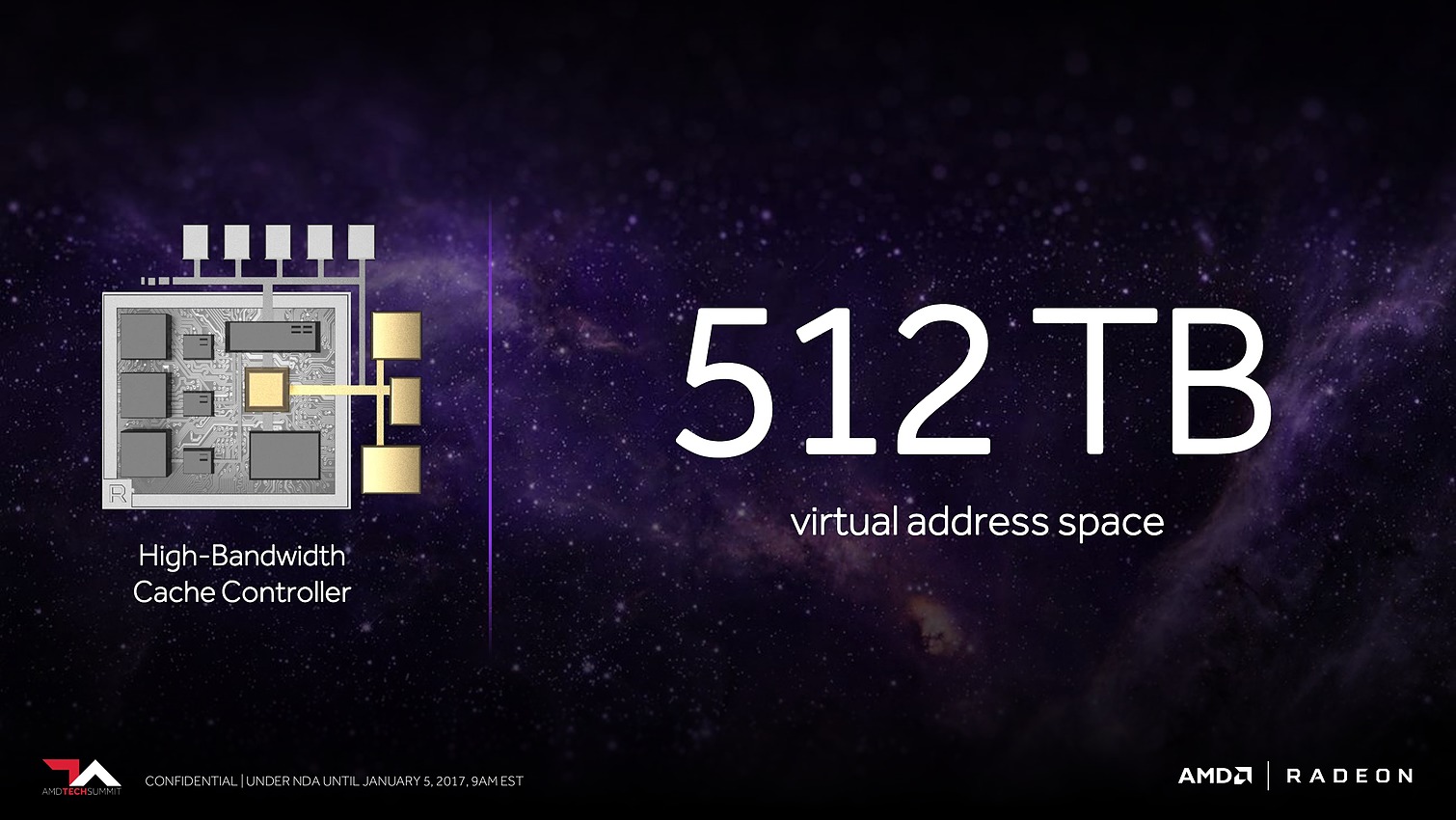 Avec Vega, AMD annonce avoir mis en place l'architecture mémoire pour GPU la plus avancée du marché, pour pouvoir répondre aux besoins actuels et futurs dans les domaines où la taille des data sets est en train d'exploser. Il serait déjà question de pétaoctets dans l'animation 3D voire même d'exaoctets dans le GPU computing et l'intelligence artificielle. Pour s'y attaquer, Vega est capable d'adresser jusqu'à 512 To grâce à un espace de mémoire virtuelle étendu (49-bit) qui va au-delà des 256 To du x64 (48-bit).