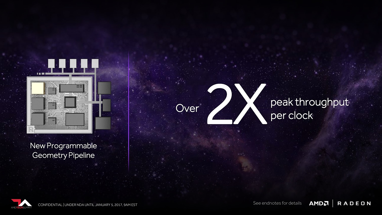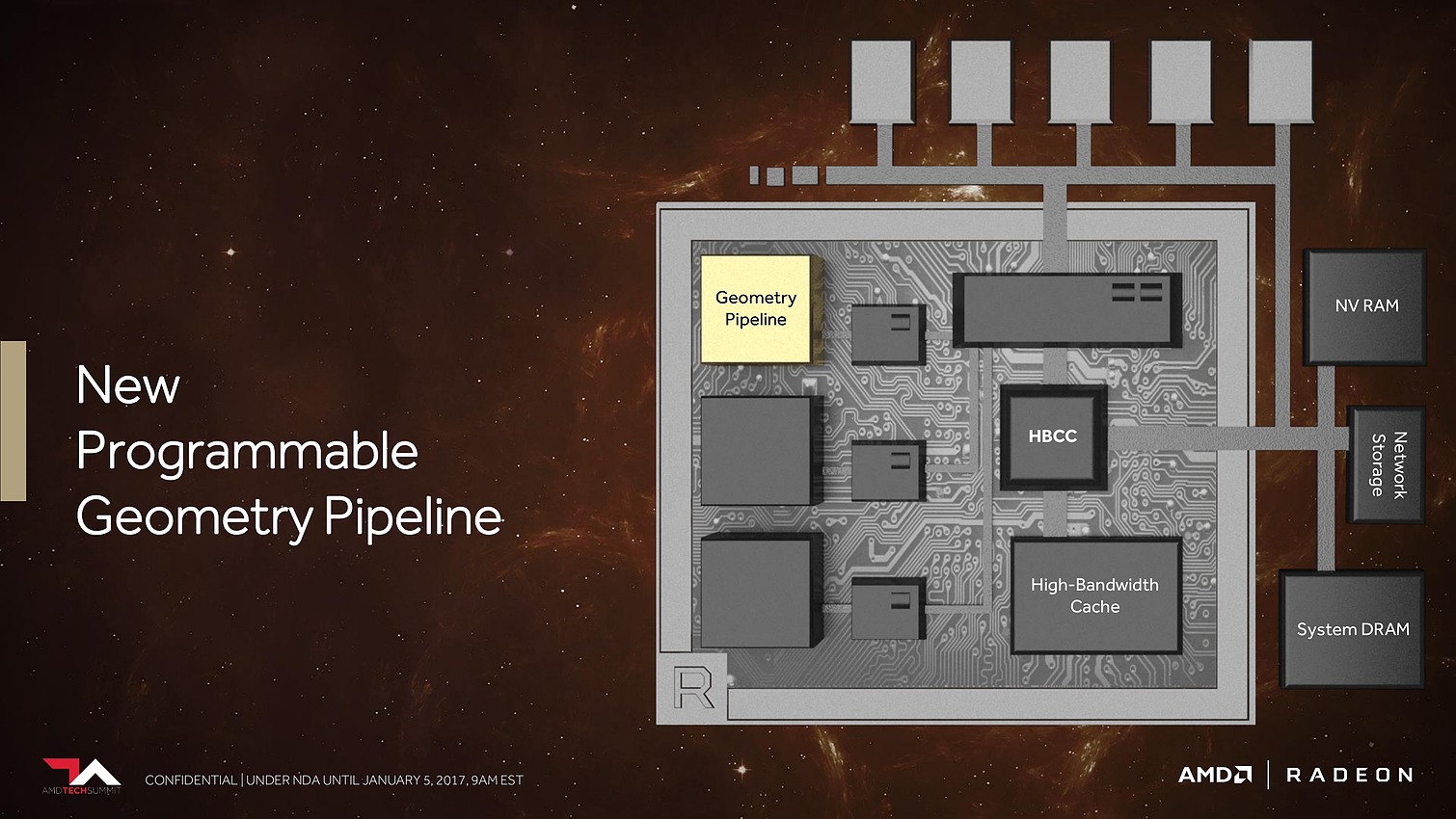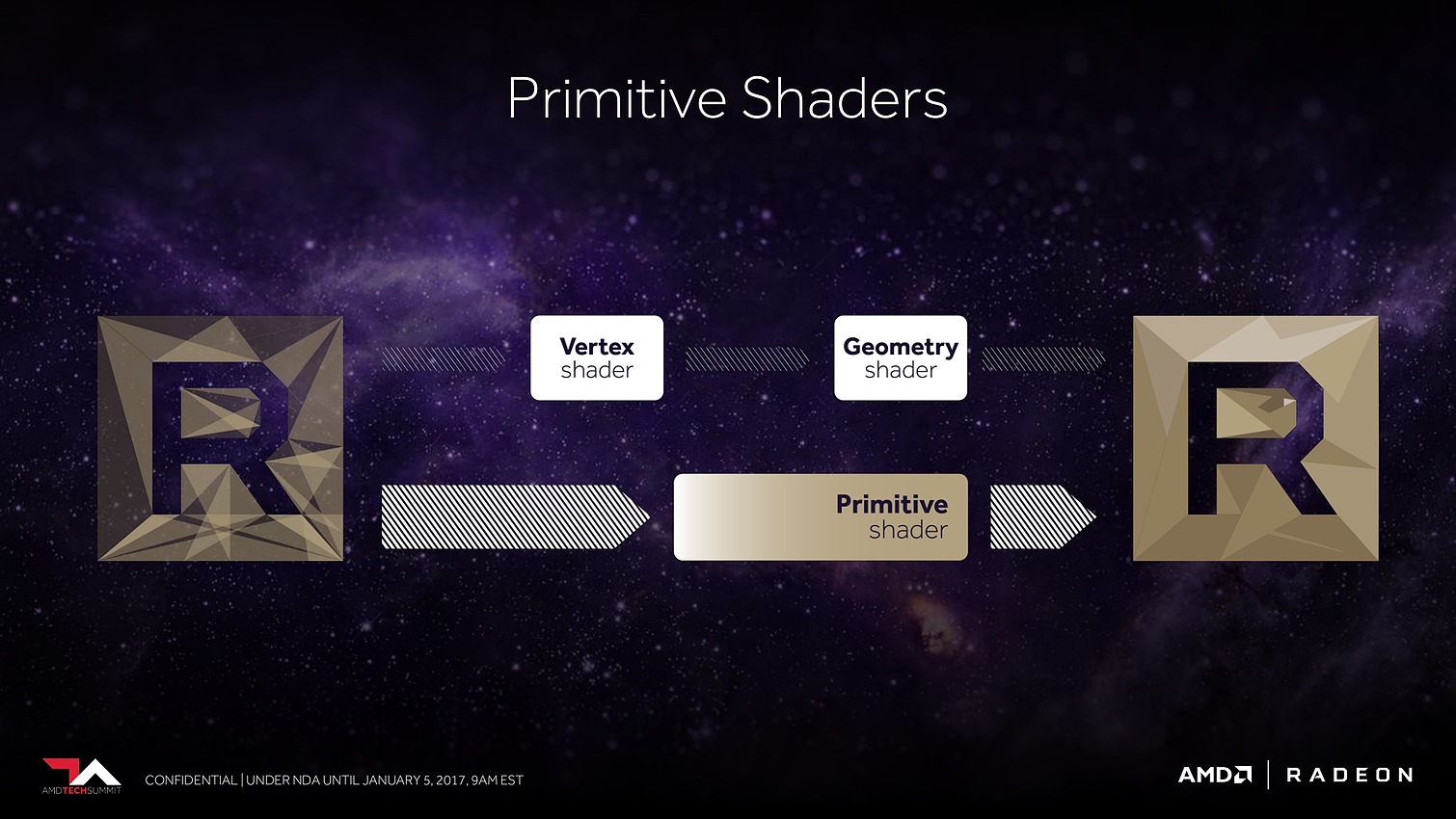 Ensuite, AMD proposera aux développeurs un nouveau type de shaders, les Primitive Shaders qui permettront de remplacer les Vertex Shaders et les Geometry Shaders. Nous ne savons pas exactement comment tout cela fonctionnera et sera exposé, mais cela devrait permettre de faciliter l'implémentation de pipelines de rendu personnalisés. AMD indique par ailleurs qu'ils permettront de booster le taux d'éjection des primitives mais nous ne savons pas si cela correspond au débit de 11 triangles par cycle noté ci-dessus ou si ce gain se fera en complément.