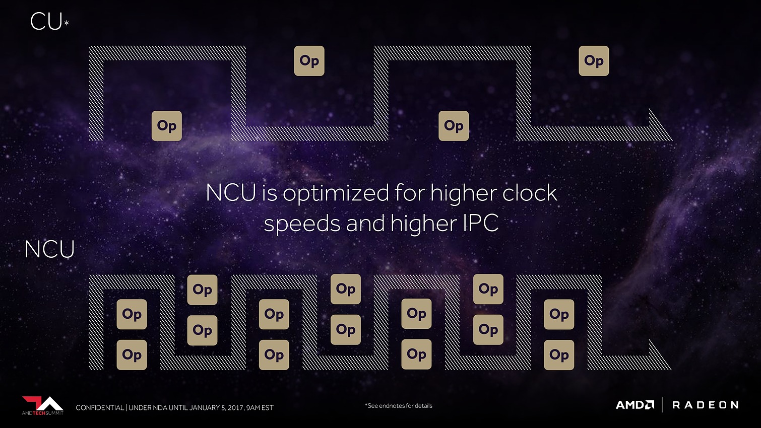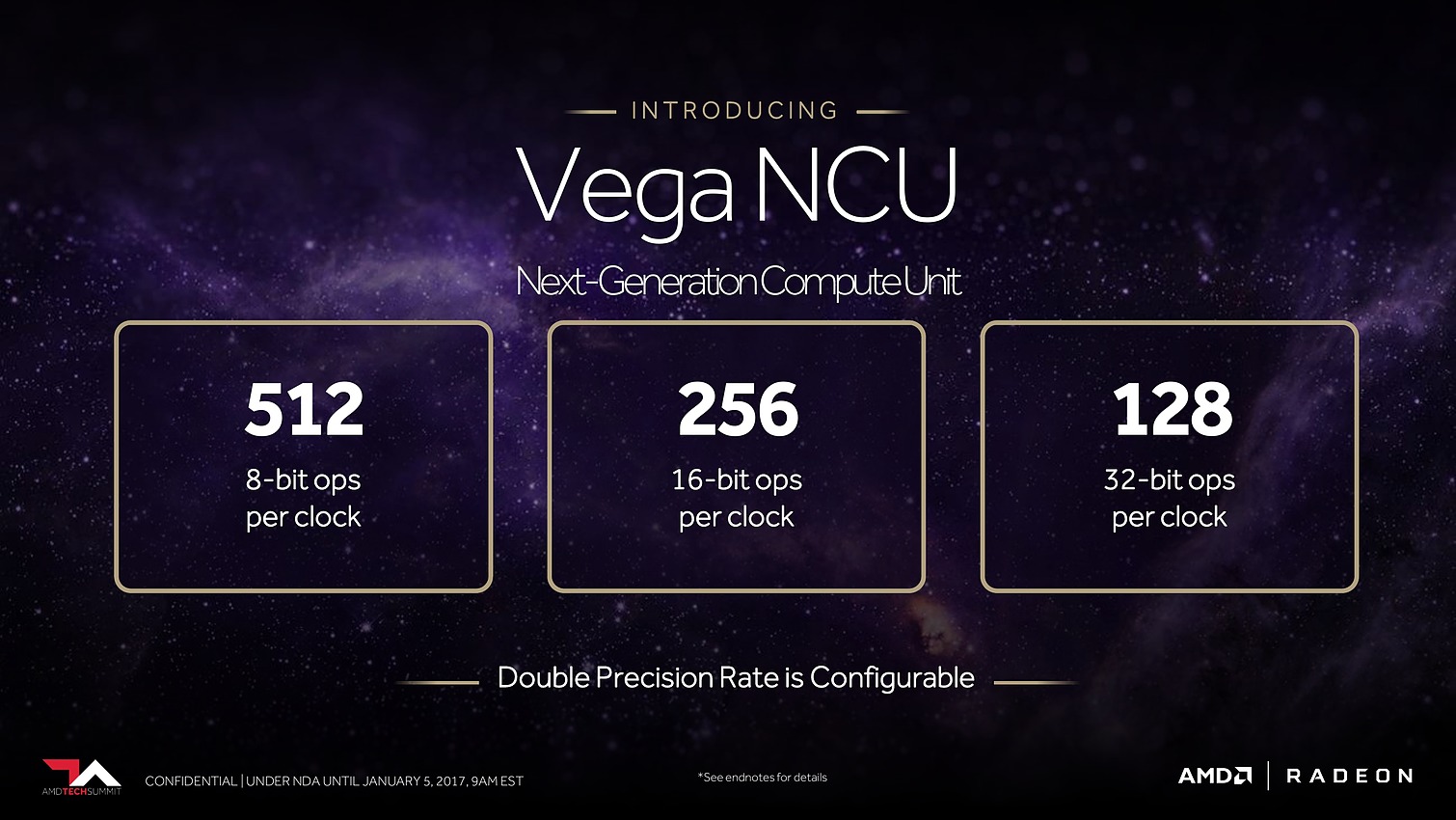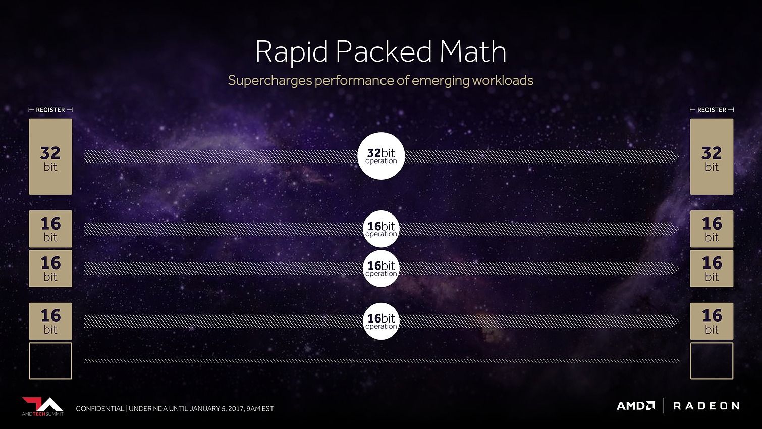 Parmi les informations dévoilées par AMD, notons l'exploitation de NCU (New Compute Units ?) avec support du packed math. Cette approche consiste à doubler la puissance de calcul en FP16 en modifiant les SIMD FP32 pour leur faire traiter des vecteurs 2D en FP16. C'est également ce que fait Nvidia avec le GP100 du Tesla P100 mais également sur ses derniers GPU intégrés aux SoC Tegra. Le FP16 peut être utile dans le cadre du GPU computing mais également dans celui du jeu vidéo lorsque la précision FP32 n'est pas nécessaire.