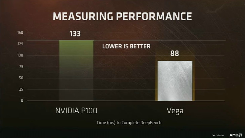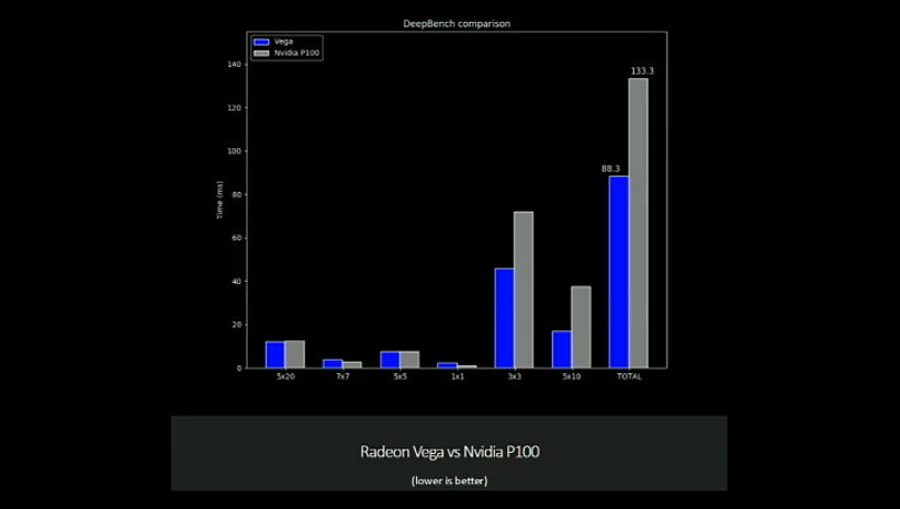 Nous avons droit à une première démonstration sous DeepBench avec un GPU Vega capable de surpasser le GP100 actuel de Nvidia de +/- 50%. Raja Koduri insiste cependant sur le fait que le but de la démonstration est avant tout de situer AMD sur la carte du deep learning et pas de se focaliser sur la confrontation avec Nvidia qui vient d'ailleurs d'annoncer le successeur du GP100. Par ailleurs, c'est toute une plateforme dédiée au deep learning que pourra offrir AMD avec Naples, Vega et son écosystème logiciel ROCm qui s'enrichit progressivement.