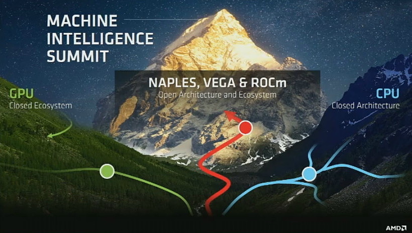 Après avoir fait le tour des marchés potentiels sur lesquels AMD va pouvoir revenir grâce à cette nouvelle génération de GPU, et après avoir rappelé les quelques points d'architectures dévoilés en janvier, Raja Koduri a voulu s'attarder sur l'apprentissage machine (ou deep learning) qui est un domaine prioritaire pour AMD. C'est d'autant plus le cas qu'il intéresse particulièrement les investisseurs présents dans l'auditoire.