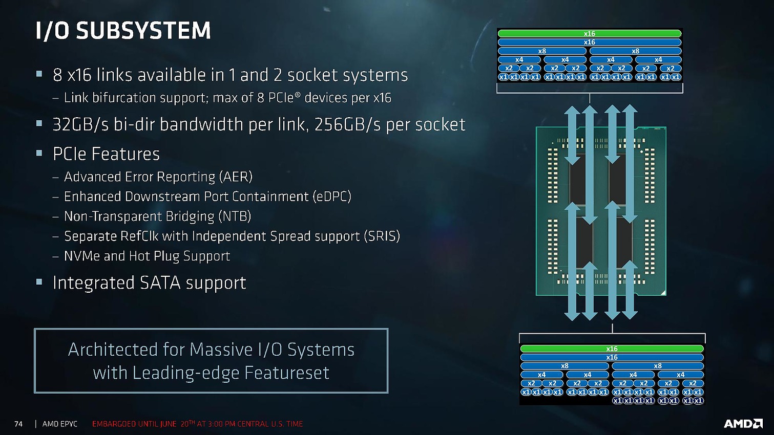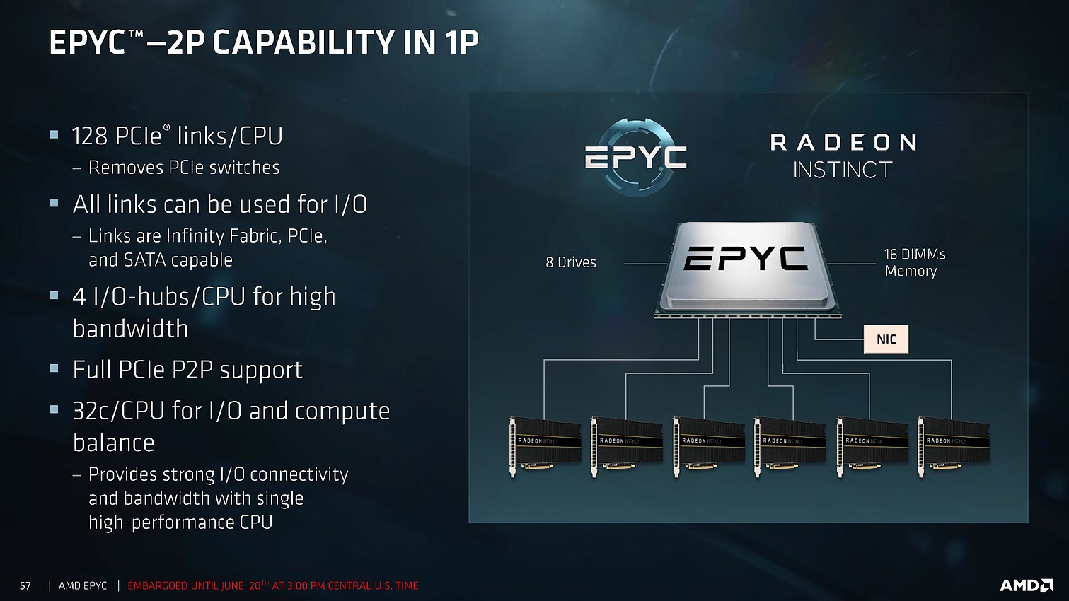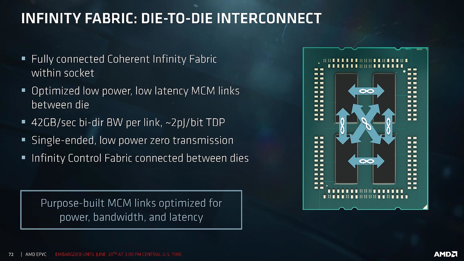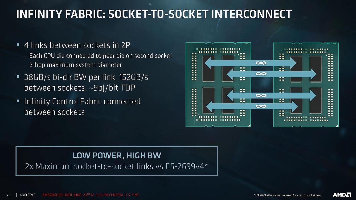 Chaque EPYC prend place au sein de l'énorme Socket LGA SP3r2 à 4094 contacts, et sous l'IHS on trouve 4 dies Zeppelin déjà utilisés pour Ryzen. Chacun de ses die est interconnecté aux 3 autres via des liens Infinity Fabric offrant une bande passante de 21 Go/s dans chaque sens. La connexion entre les Socket utilise 64 des 128 lignes PCIe qui sont alors utilisées en mode Infinity Fabric, les 4 liens atteignent une bande passante cumulée de 76 Go/s dans chaque sens, au-dessus des 64 Go/s permis en PCIe Gen3.