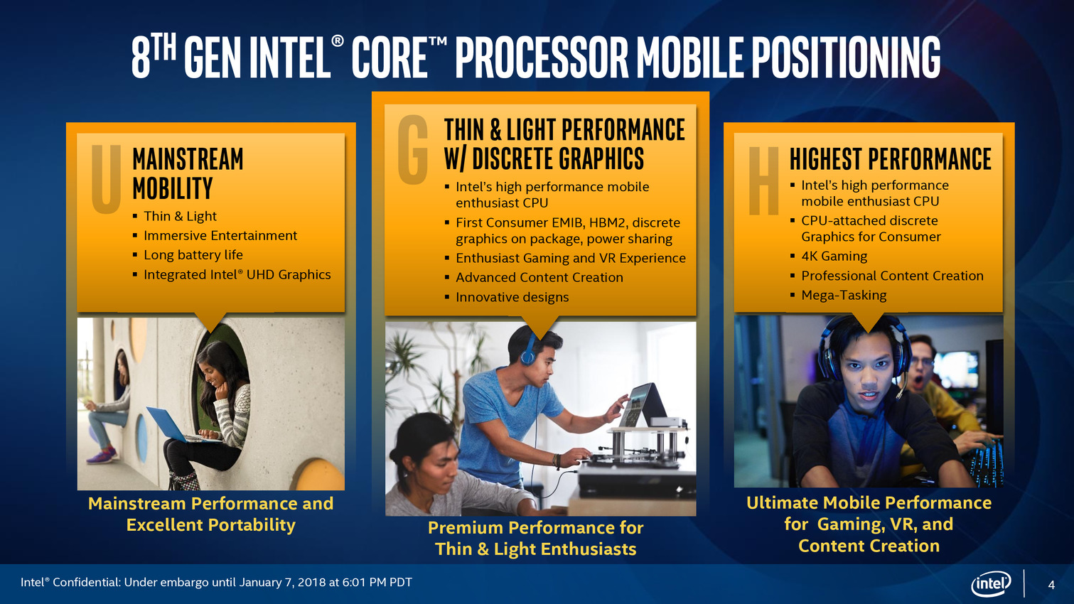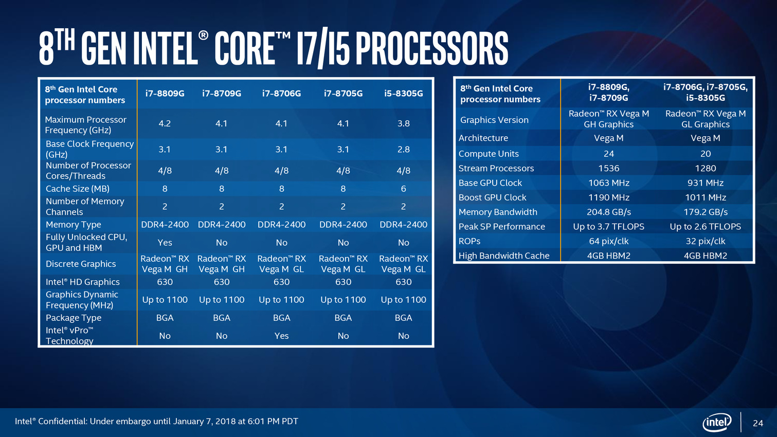 Cinq modèles sont lancés aujourd'hui, les Core i7-8809G, i7-8709G, i7-8706G, i7-8705G et i5-8305G (!). En pratique, seuls les deux plus gros Core i7 sont équipés du GPU Vega en version GH.
