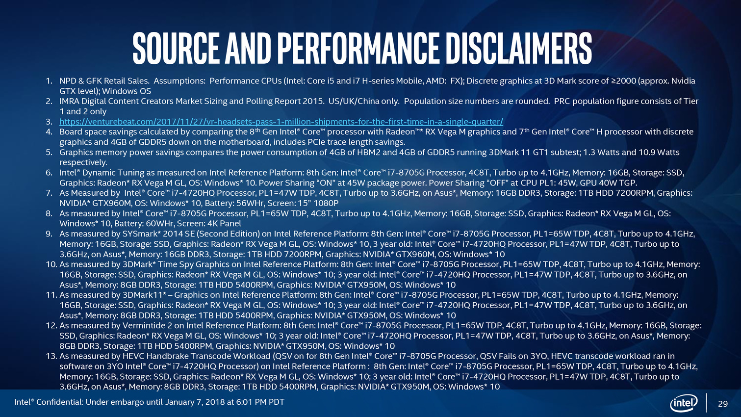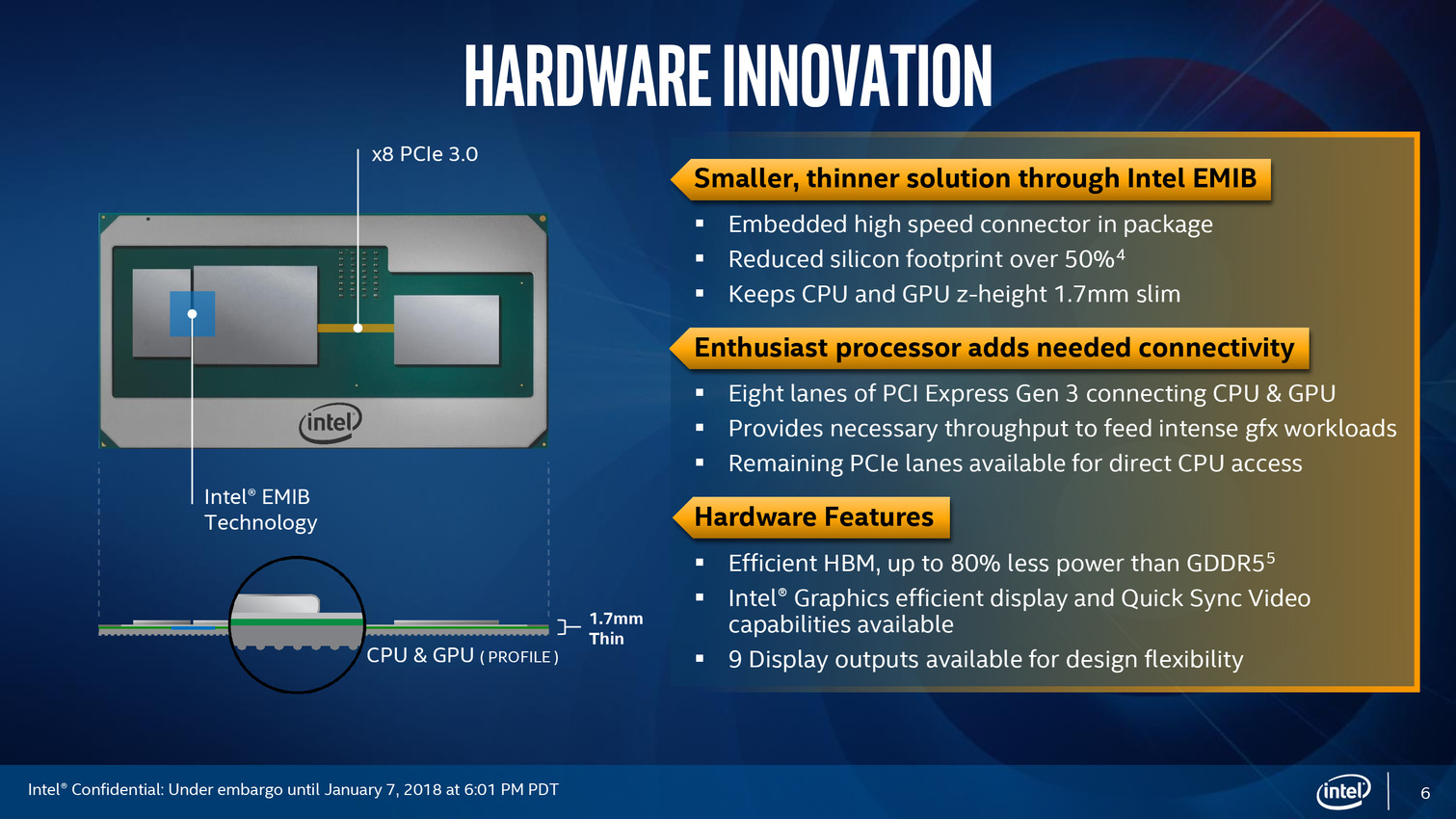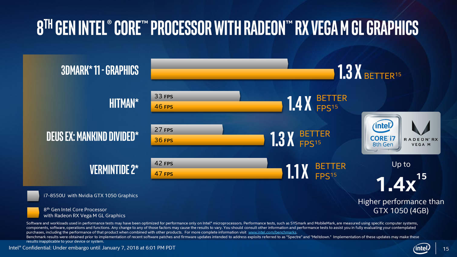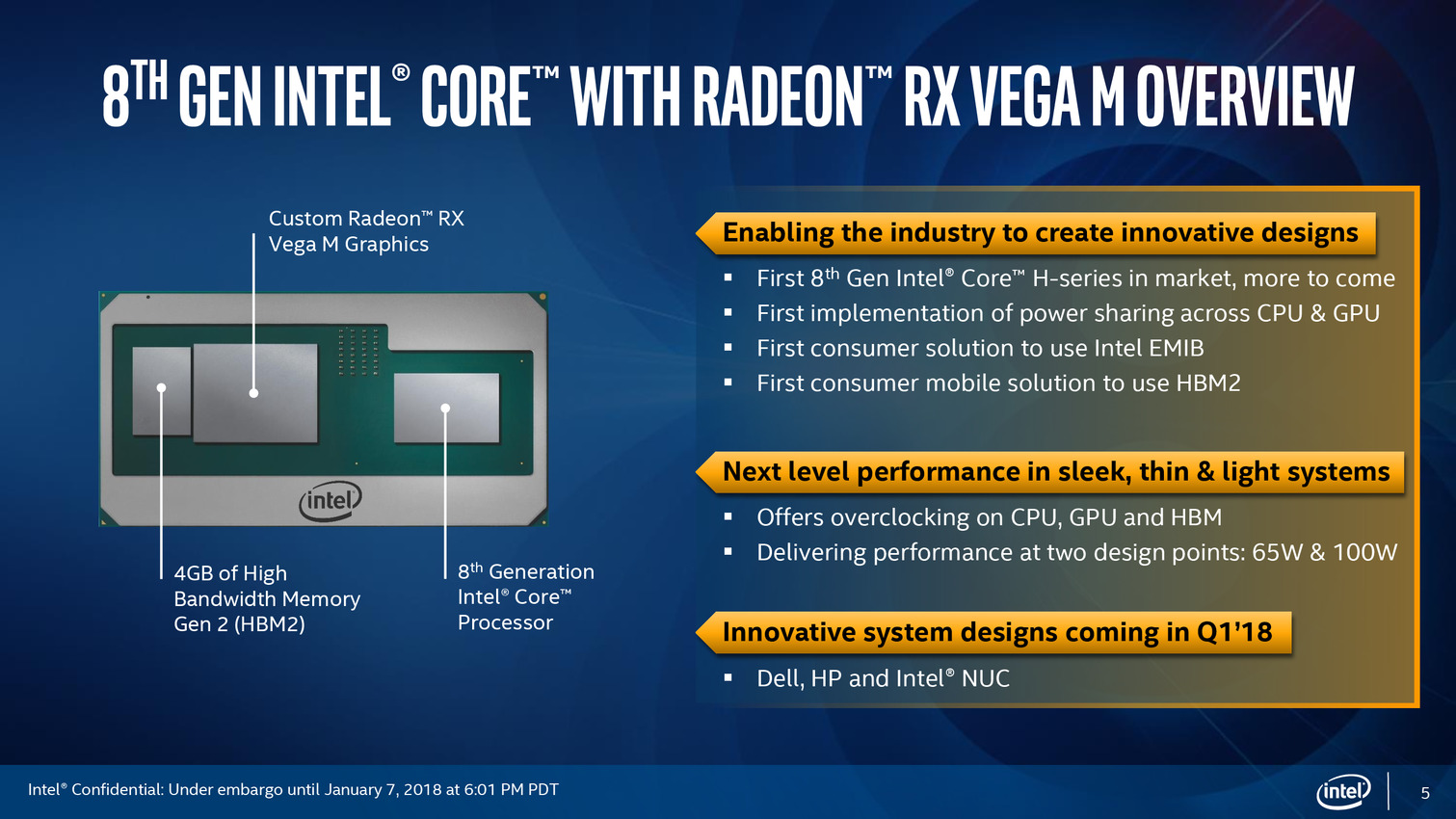Après une annonce assez avare en détails en novembre dernier, Intel profite du CES pour lancer officiellement ses processeurs "Core de 8ème génération avec Radeon RX Vega M", que l'on connaît surtout sous le nom de Kaby Lake-G. On vous rappellera que les RX Vega sont des GPU AMD, Intel évitant soigneusement de le mentionner dans sa communication !
