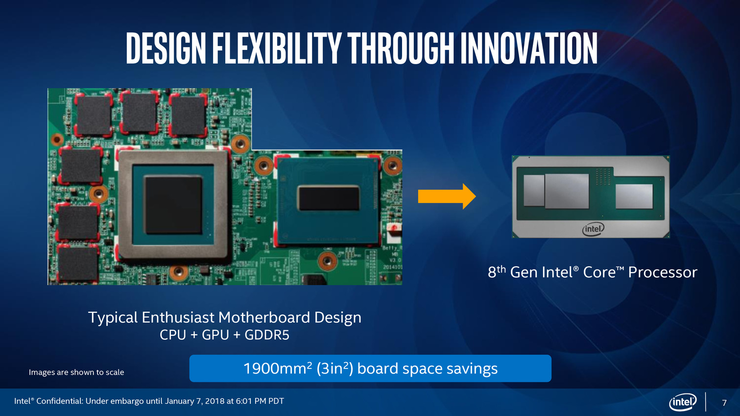 Intel met en avant le gain de place pour l'intégration qui pourrait se traduire en théorie par des designs plus compacts (le constructeur indique que la hauteur moyenne des modèles H avec GPU est de 26mm), même si étant donné le TDP probable de ces solutions, la batterie dictera en grande partie le design de ces portables !